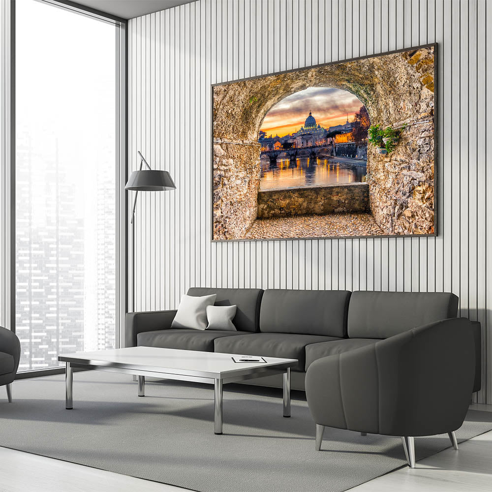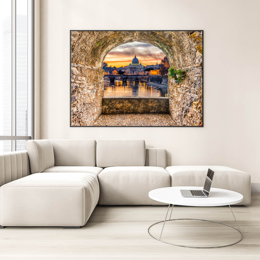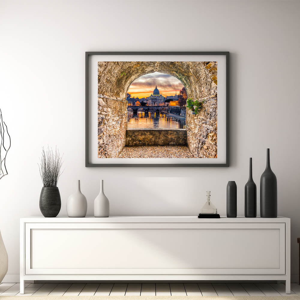 Capture the breathtaking beauty of Italian Scenery Art with this stunning depiction of St. Peter's Basilica at sunset. Framed by a rustic stone archway, this Rome Canvas Print offers a picturesque view of the Tiber River and the iconic dome of the Basilica. The vibrant colors of the sunset reflect in the water, creating a peaceful yet awe-inspiring scene. Perfect for those who appreciate Rome Landmarks and Historic Rome Art, this artwork brings the Eternal City to life in your space.