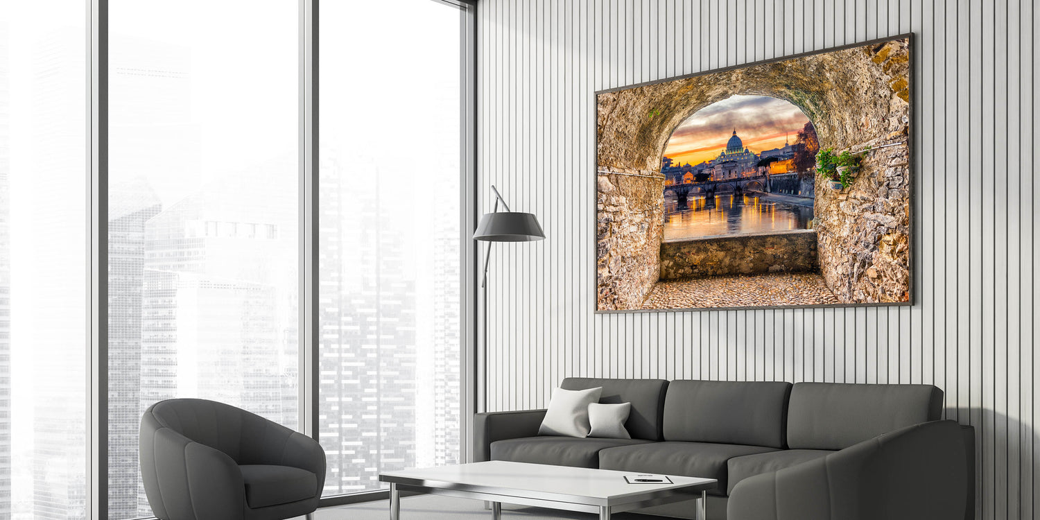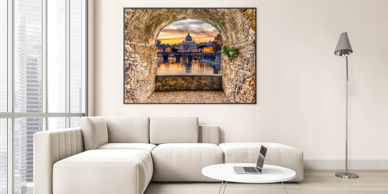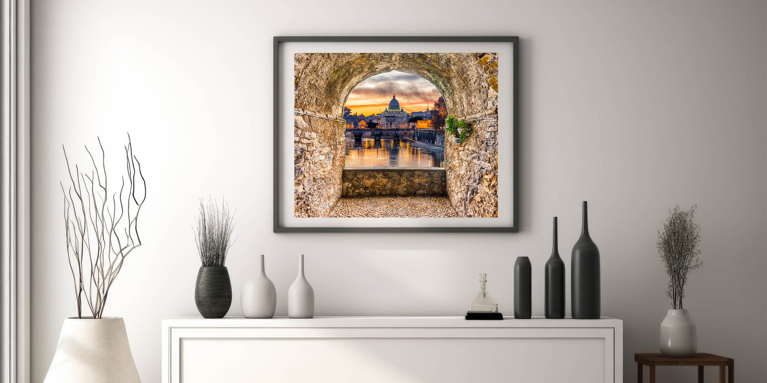 Capture the breathtaking beauty of Italian Scenery Art with this stunning depiction of St. Peter's Basilica at sunset. Framed by a rustic stone archway, this Rome Canvas Print offers a picturesque view of the Tiber River and the iconic dome of the Basilica. The vibrant colors of the sunset reflect in the water, creating a peaceful yet awe-inspiring scene. Perfect for those who appreciate Rome Landmarks and Historic Rome Art, this artwork brings the Eternal City to life in your space.