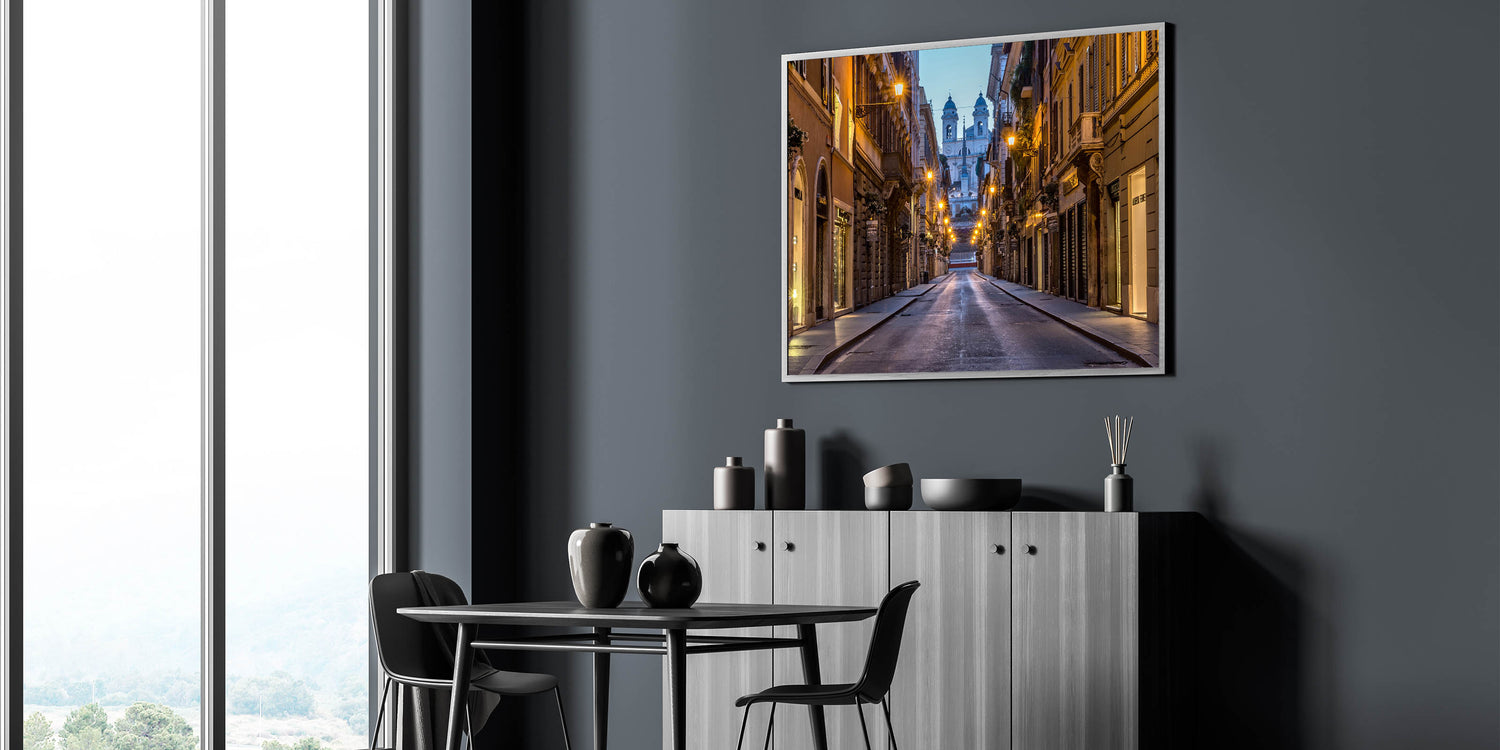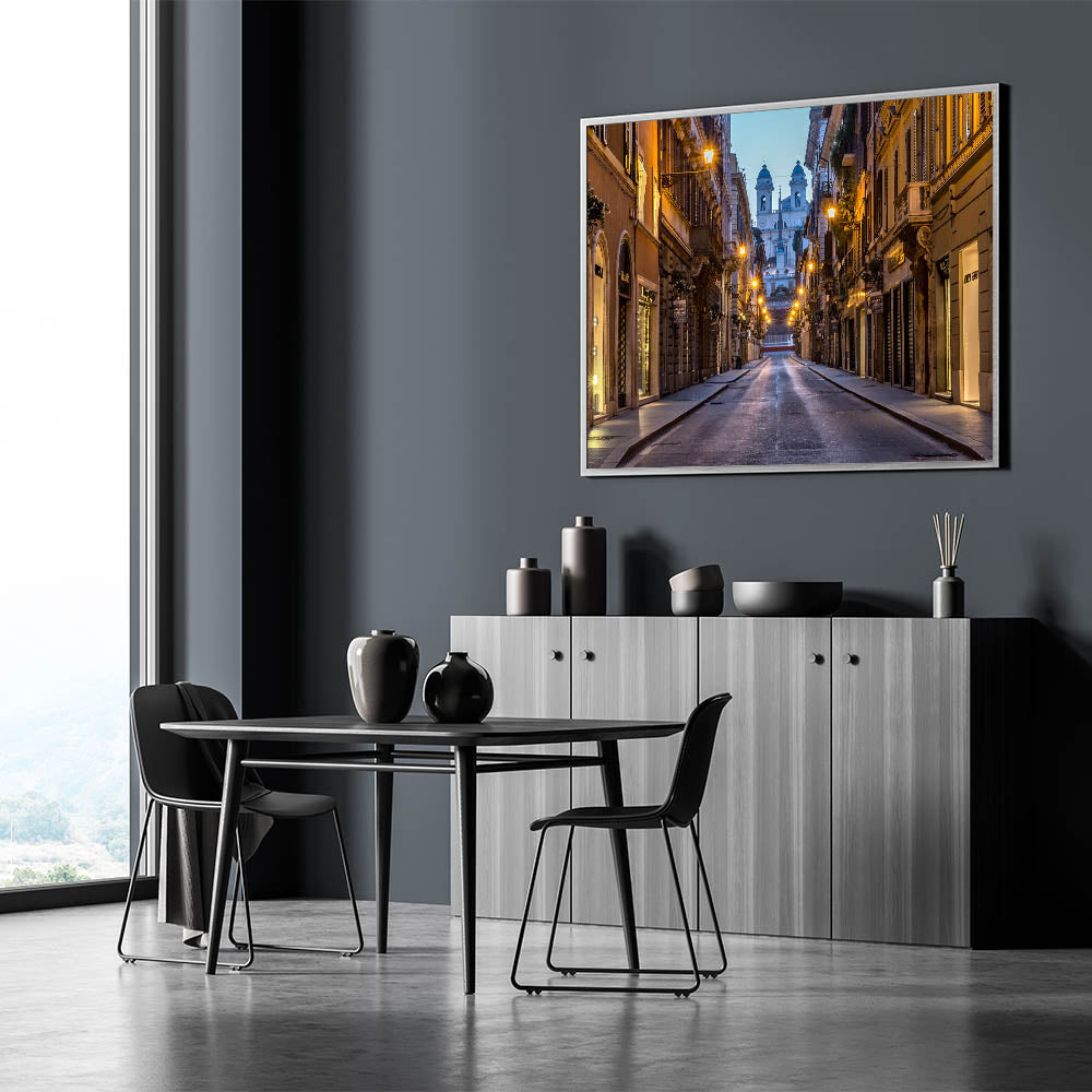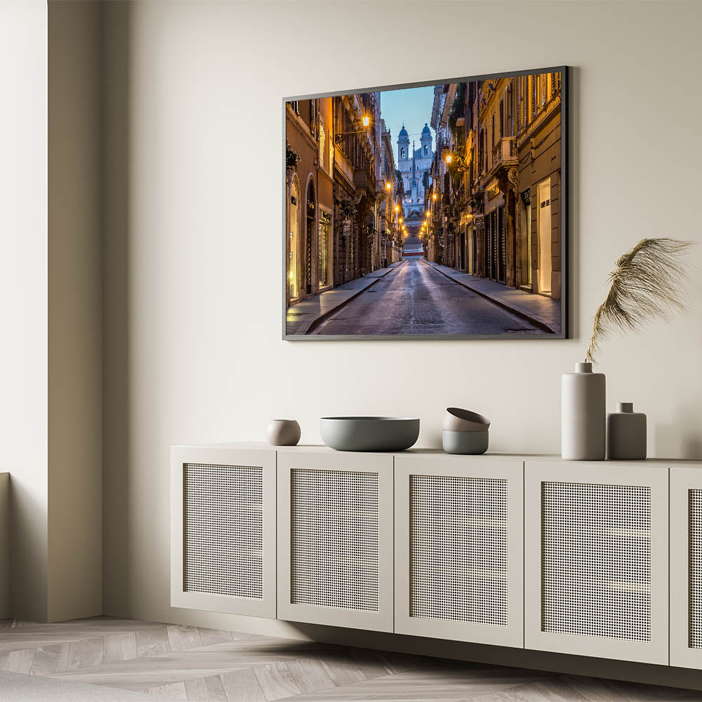 Enhance your space with this captivating Rome canvas print featuring the Spanish Steps at dawn. This beautifully detailed photograph captures the quiet elegance of one of Rome's most famous landmarks, bathed in the soft morning light. The warm glow of streetlights and the iconic architecture make this piece a must-have for lovers of Italian scenery and Rome photography.