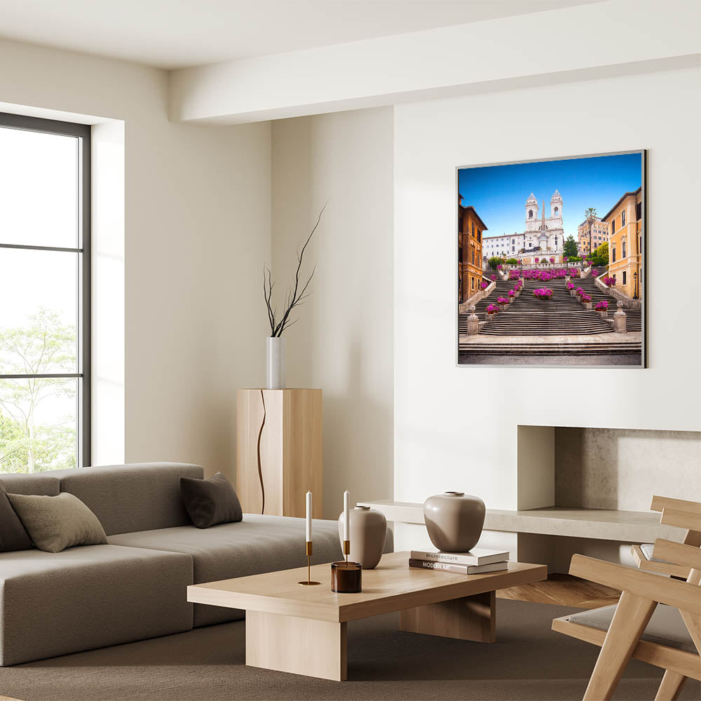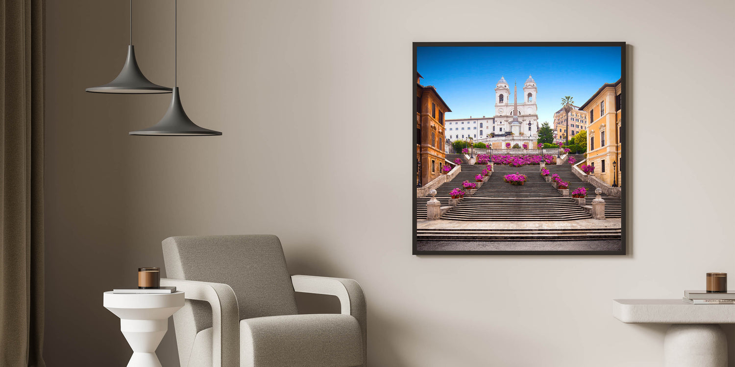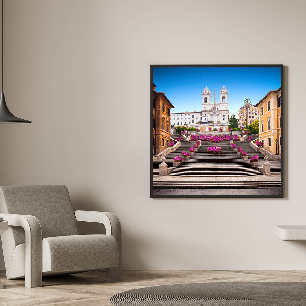Brighten your home with this vibrant canvas print of Rome's iconic Spanish Steps adorned with beautiful flowers. The stunning pink blooms set against the historic steps and brilliant blue sky create a lively and elegant scene that captures the charm and beauty of the Eternal City. This artwork is perfect for lovers of Italian scenery art and those who appreciate the timeless allure of Rome’s most famous landmarks.