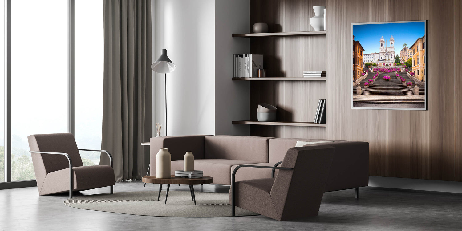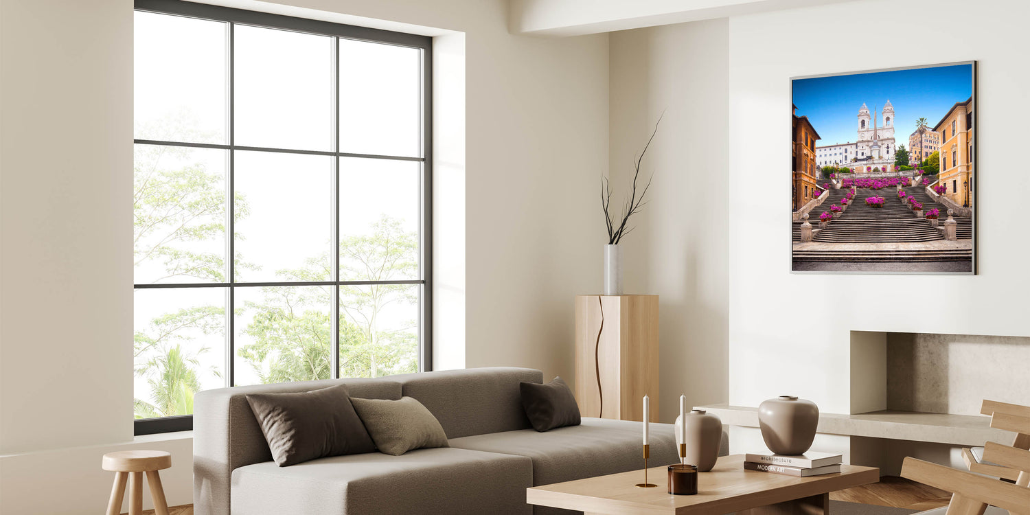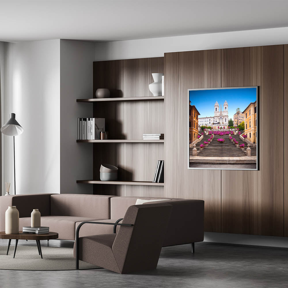 Brighten your home with this vibrant canvas print of Rome's iconic Spanish Steps adorned with beautiful flowers. The stunning pink blooms set against the historic steps and brilliant blue sky create a lively and elegant scene that captures the charm and beauty of the Eternal City. This artwork is perfect for lovers of Italian scenery art and those who appreciate the timeless allure of Rome’s most famous landmarks.