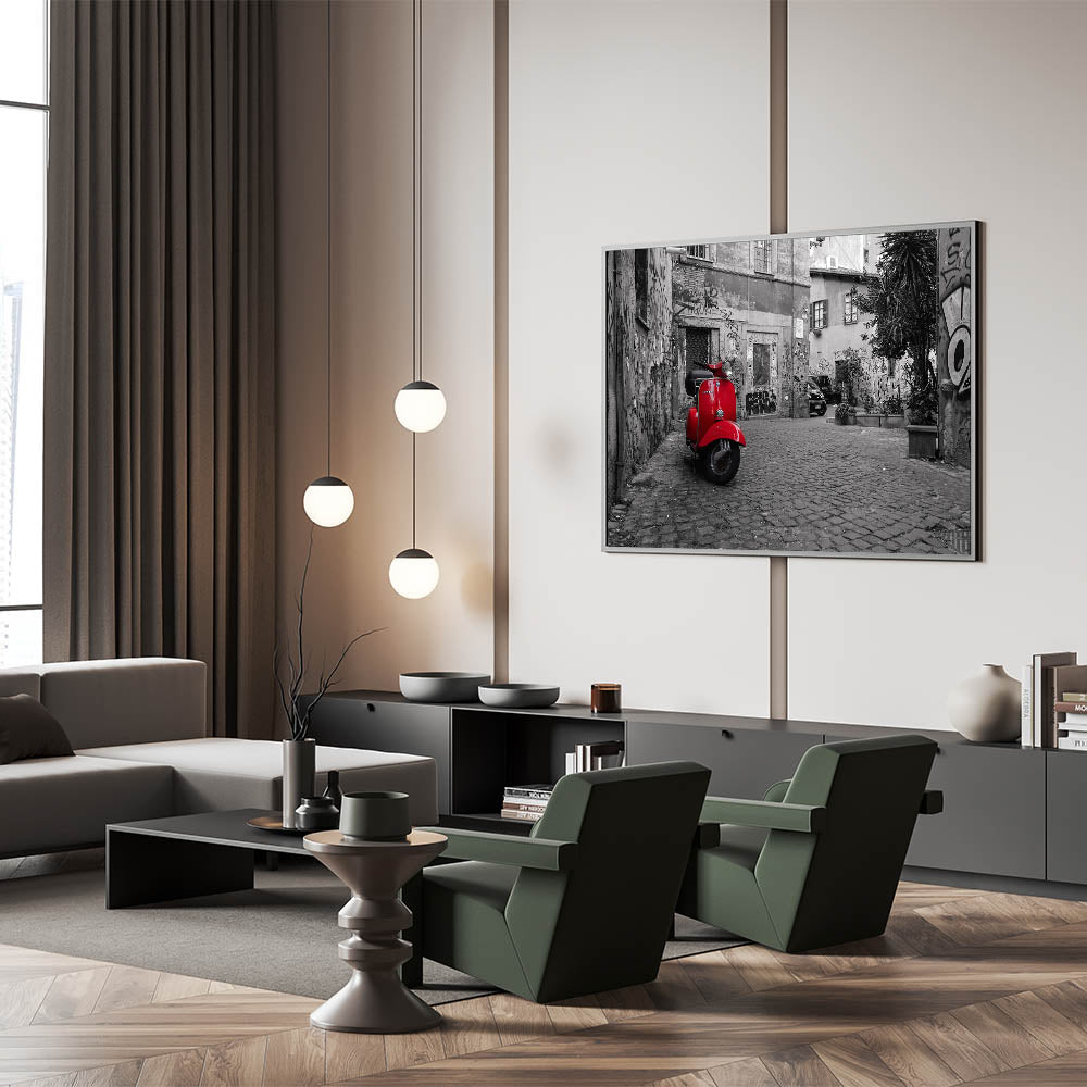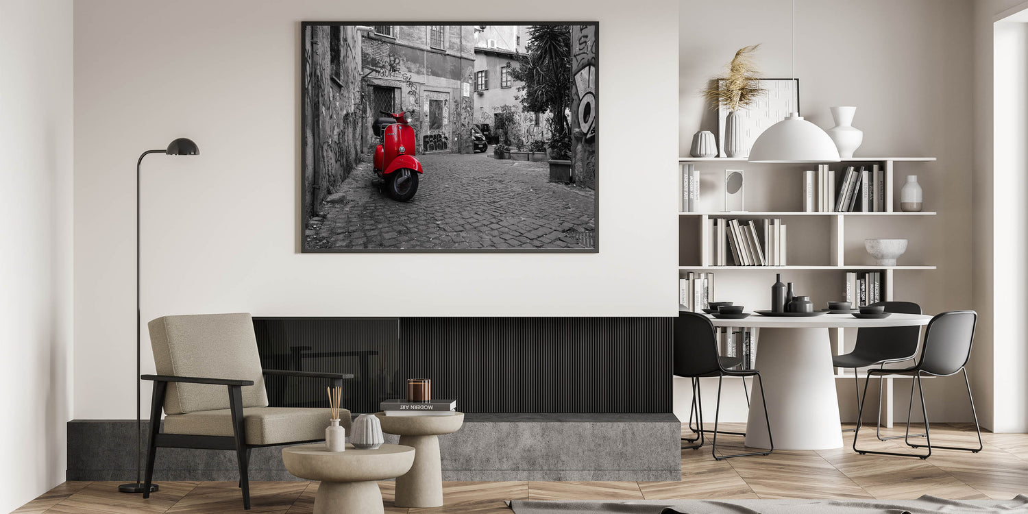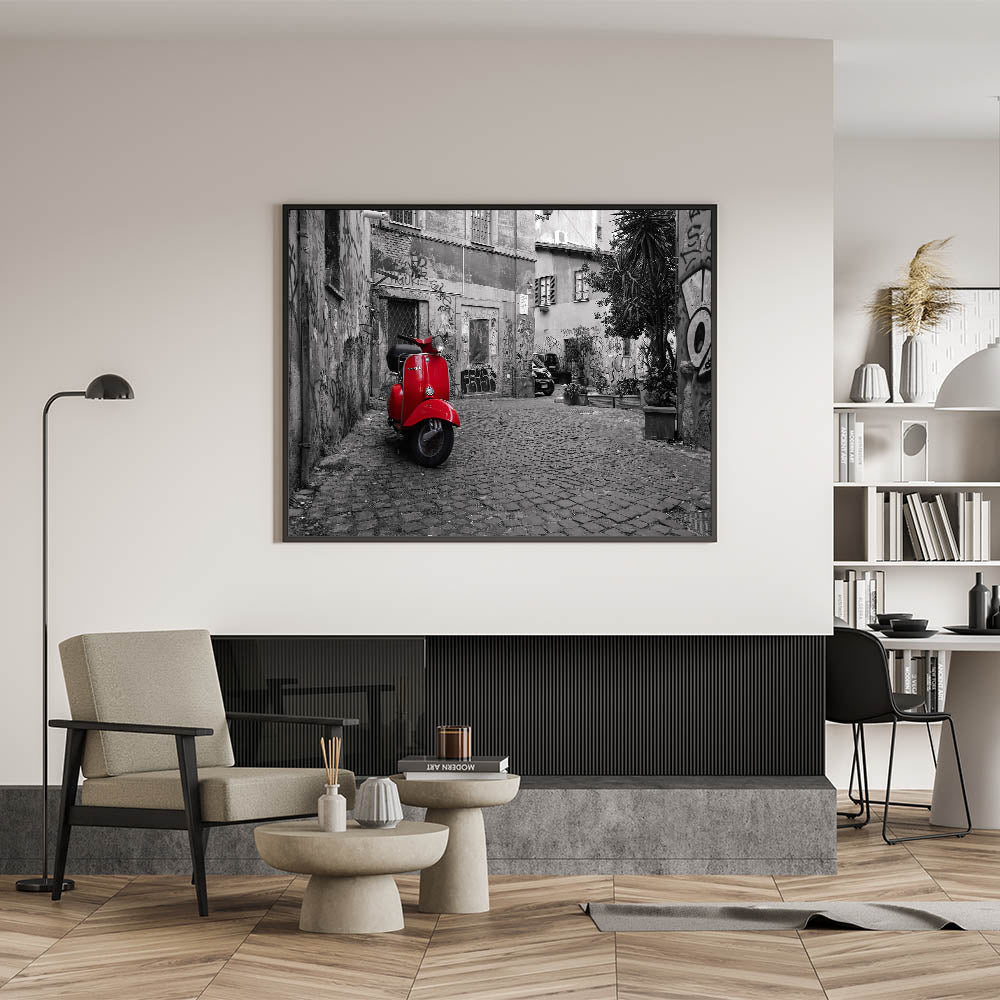 Bring a touch of Rome Cityscape to your space with this captivating canvas print featuring a vibrant red Vespa in the charming streets of Trastevere. The contrast between the black and white photography and the iconic red Vespa creates a striking visual that captures the essence of Rome’s urban charm. Perfect for lovers of Rome Wall Art and Italian architecture, this artwork embodies the spirit of Rome’s lively neighborhoods.