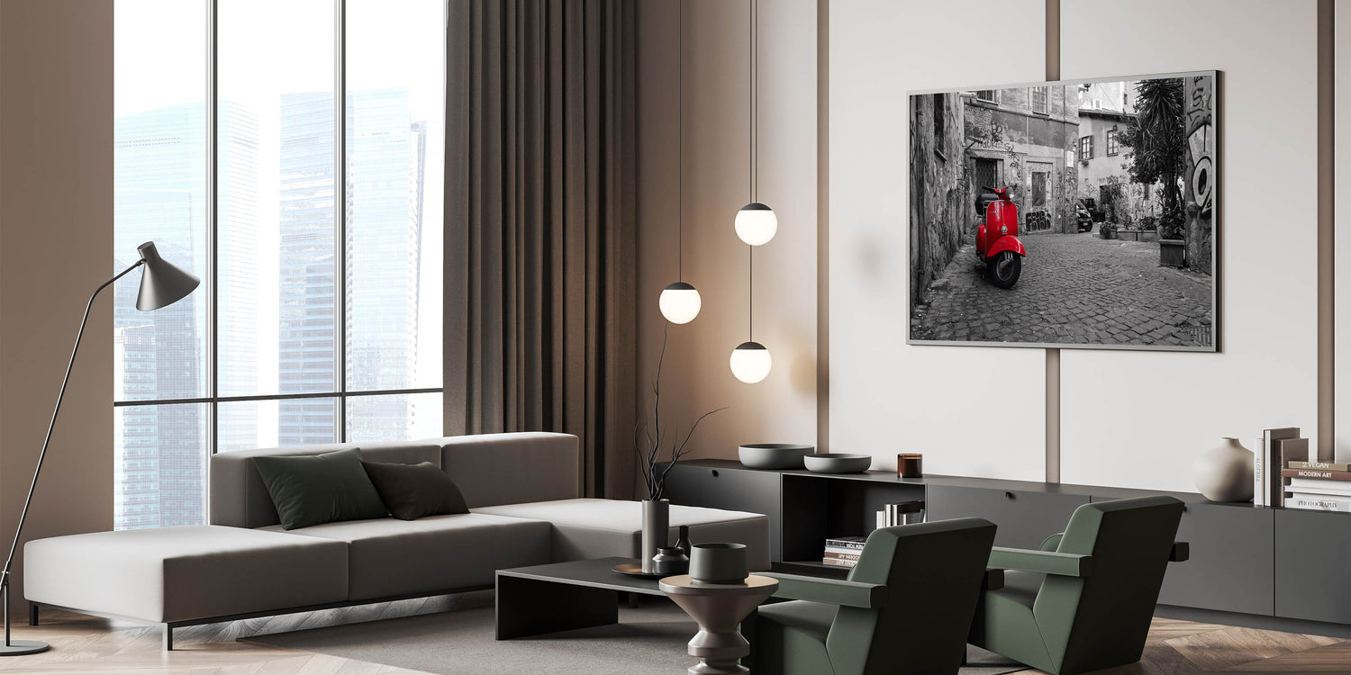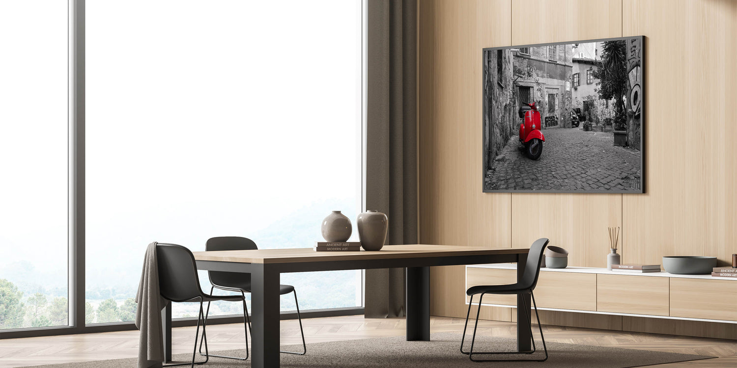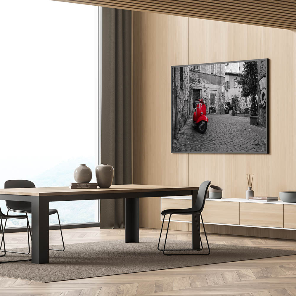 Bring a touch of Rome Cityscape to your space with this captivating canvas print featuring a vibrant red Vespa in the charming streets of Trastevere. The contrast between the black and white photography and the iconic red Vespa creates a striking visual that captures the essence of Rome’s urban charm. Perfect for lovers of Rome Wall Art and Italian architecture, this artwork embodies the spirit of Rome’s lively neighborhoods.
