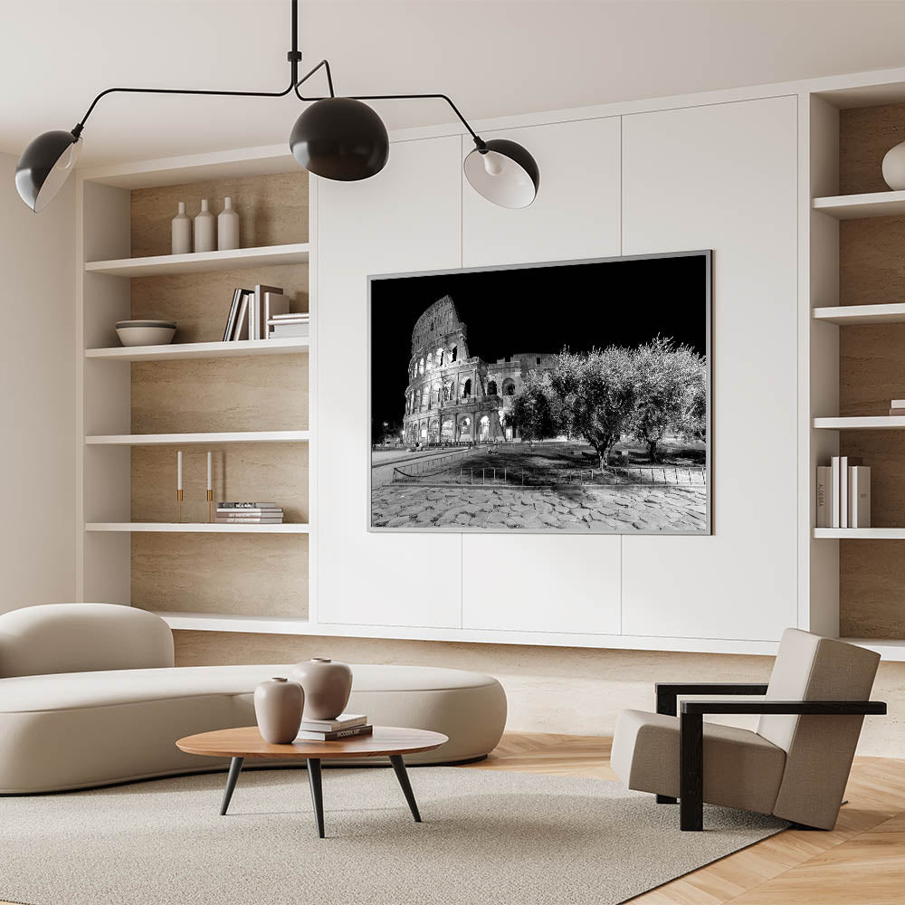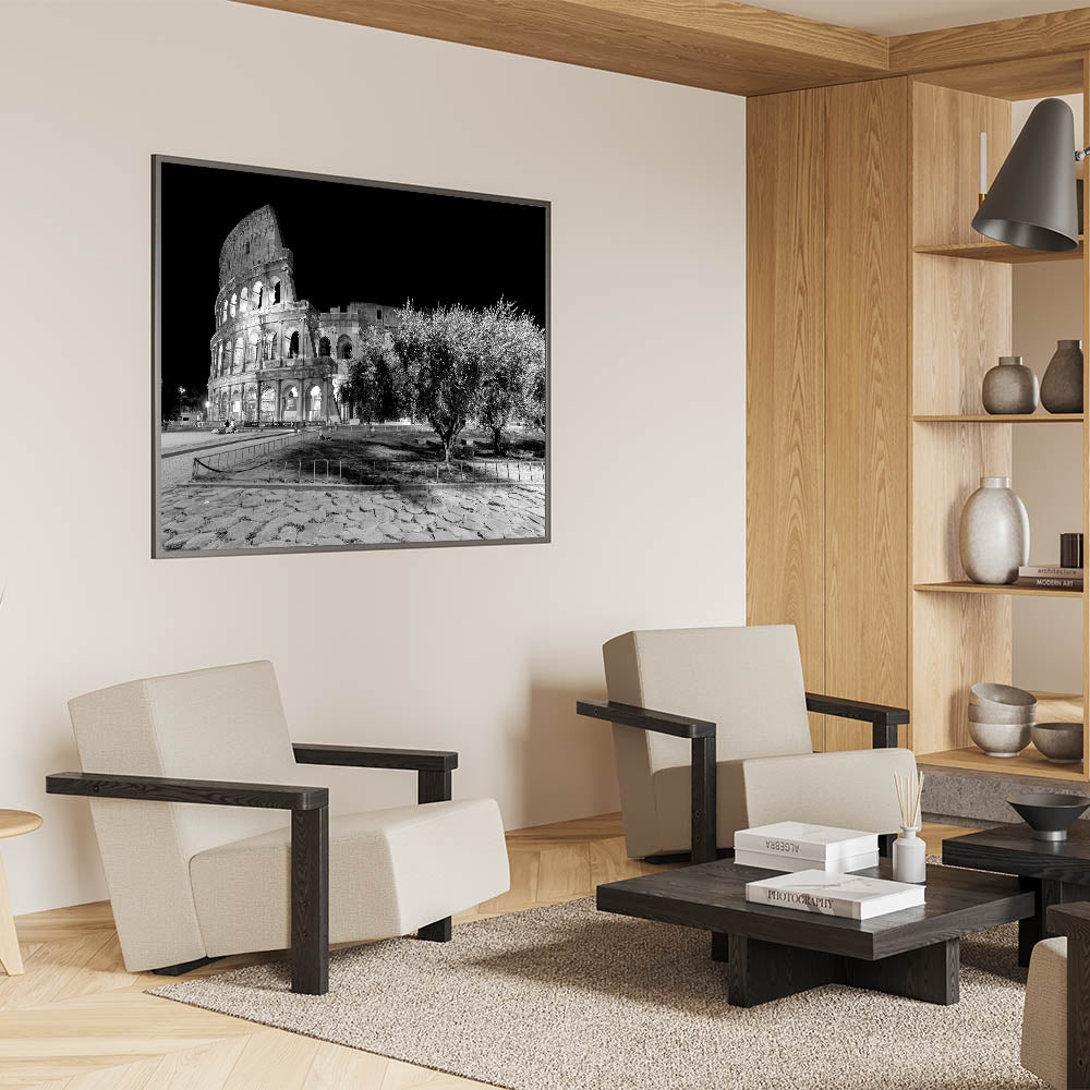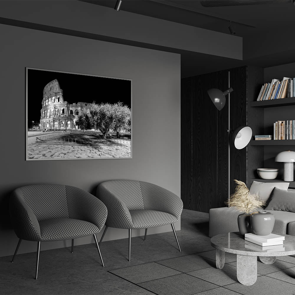 This captivating canvas print showcases the timeless beauty of Rome’s Colosseum at night. The stunning black-and-white photography highlights the architectural grandeur of one of Rome's most famous landmarks. The ancient stone structure stands against a stark black sky, offering a striking contrast that adds depth and drama to any room. Perfect for those who love Colosseum prints and Roman architecture.
