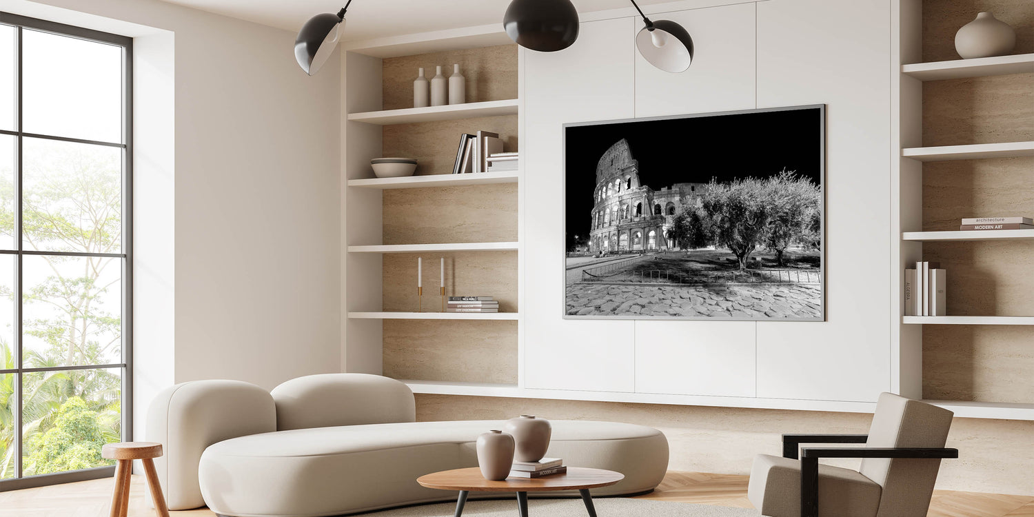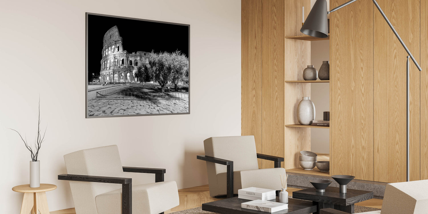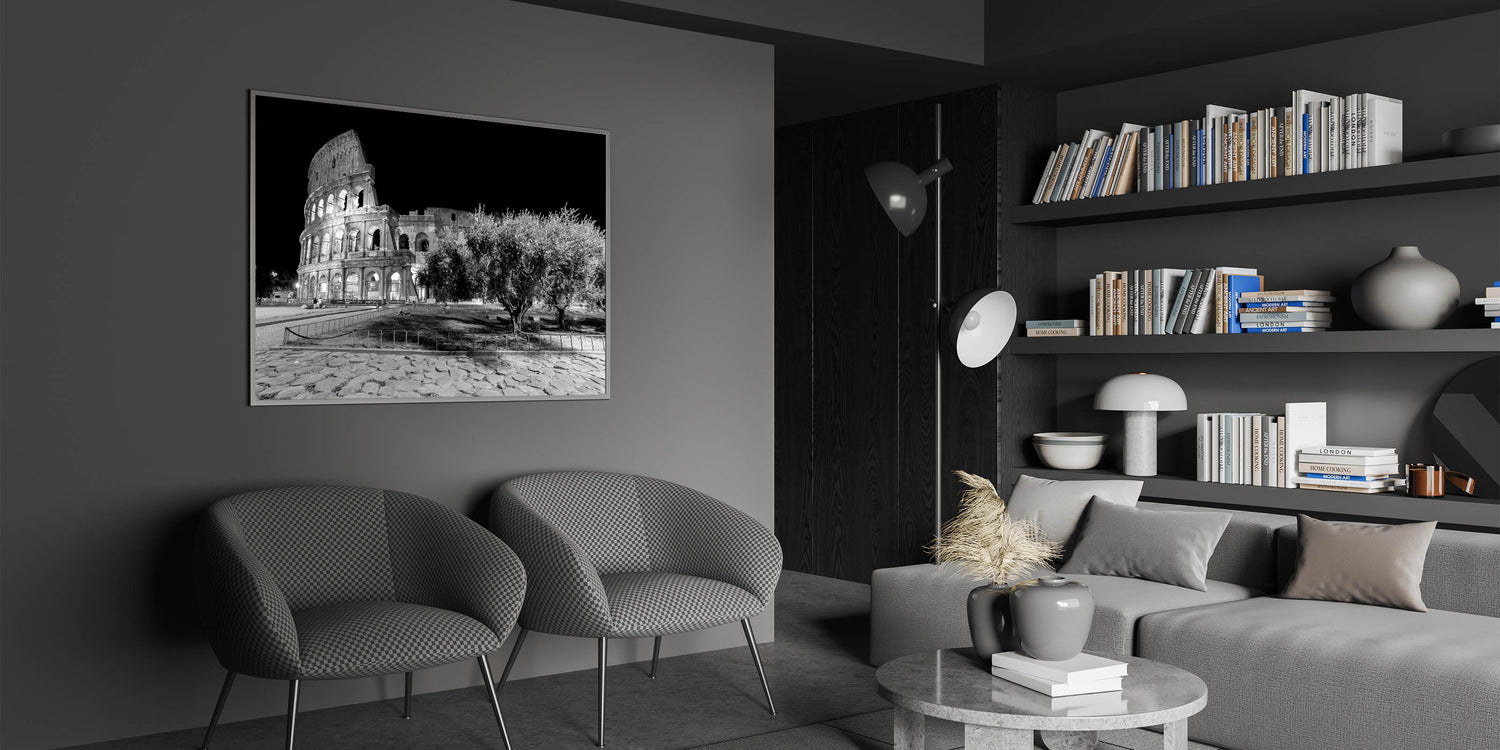 This captivating canvas print showcases the timeless beauty of Rome’s Colosseum at night. The stunning black-and-white photography highlights the architectural grandeur of one of Rome's most famous landmarks. The ancient stone structure stands against a stark black sky, offering a striking contrast that adds depth and drama to any room. Perfect for those who love Colosseum prints and Roman architecture.