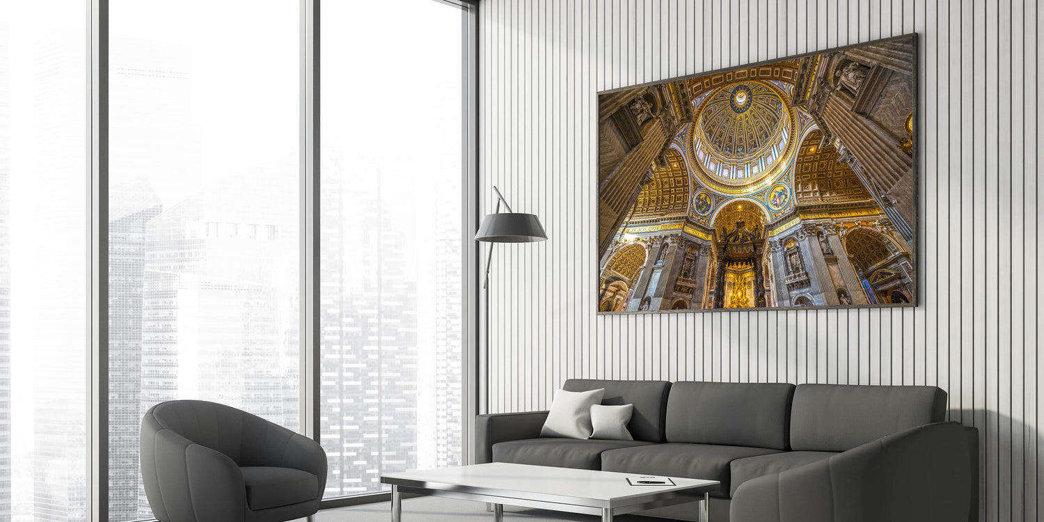 Elevate your space with this awe-inspiring piece of Rome Photography featuring the grand interior dome of St. Peter’s Basilica. This intricate Rome Canvas Print captures the magnificent architectural details and the rich artistic history of one of the world’s most iconic buildings. The dramatic upward perspective draws the eye toward the stunning artwork and geometric designs of the dome, showcasing the grandeur of Vatican City.