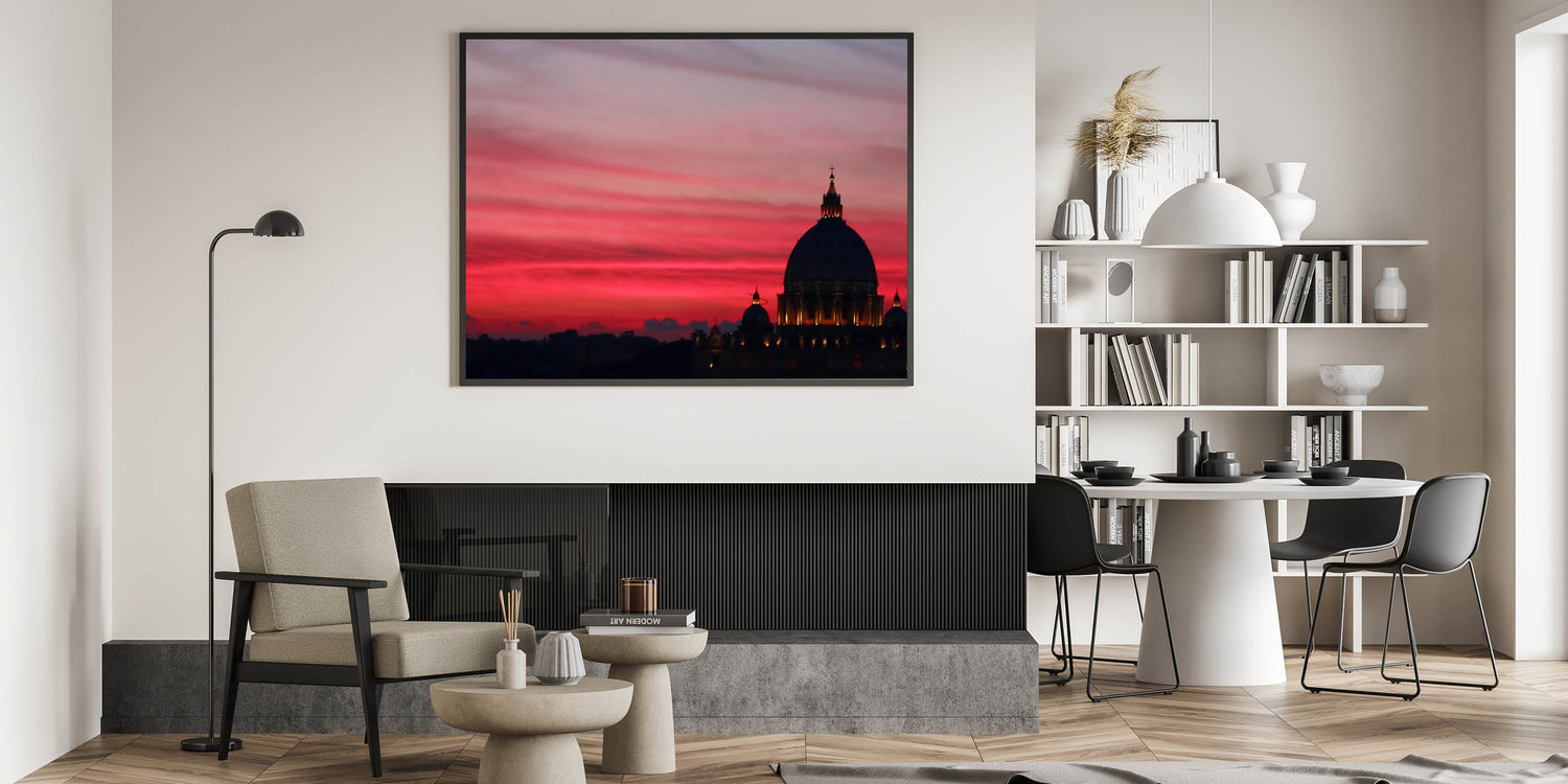 Bring the timeless beauty of Rome into your home with this stunning canvas print featuring St. Peter's Basilica at sunset. Captured in vivid detail, this artwork highlights the grandeur of one of Rome’s most iconic landmarks against a breathtaking pink and red sky. Ideal for lovers of Italian architecture and scenic art, this piece will instantly transform any living space.