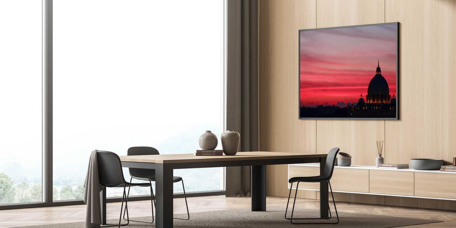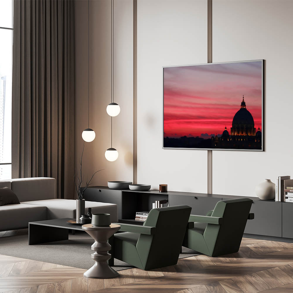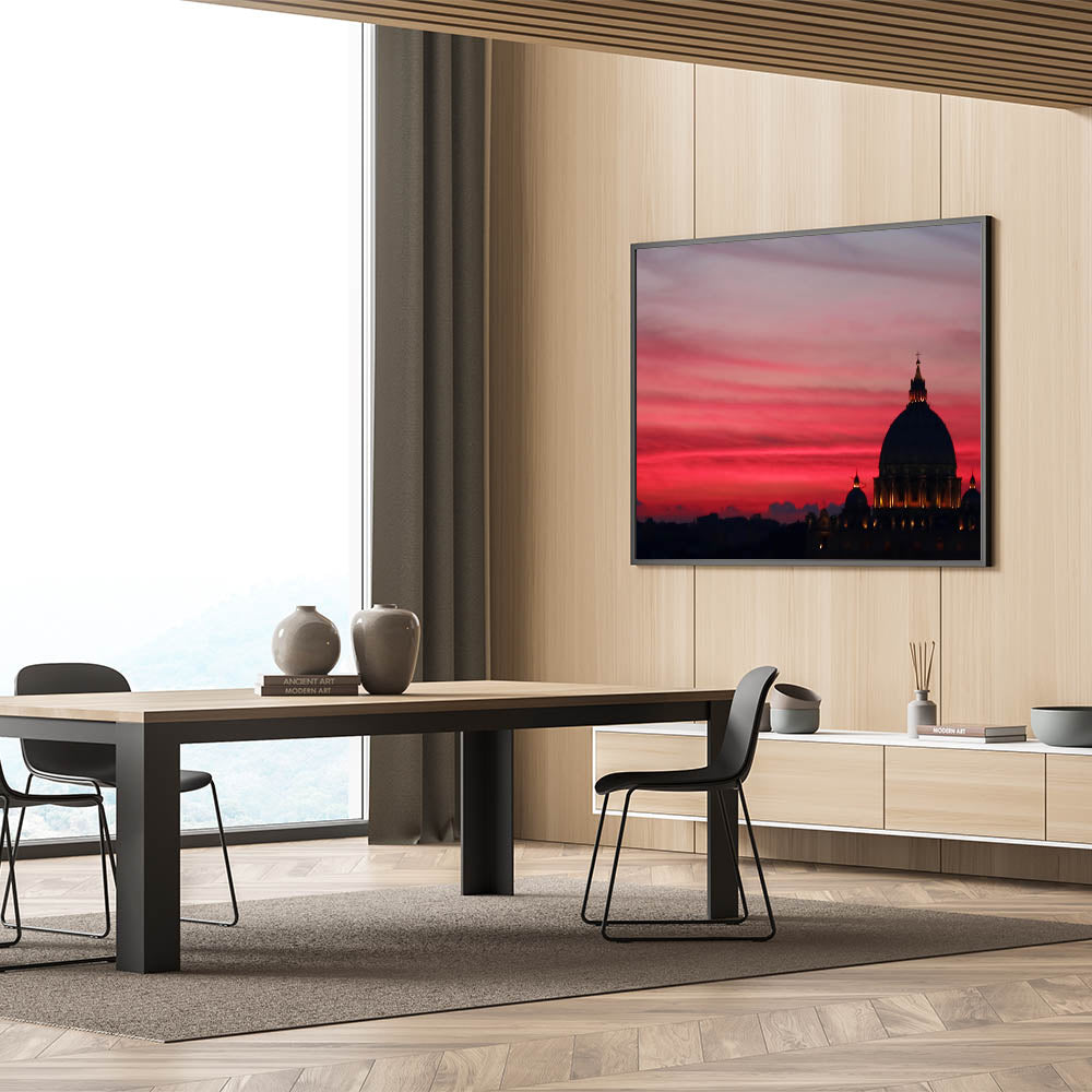 Whether you are decorating your home, office, or looking for a meaningful gift, this Rome cityscape captures the essence of Italian elegance and history. With its breathtaking sunset hues, this piece is sure to draw attention and admiration.