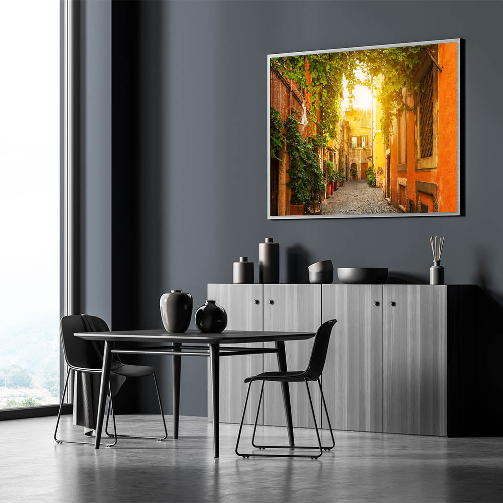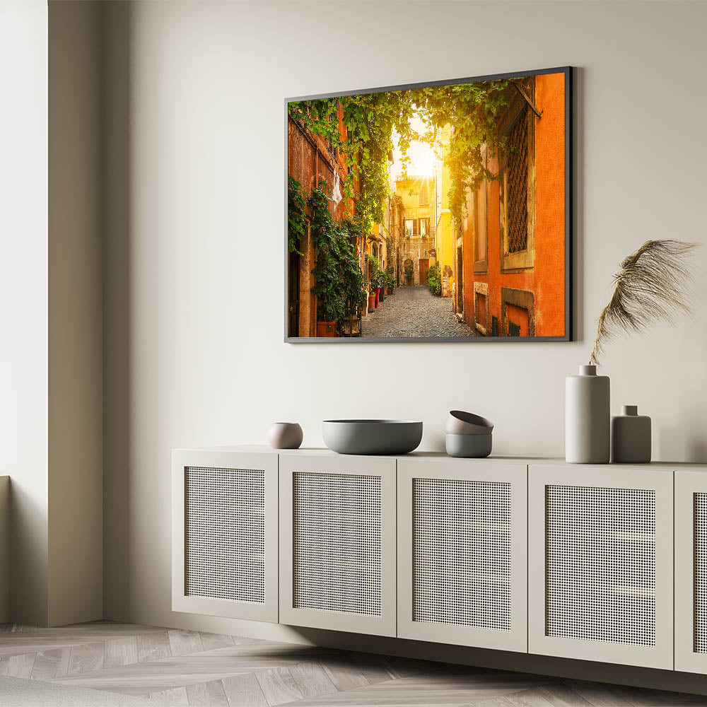 Brighten your space with this captivating canvas print of a sunlit alleyway in Rome’s Trastevere neighborhood. The warm hues of the buildings, bathed in the golden glow of the afternoon sun, create a peaceful and inviting atmosphere. The vibrant greenery climbing the rustic walls adds a touch of nature to this charming Italian scenery. This artwork is perfect for anyone who appreciates the beauty of Rome’s streets and Italian architecture.