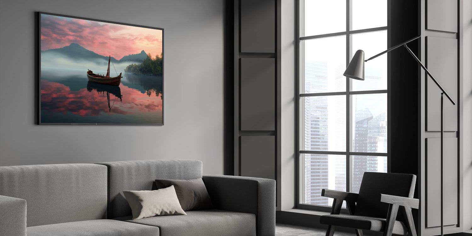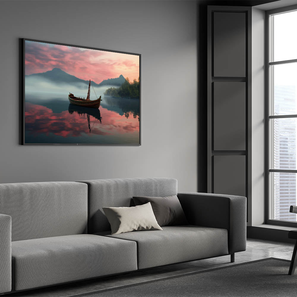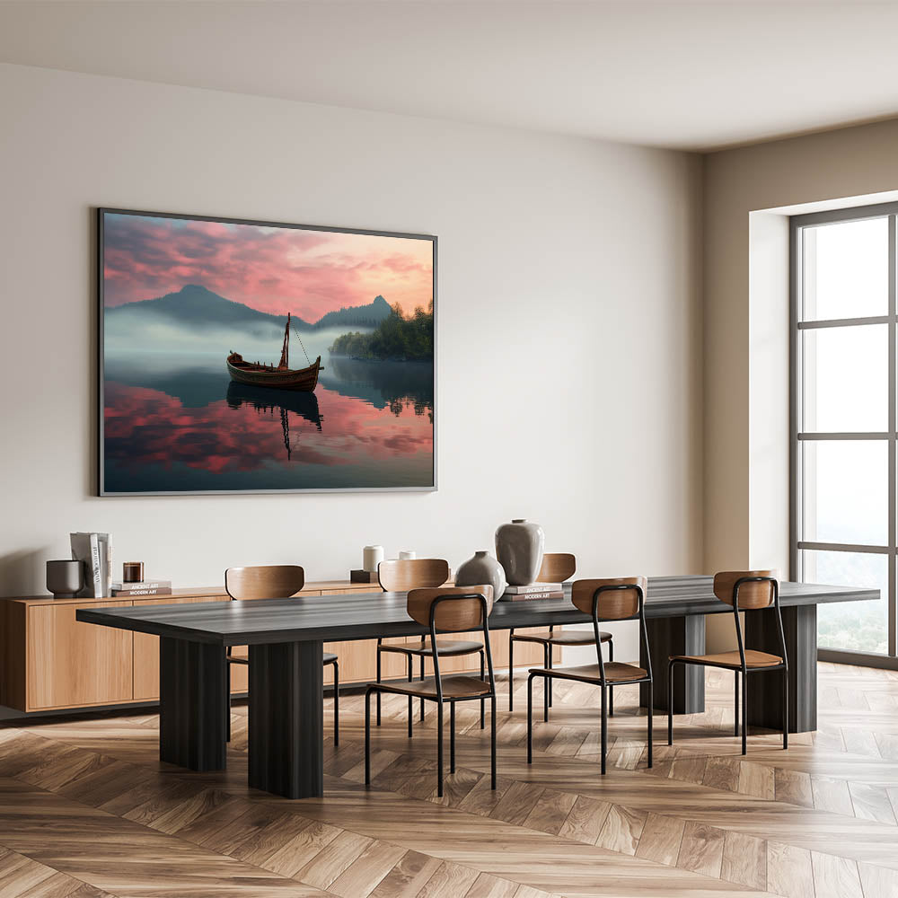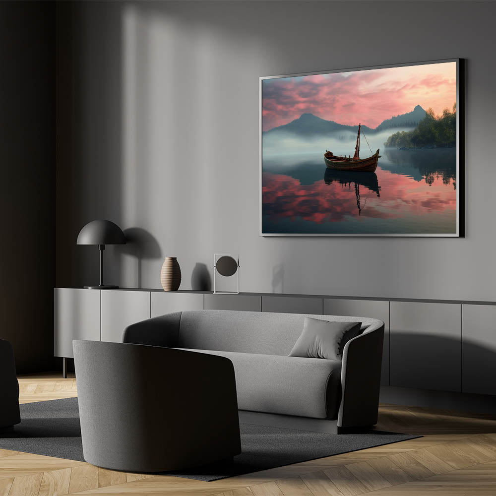 Misty Morning Rowboat on Lake - Serene Coastal Wall Art Print
