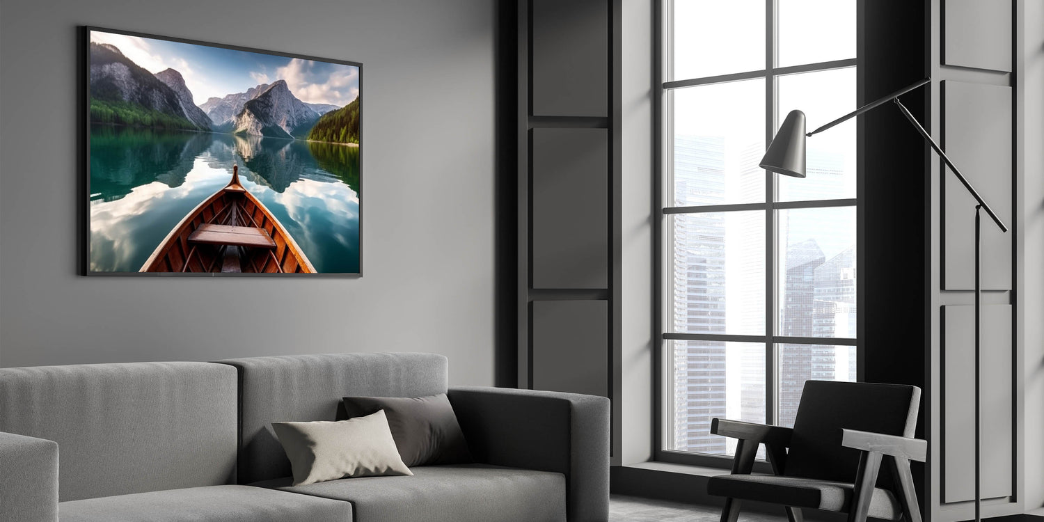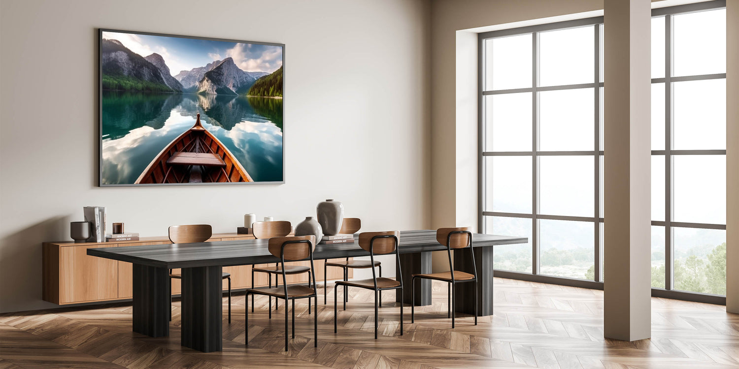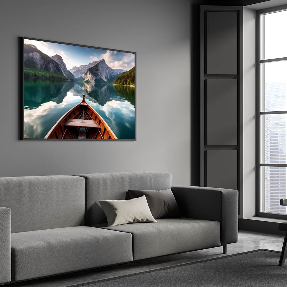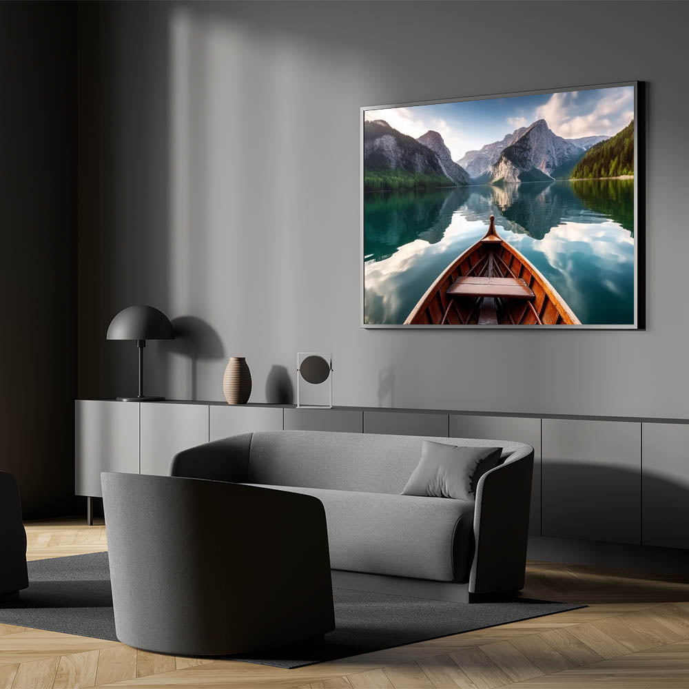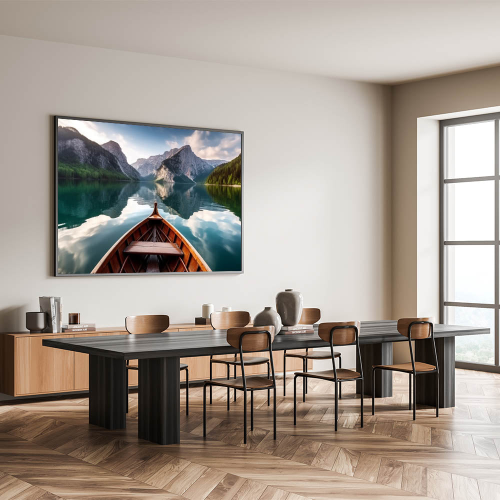 Immerse yourself in the serene beauty of nature with this breathtaking rowboat wall art. The artwork captures a peaceful moment on a mountain lake, where the view from the rowboat's bow leads you into a tranquil world of pristine waters and majestic peaks. The lush green forests and towering mountains reflect perfectly on the calm surface of the lake, creating a scene that is both soothing and awe-inspiring. Ideal for homes with a love for nature or nautical decor, this handcrafted boat art brings a sense of adventure and peace to any room. It is available in various high-quality materials, including Stretched Canvas, Framed Canvas, Acrylic Glass, Framed Acrylic Glass, Framed Print, Rolled Canvas, and Rolled Print.
