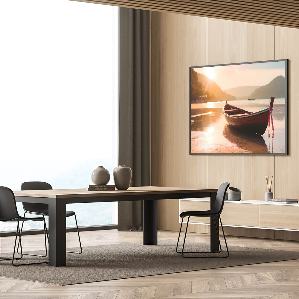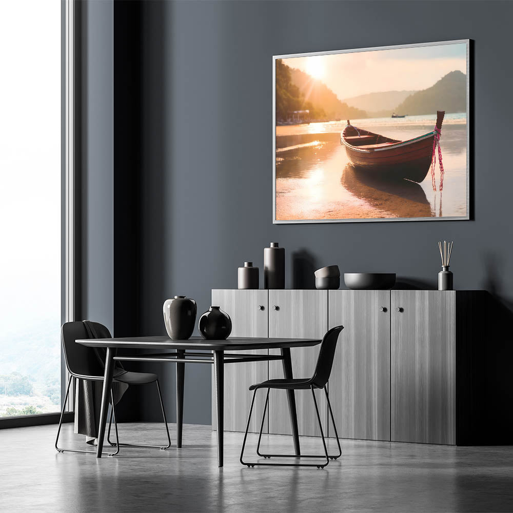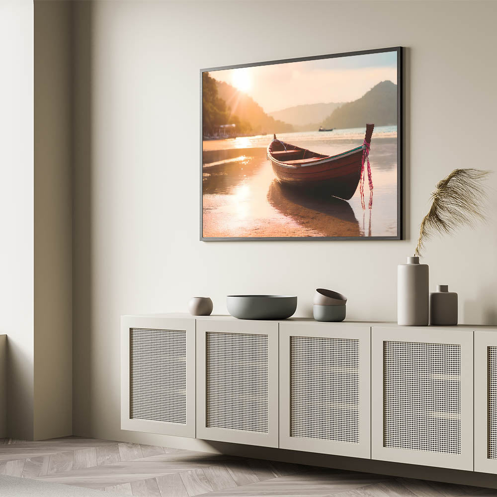 Capture the essence of a coastal journey with this stunning rowboat wall art. This piece features a weathered rowboat resting on a sandy shore, with the backdrop of rolling hills and a vast, tranquil ocean. The rustic texture of the boat, combined with the serene blue sky and distant mountains, evokes a sense of adventure and nostalgia. Perfect for those who love the sea or nautical-themed decor, this handcrafted boat art is available in various high-quality materials, including Stretched Canvas, Framed Canvas, Acrylic Glass, Framed Acrylic Glass, Framed Print, Rolled Canvas, and Rolled Print.