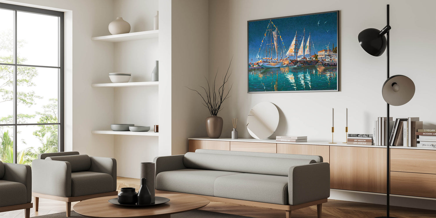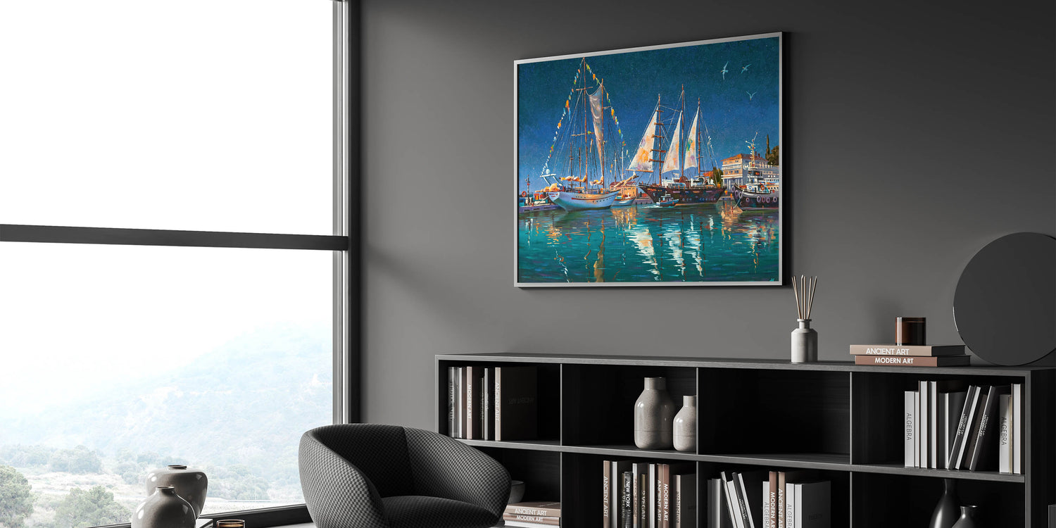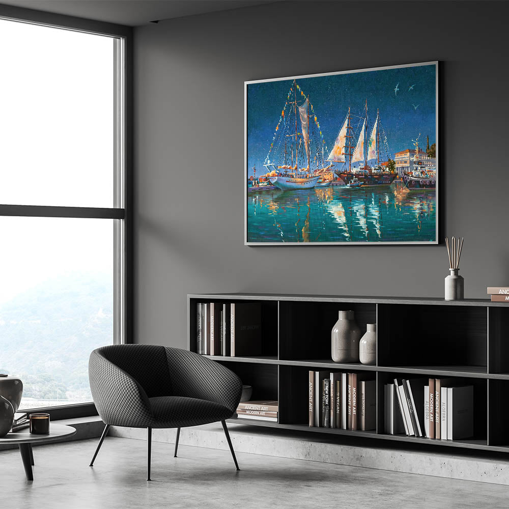 This captivating piece of Sochi Framed Art beautifully captures the charm of Sochi’s marina, with majestic sailboats illuminated under the night sky. The intricate reflections on the water and vibrant colors create a scene full of life and serenity, making it a perfect addition to any space. Whether you’re looking for a unique focal point for your living room or office, this Scenic Sochi Artwork will enhance any room’s ambiance. Available in Sochi Canvas Prints and framed options, this art piece offers flexibility to suit any decor style.