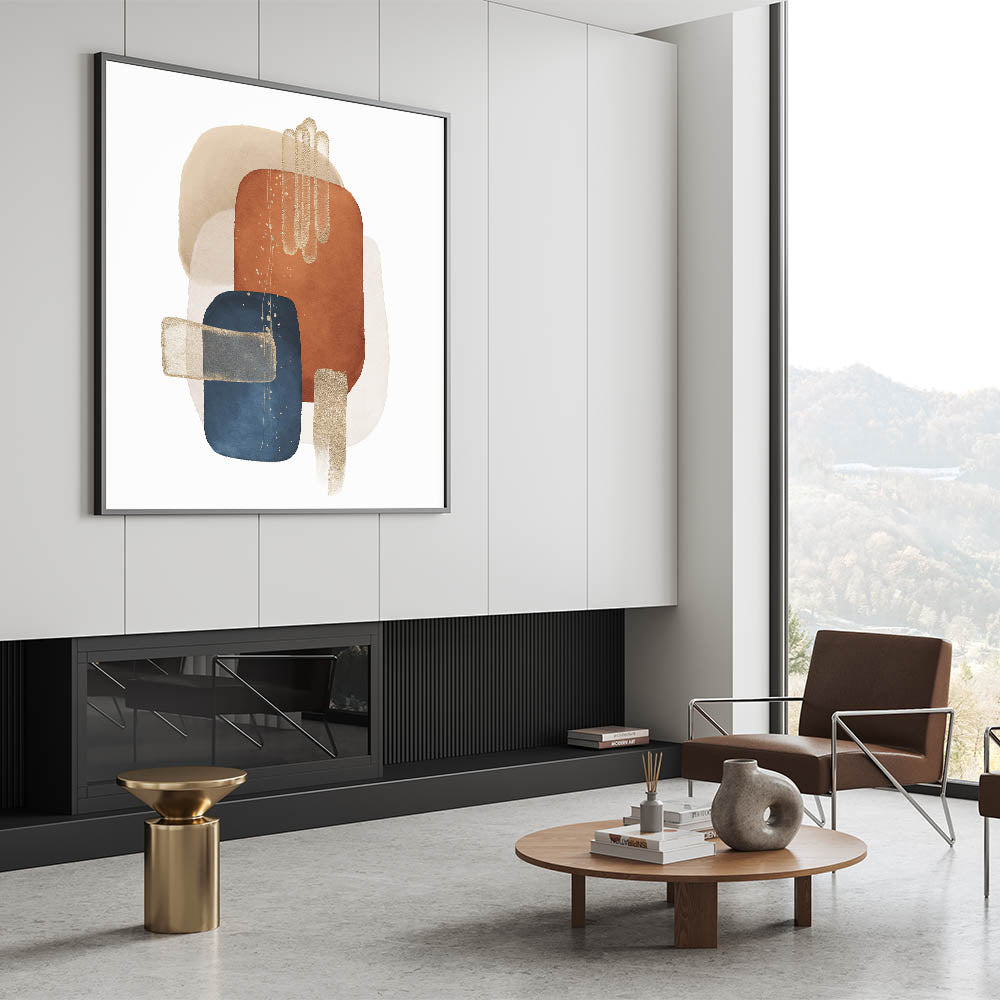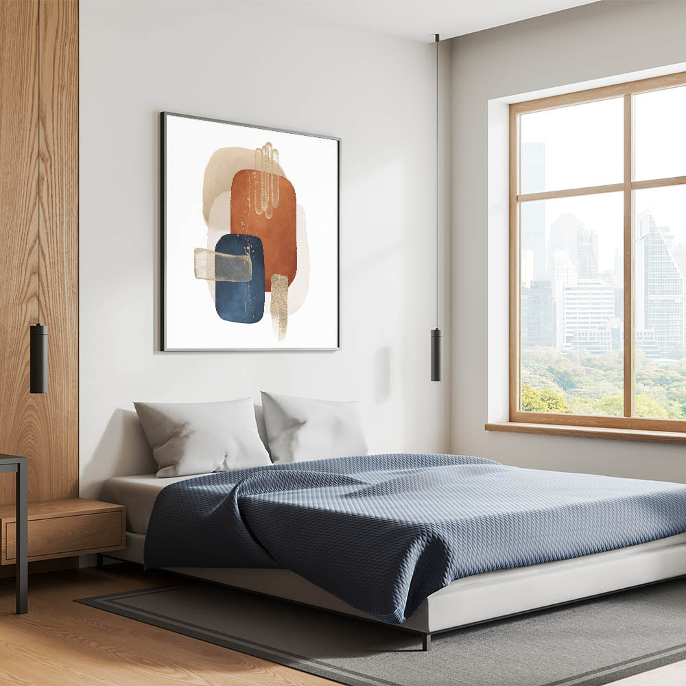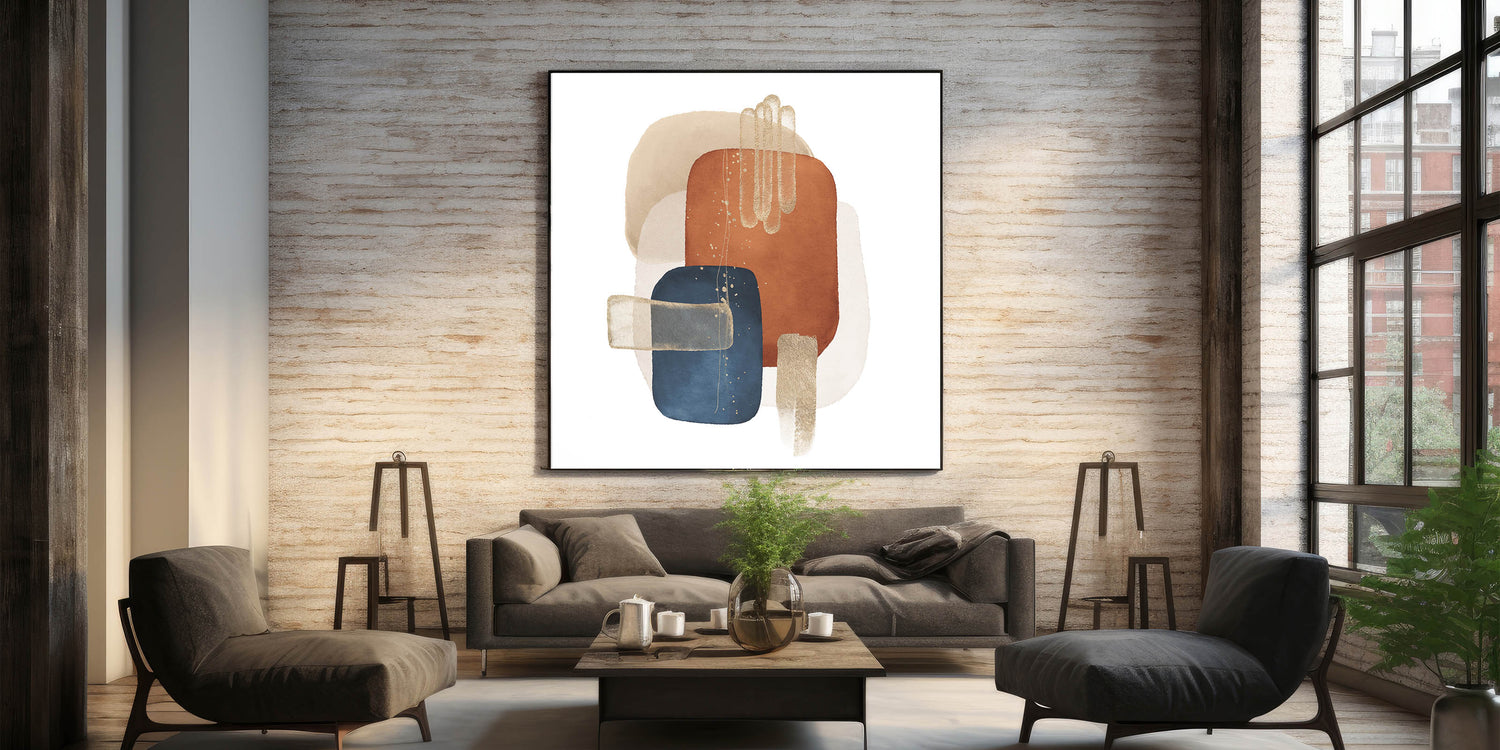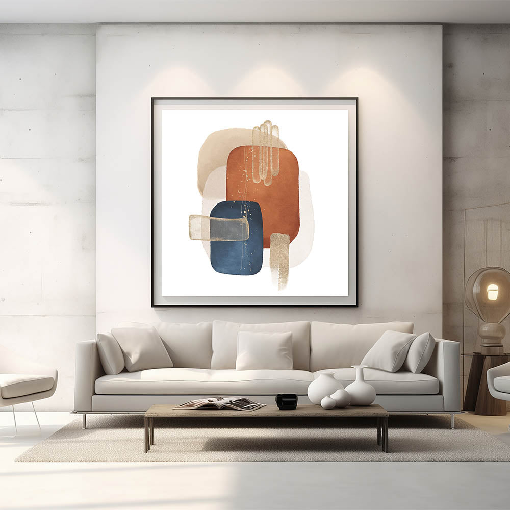 Elevate your space with the rich contrast and bold sophistication of this geometric minimalist abstract wall art. Featuring deep navy blue, burnt orange, beige, and off-white tones, the piece is beautifully accented with gold elements, creating a visually balanced and modern composition. The structured geometric layout gives it a striking presence, ideal for bold yet refined interiors.
