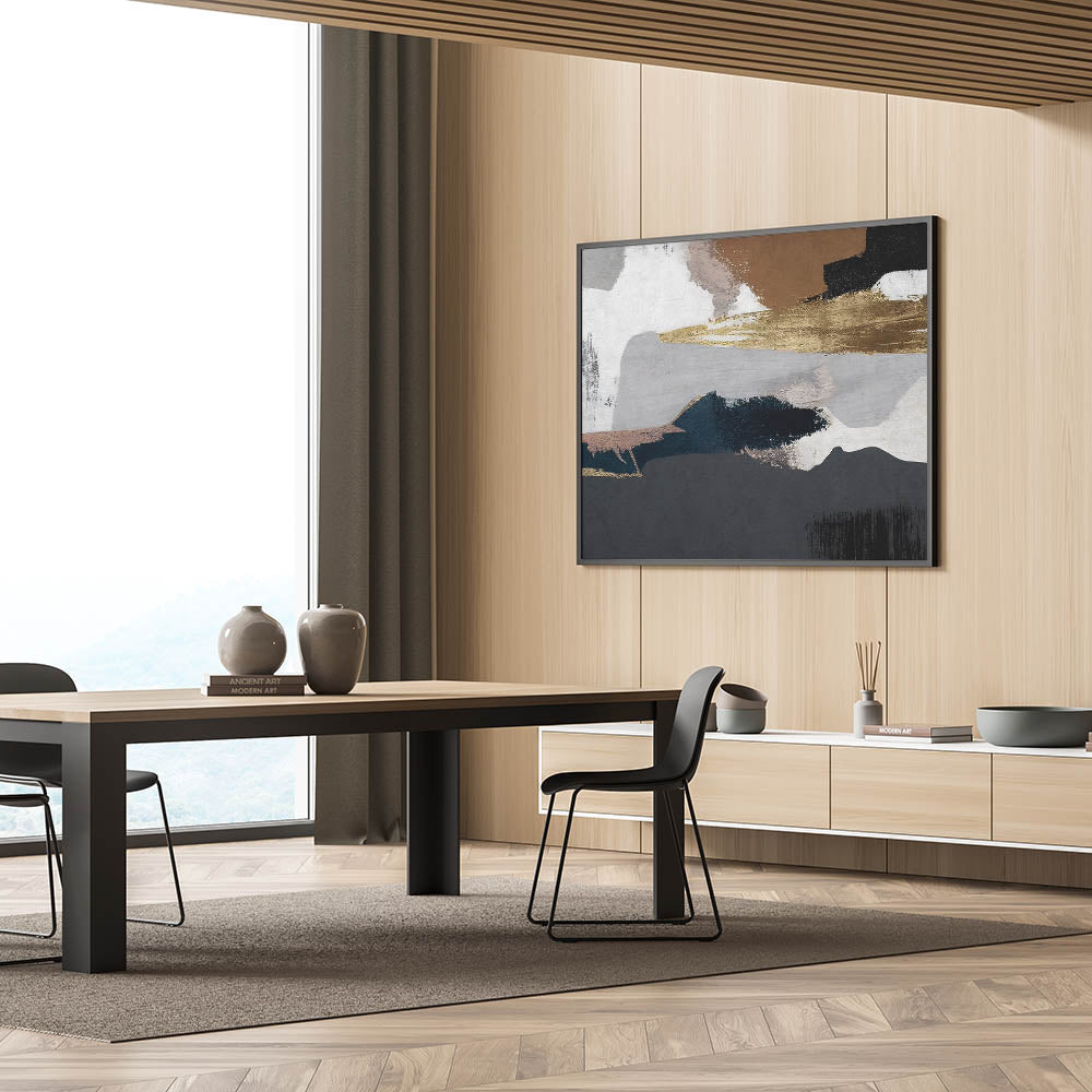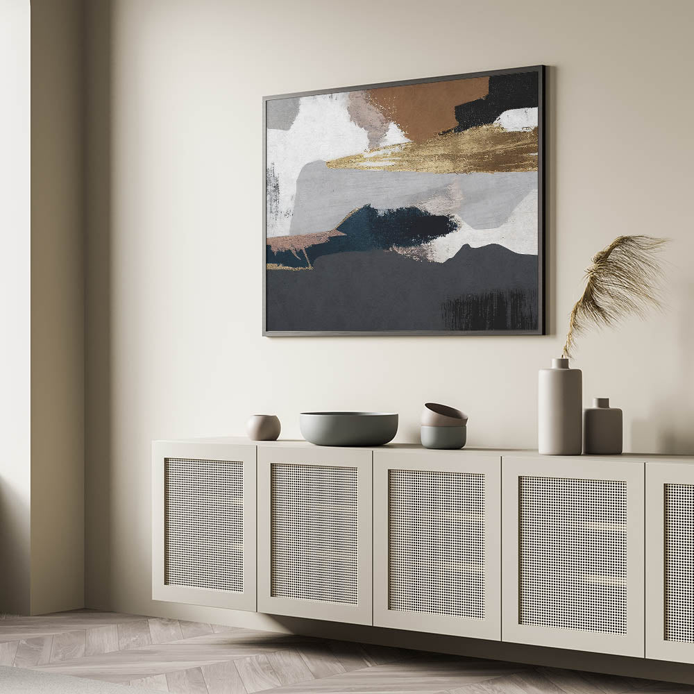 Elevate your interior decor with this striking abstract strokes and lines art. This piece blends earthy tones with bold geometric patterns, creating a visually stunning composition that exudes warmth and sophistication. Featuring a rich palette of deep navy, warm gold, and soft browns, this artwork is perfect for adding a touch of rustic charm to any space.