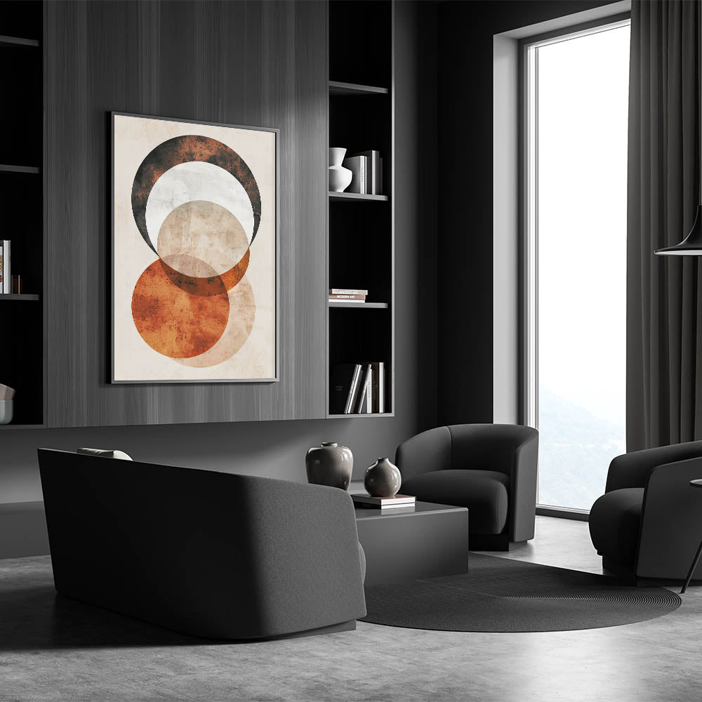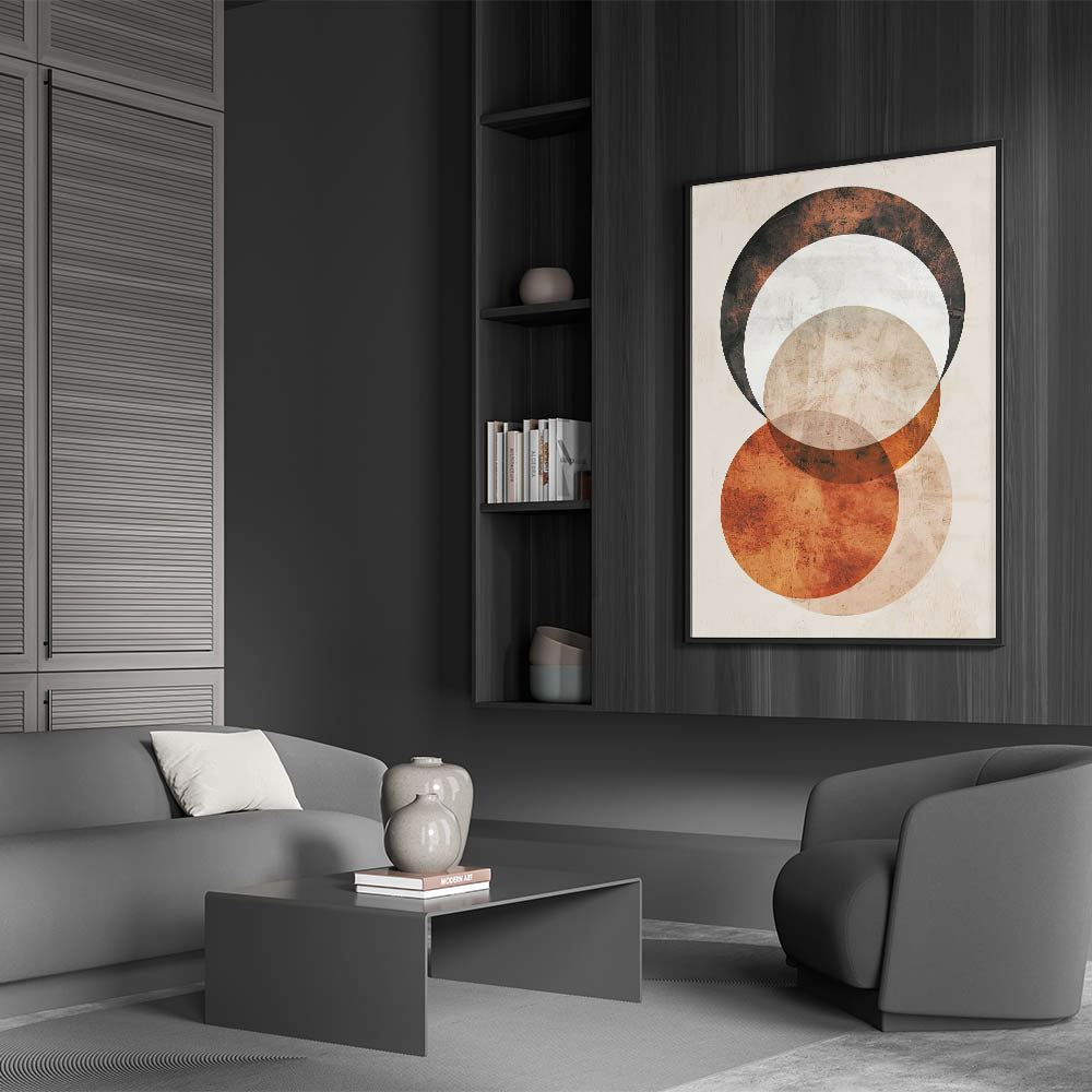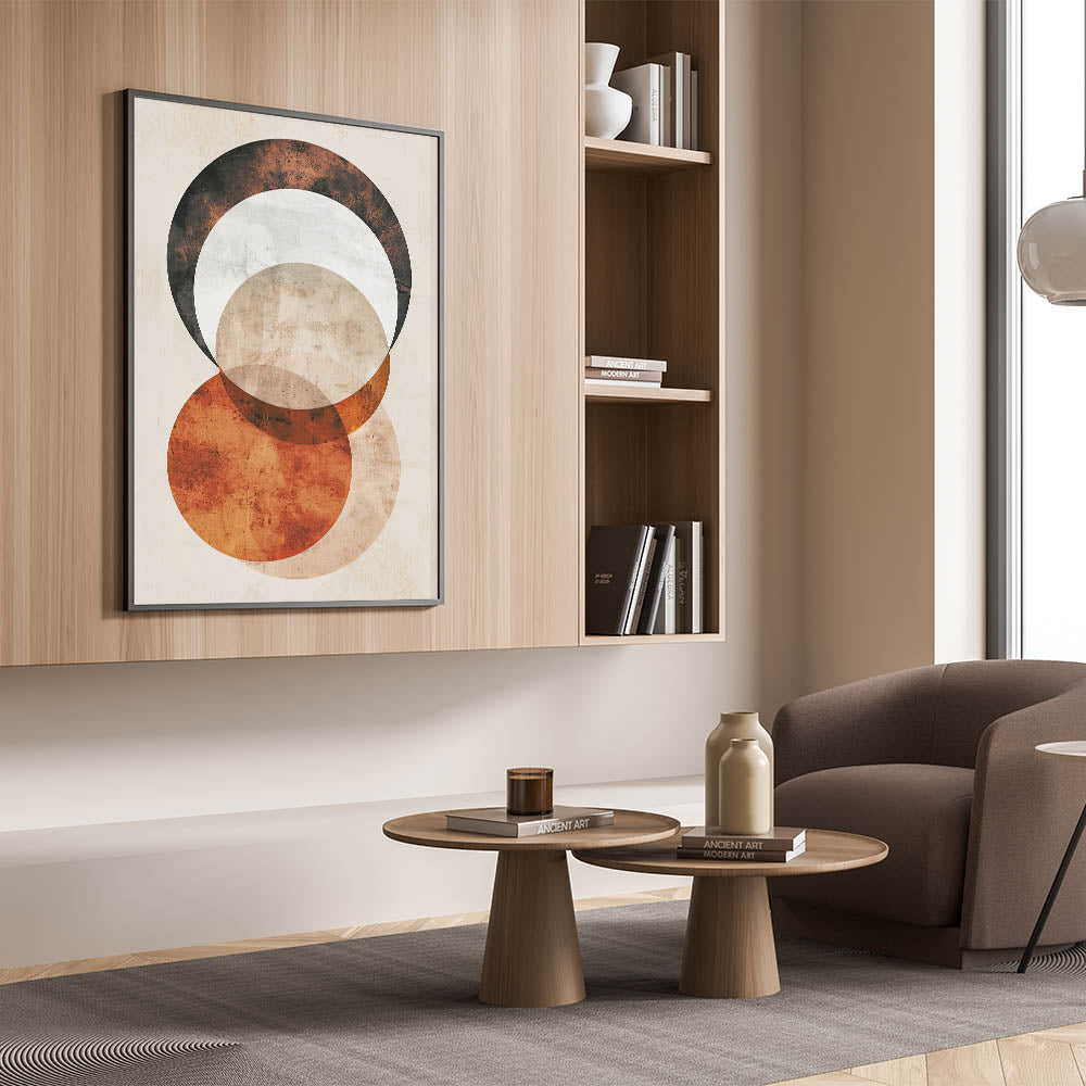 Bring warmth and movement into your home with this bold piece from the Earthen Harmony Abstracts collection. Featuring layered circular shapes in burnt orange, beige, white, and black, this modern abstract art is textured with rich, earthy detail. The organic structure and raw finish make it a standout piece in minimalist wall decor.