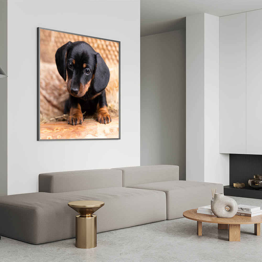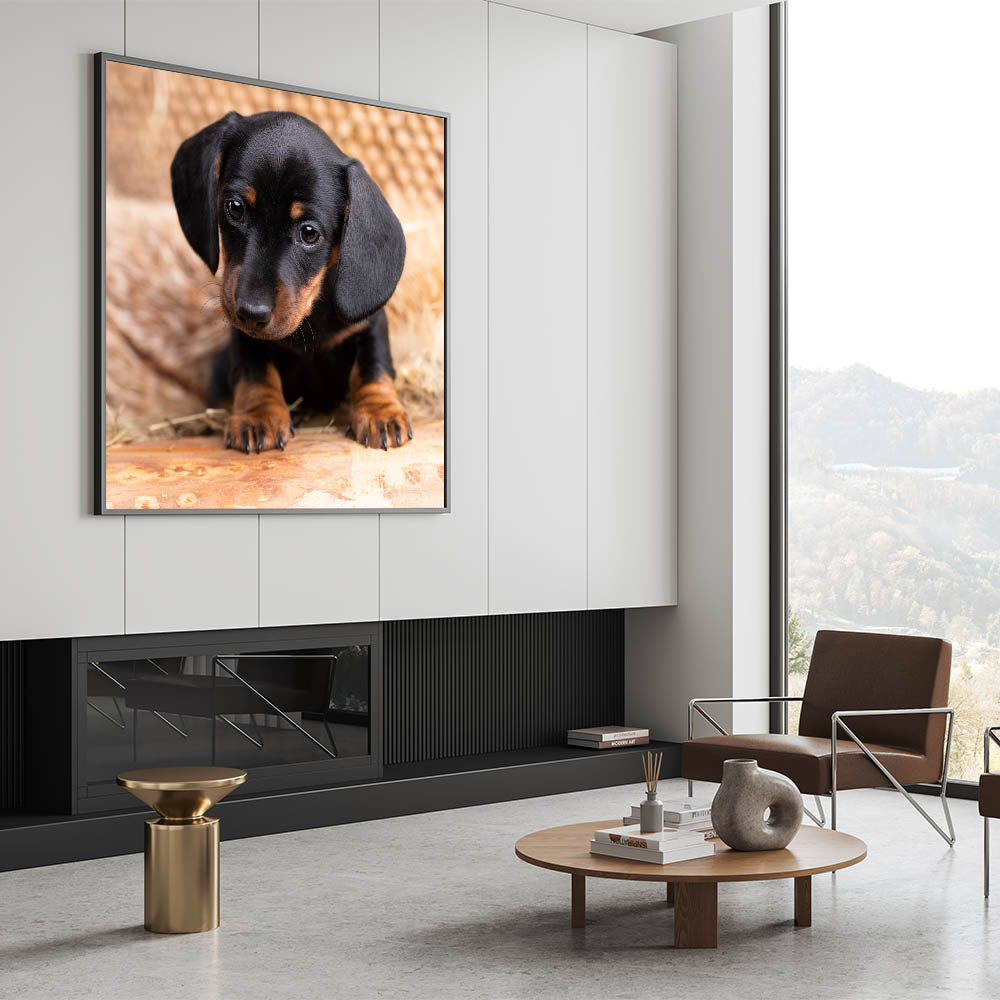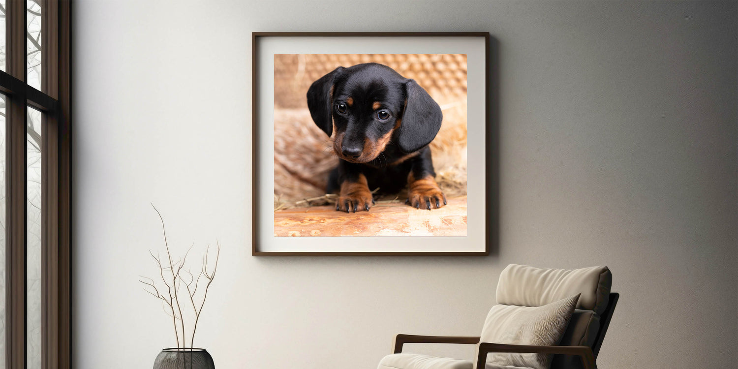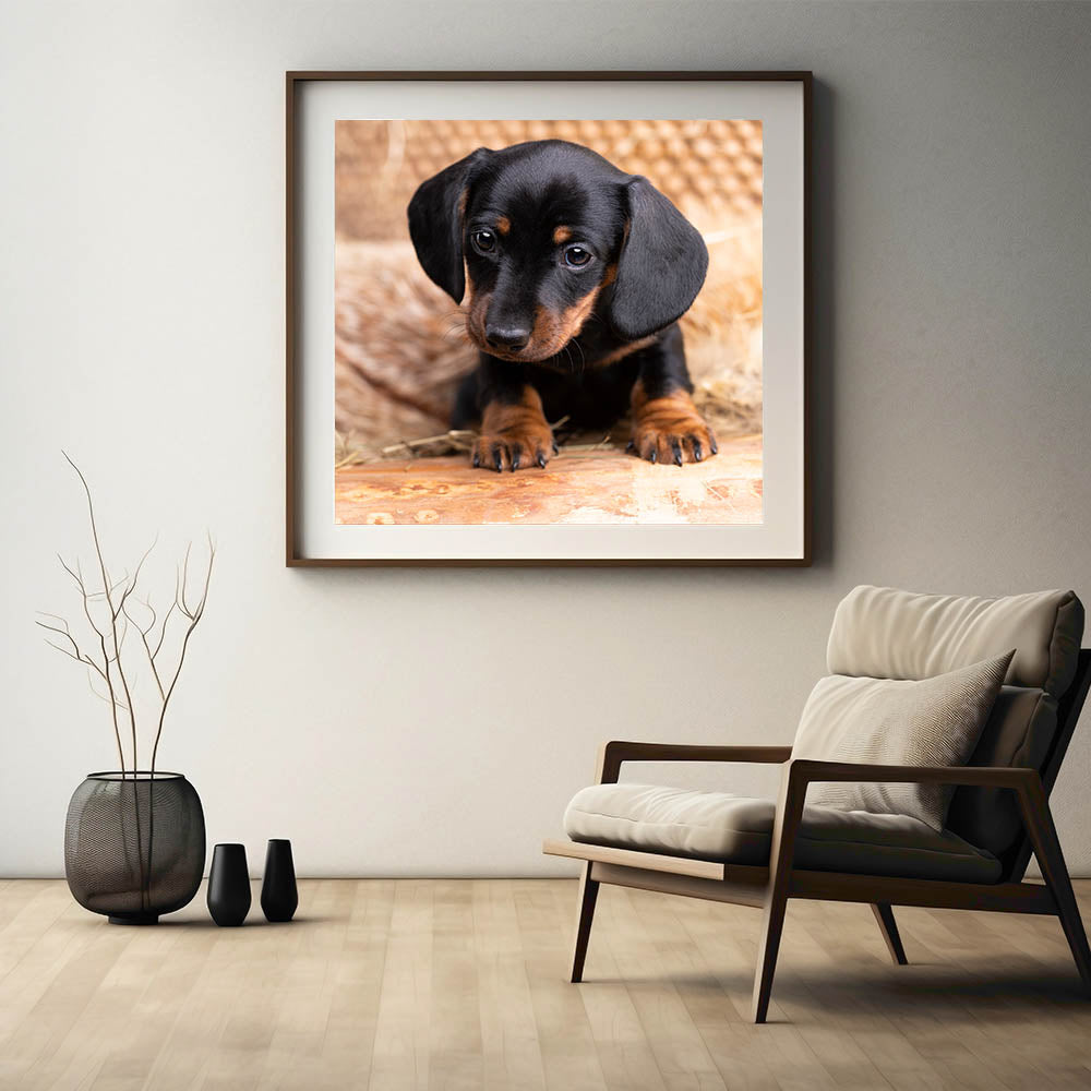 Transform your living space with this charming Dachshund wall art, perfect for dog enthusiasts and art lovers alike. This high-quality Dachshund canvas print captures the essence of this beloved breed, showcasing a detailed and heartwarming portrait of a Dachshund puppy. The lifelike features and vibrant colors make it a stunning addition to any room, whether it’s your living room, bedroom, or office.