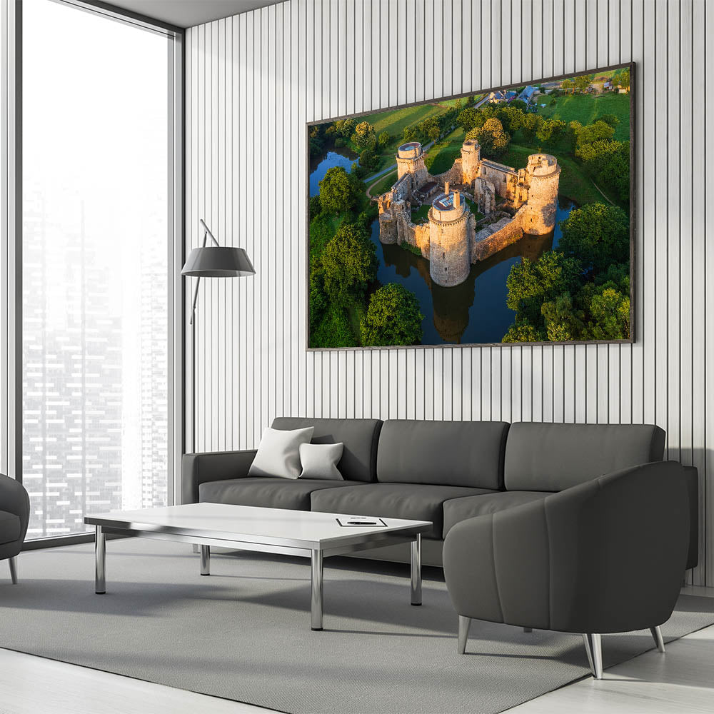 Elevate your space with this stunning aerial castle wall art, capturing the grandeur of a medieval fortress surrounded by lush greenery and a tranquil moat. This breathtaking view showcases the intricate architecture of the historic castle, bathed in the warm light of the golden hour, making it a perfect piece for those who appreciate the beauty of history and nature.