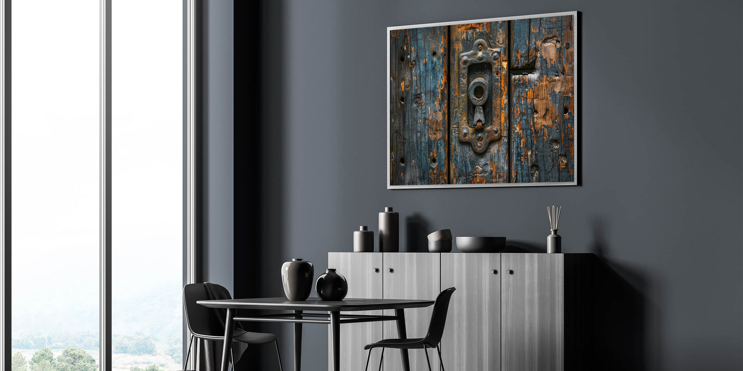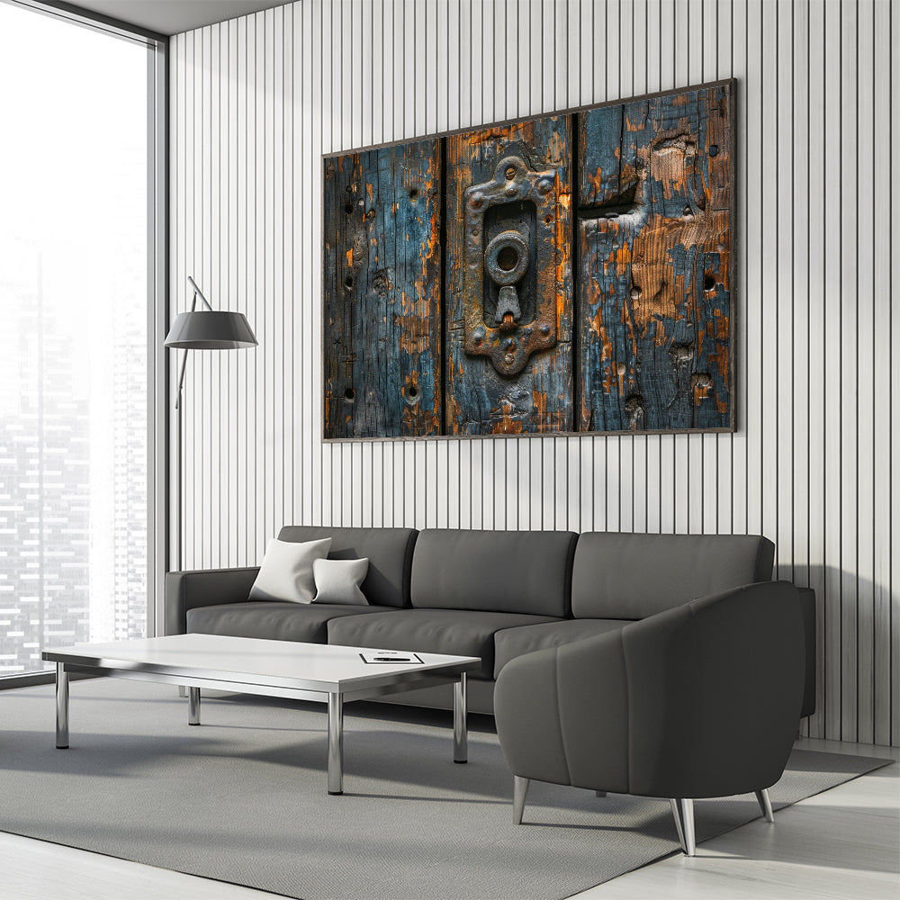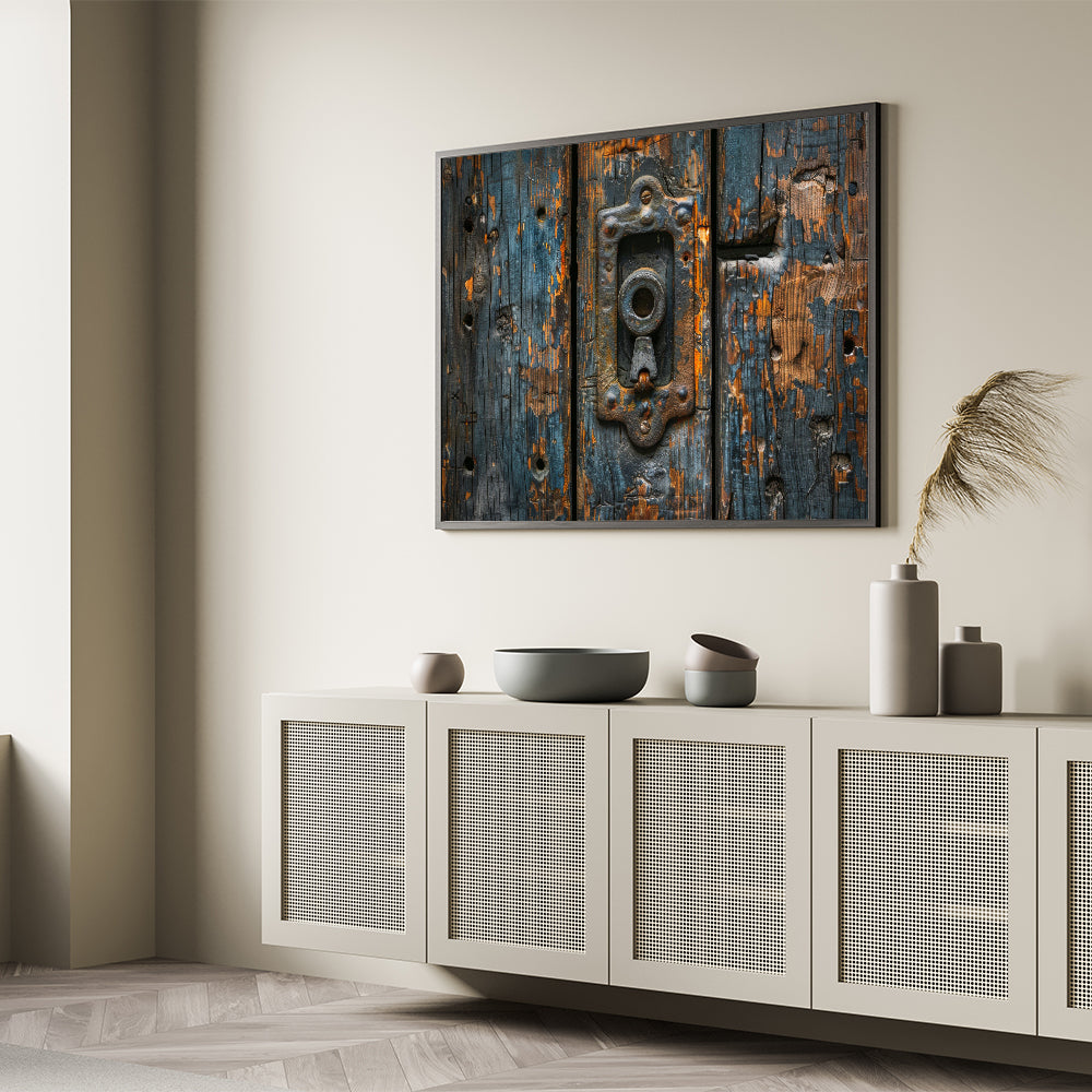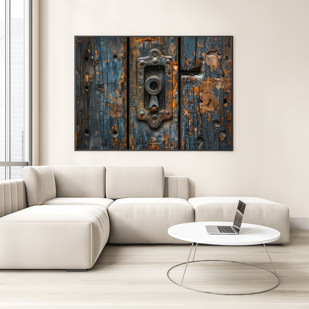 Bring a sense of history and character to your home with this aged hardware wall art. This piece features a weathered wooden door adorned with a rustic iron lock, showcasing the beauty of timeworn materials. The combination of the peeling paint, worn textures, and rugged metal elements creates a striking visual that is perfect for adding depth and an industrial edge to any space.