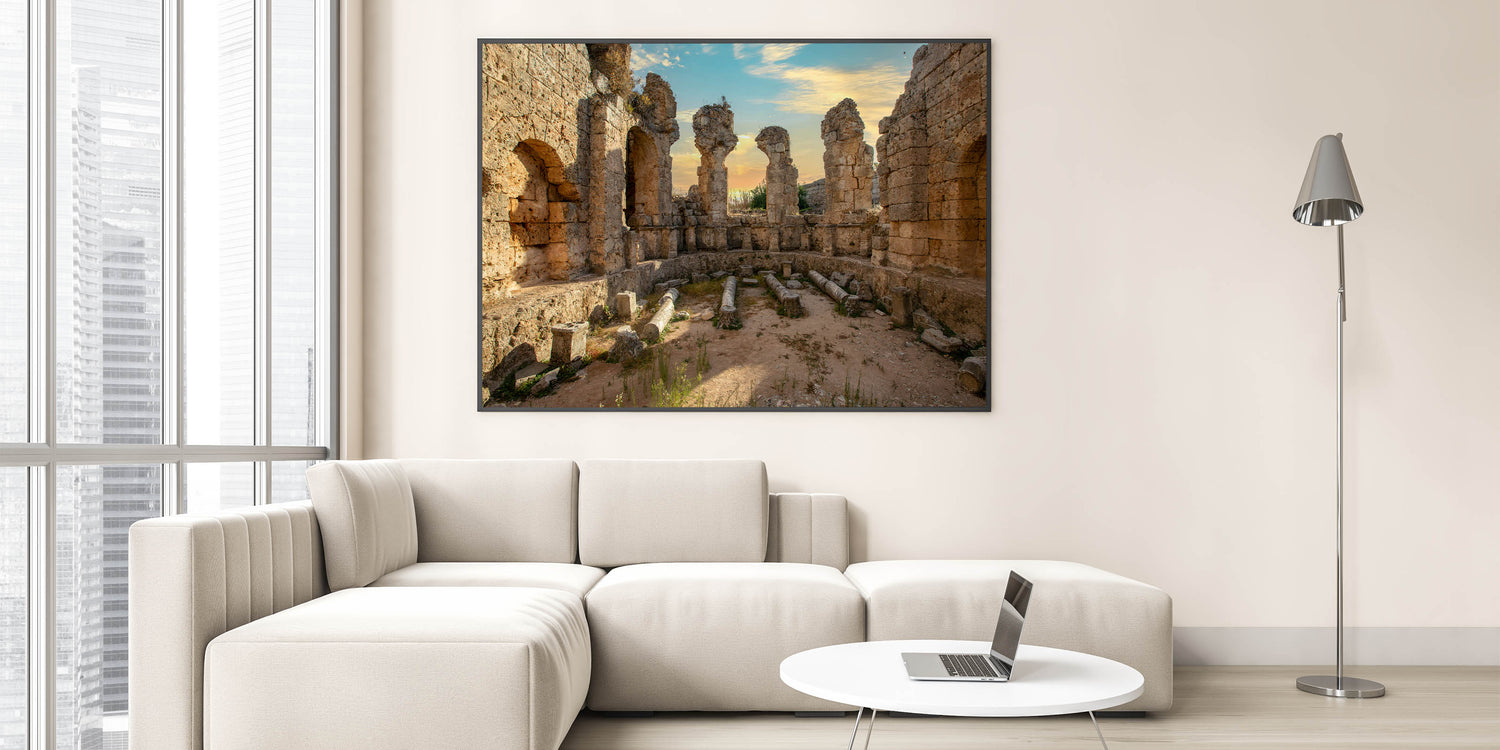 Discover the timeless beauty of ancient architecture with this stunning wall art featuring a circular amphitheater bathed in the warm glow of the setting sun. The intricate stonework and remnants of ancient columns evoke a sense of history and grandeur, making this piece perfect for those who appreciate the elegance and significance of past civilizations.