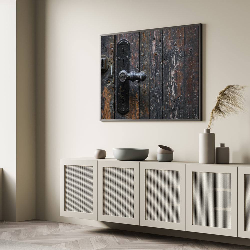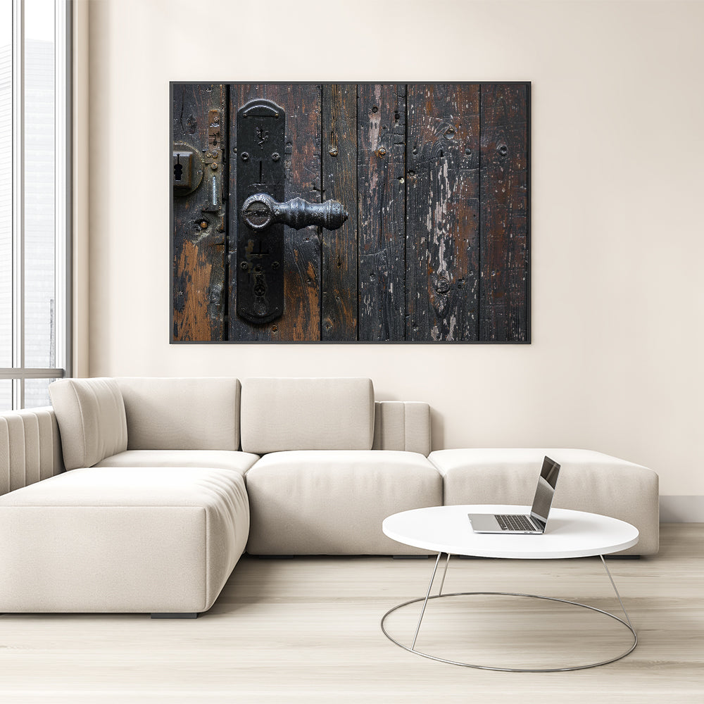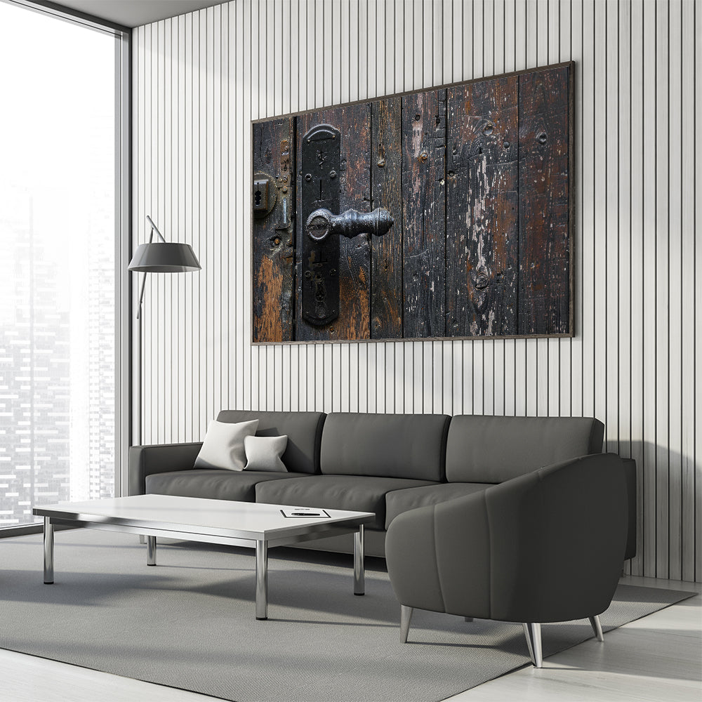 Elevate your space with the timeless appeal of this antique hardware wall art. Featuring a rustic black door handle and weathered wooden door, this piece captures the rugged beauty of vintage craftsmanship. The distressed textures and dark tones create a bold contrast, making this artwork an excellent addition to any room with a vintage, industrial, or rustic theme.