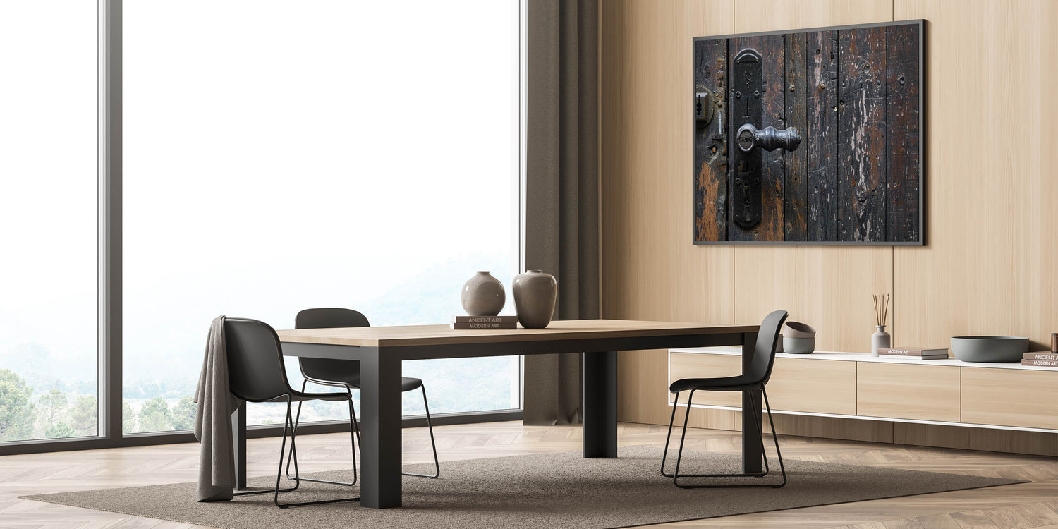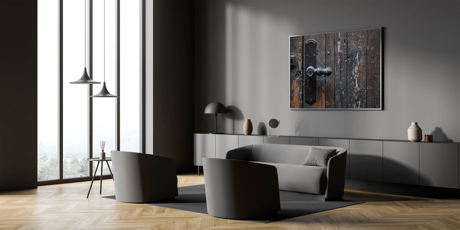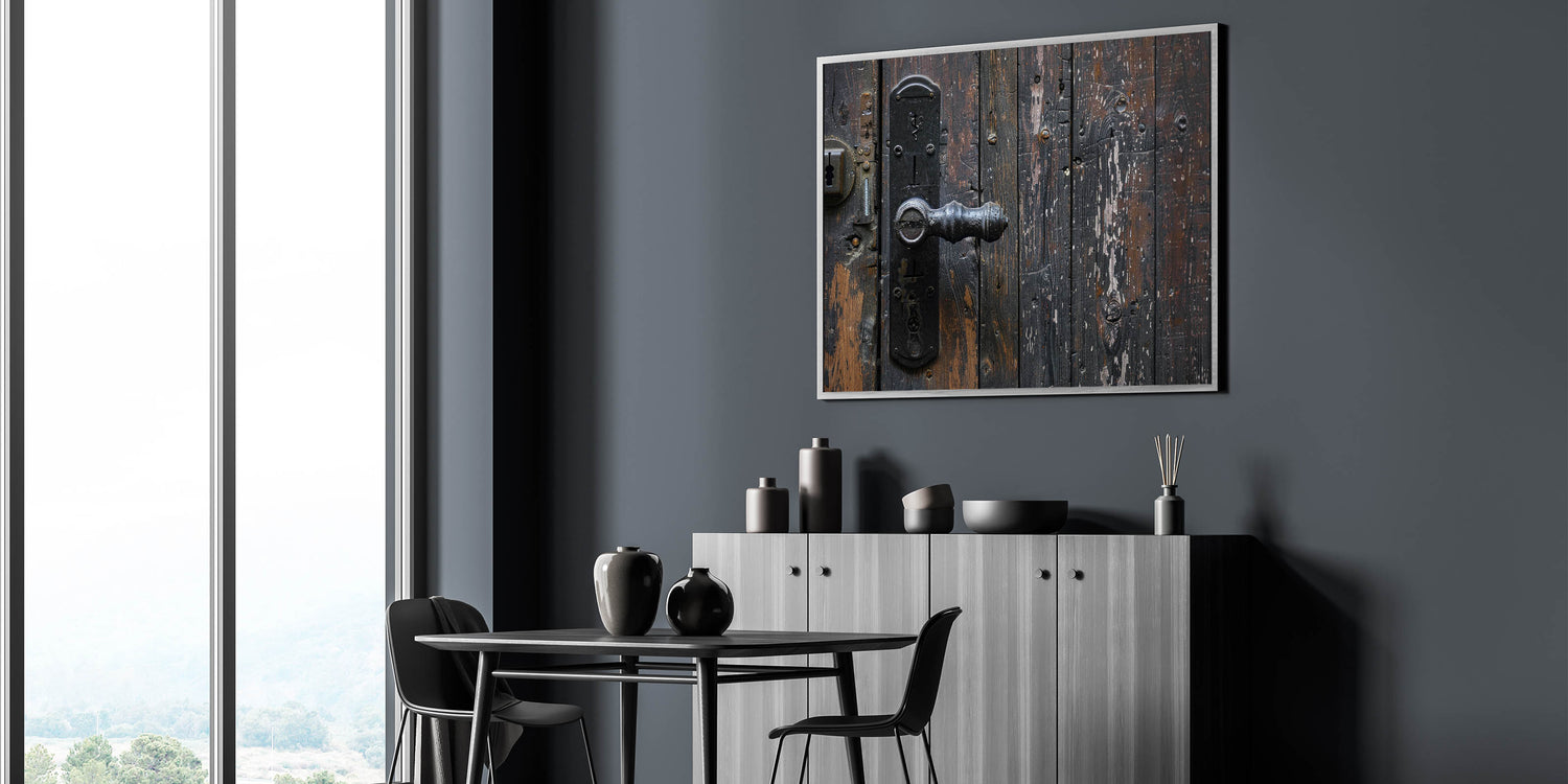 Elevate your space with the timeless appeal of this antique hardware wall art. Featuring a rustic black door handle and weathered wooden door, this piece captures the rugged beauty of vintage craftsmanship. The distressed textures and dark tones create a bold contrast, making this artwork an excellent addition to any room with a vintage, industrial, or rustic theme.