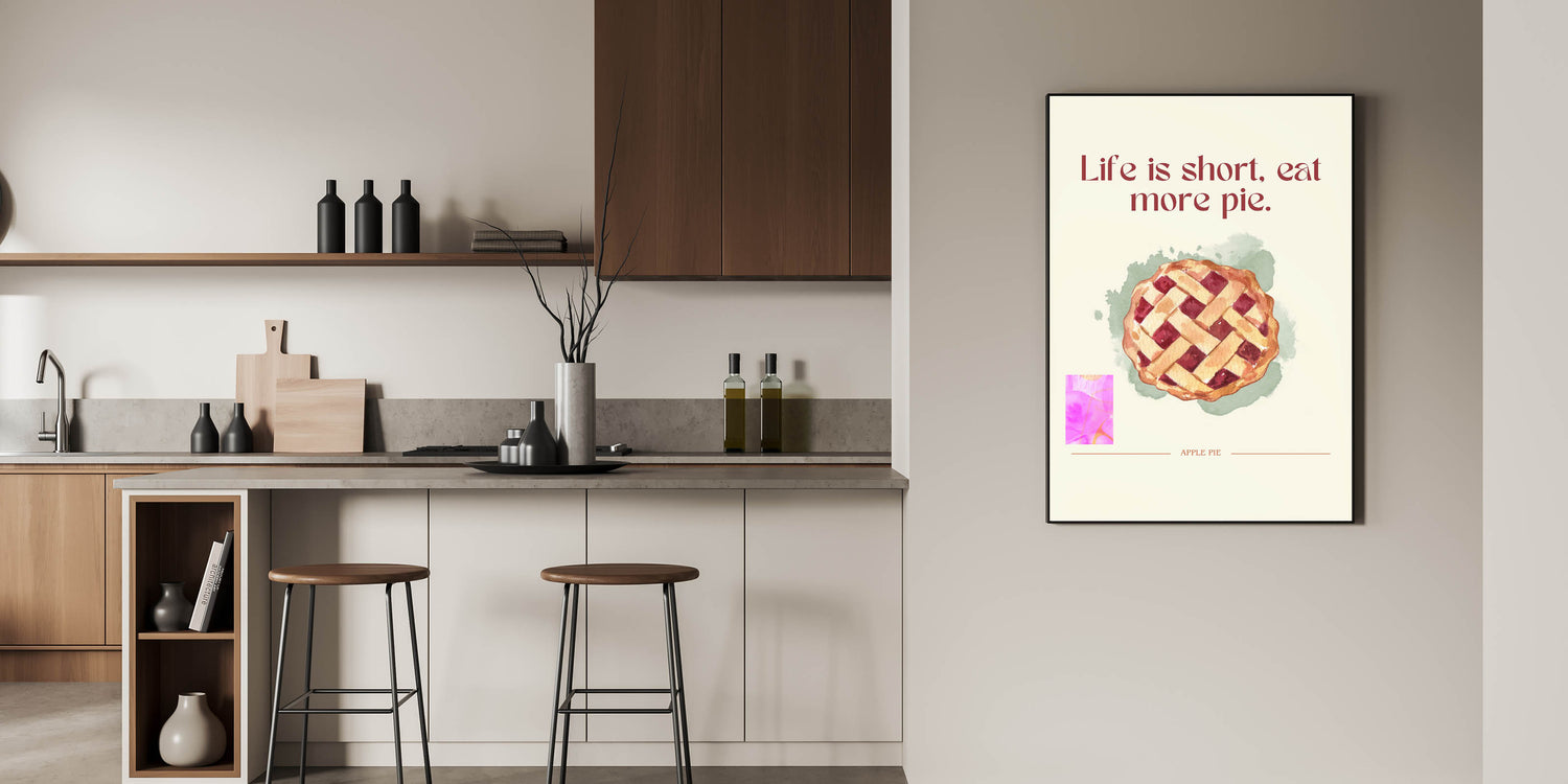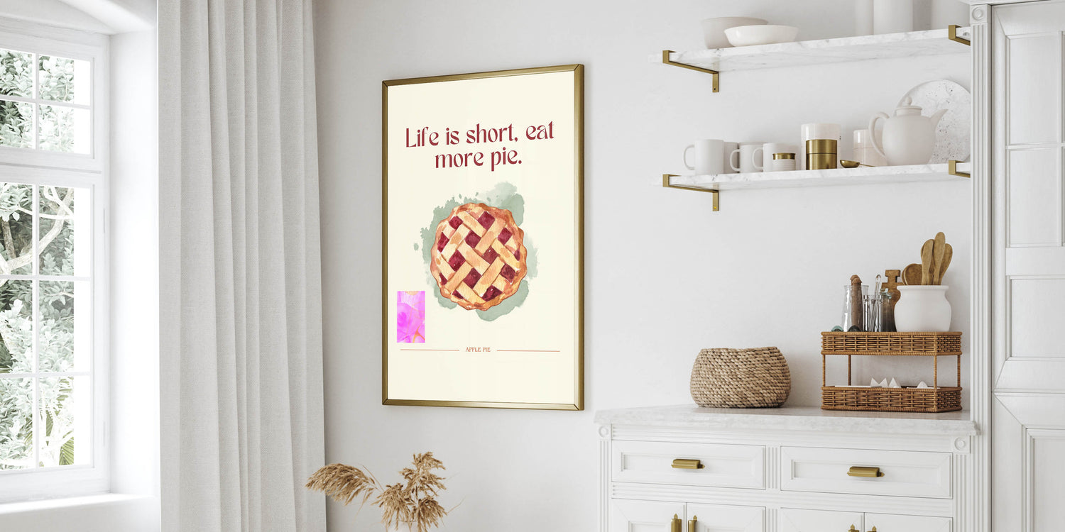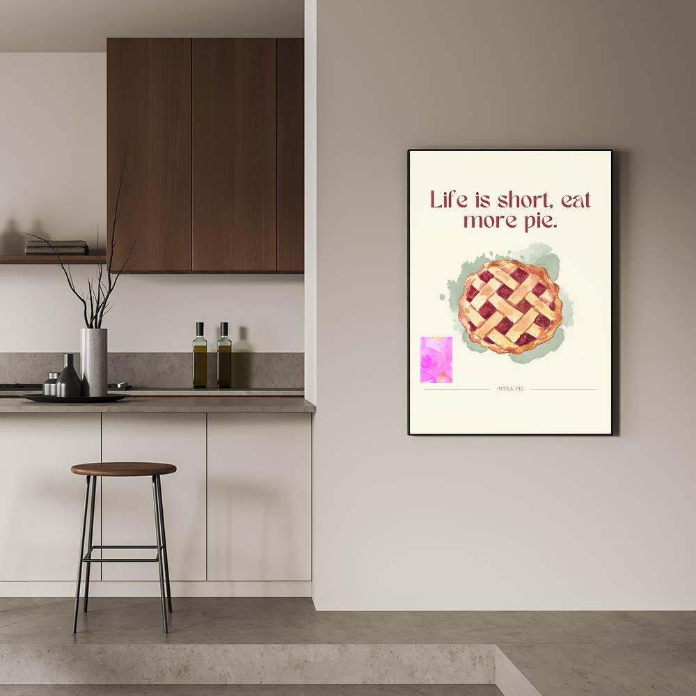 Celebrate the joy of homemade desserts with this charming bakery art print, featuring a watercolor illustration of a classic apple pie. The inviting design is enhanced by a playful quote, making this dessert wall art a perfect addition to kitchens, bakeries, or cafés.