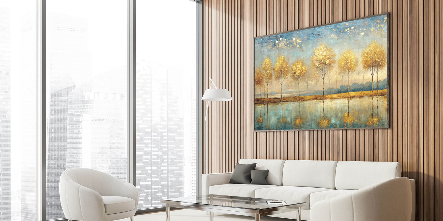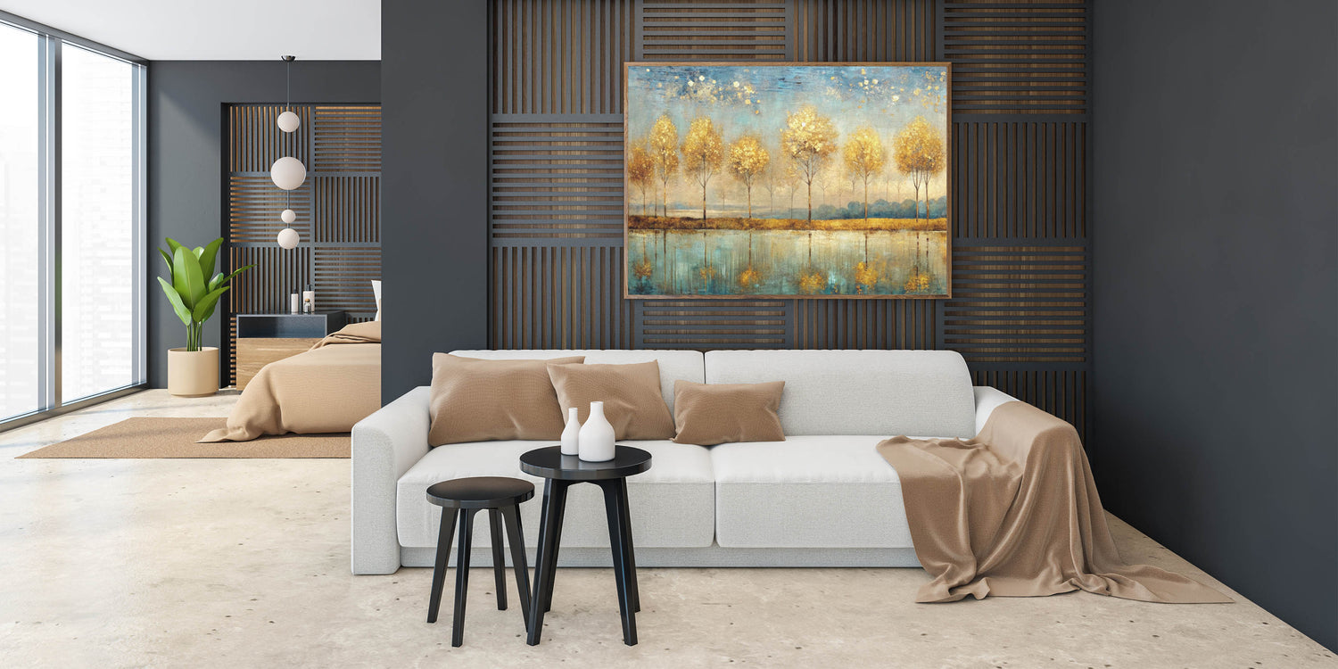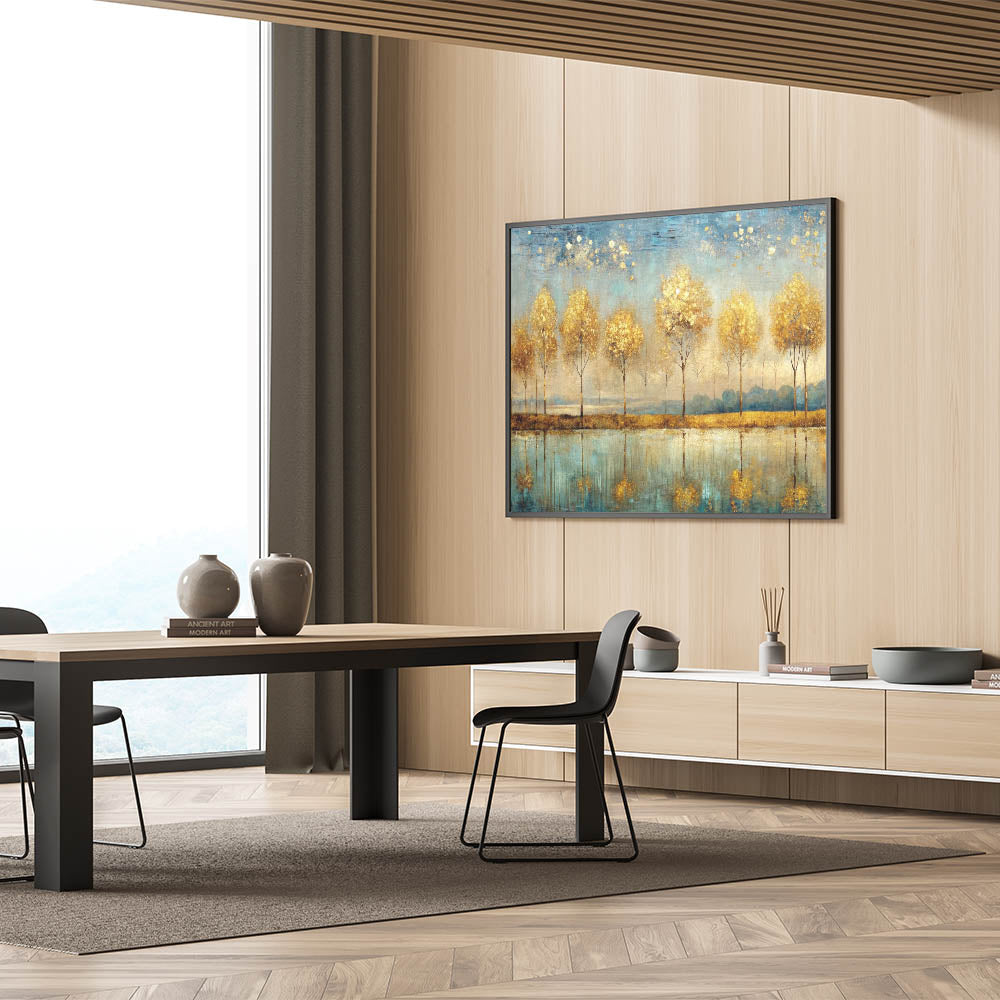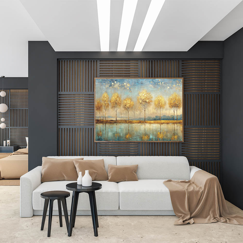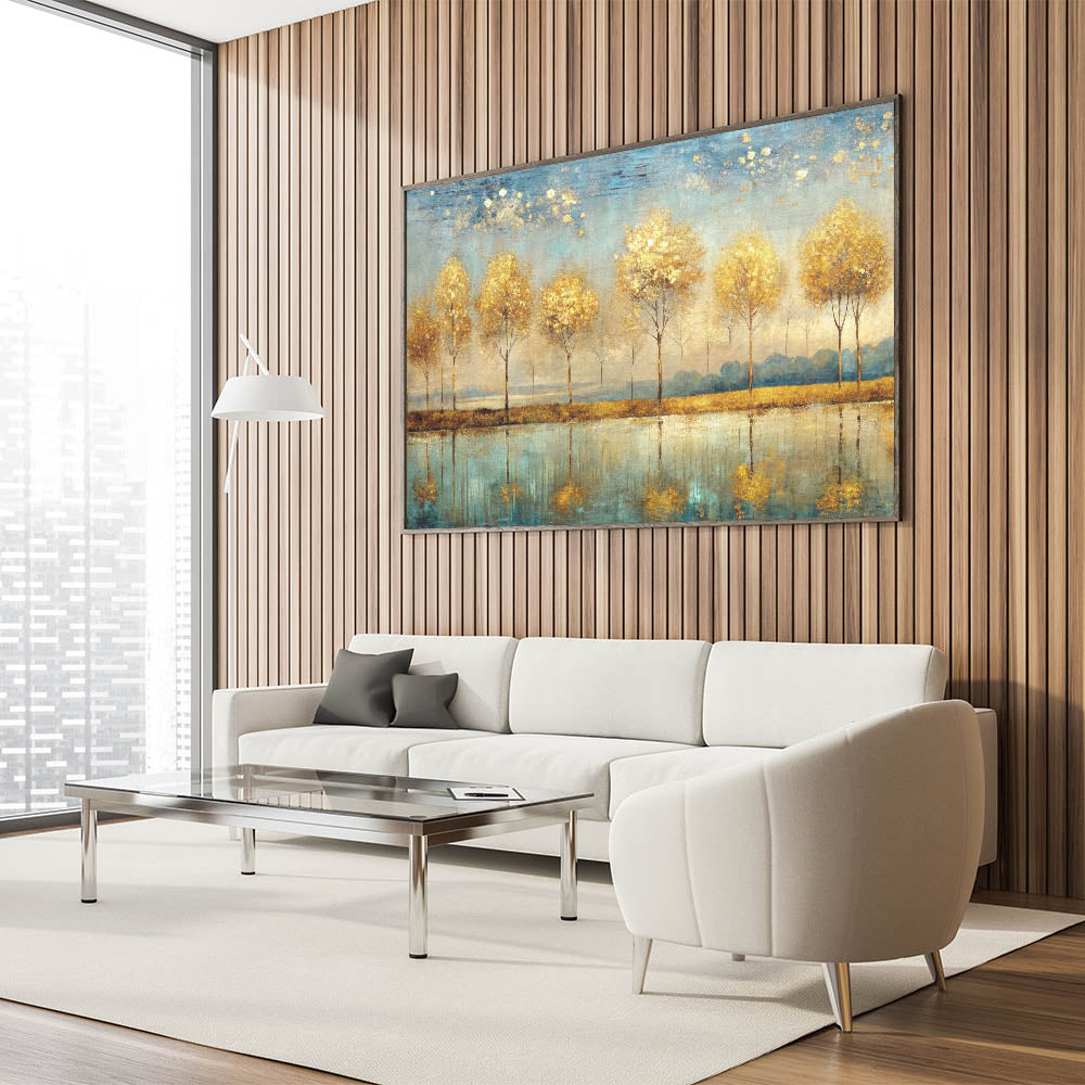 Elevate your space with this enchanting piece of abstract landscape art. The "Artistic Landscape Designs" canvas captures a row of golden trees reflected in a serene blue lake, creating a harmonious balance of warmth and tranquility. The golden hues of the trees contrast beautifully with the cool blue tones of the water, making this artwork a stunning focal point for any room.