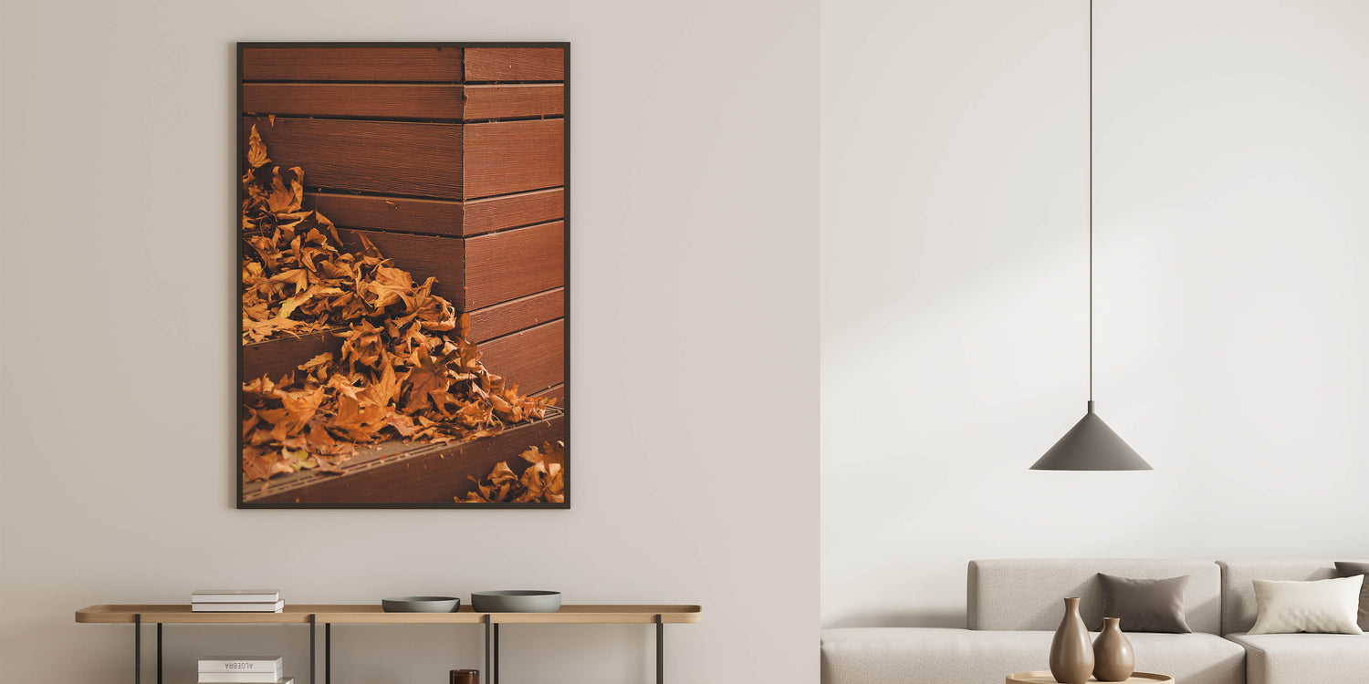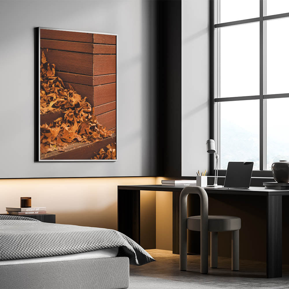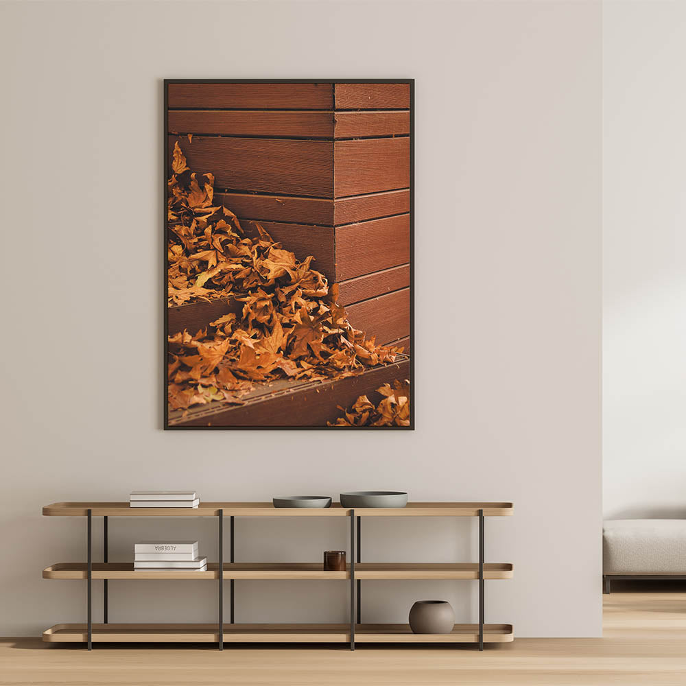 Celebrate the essence of autumn with this Fall Wall Art, featuring a stunning close-up of golden-brown leaves scattered on rustic wooden steps. The rich earthy tones and natural textures of this Autumn Wall Art evoke a cozy, nostalgic atmosphere, making it an ideal piece for seasonal décor.