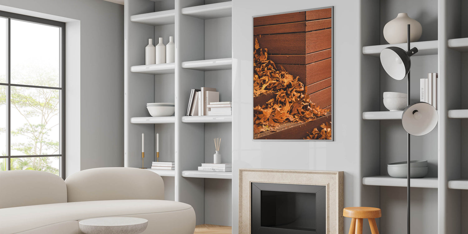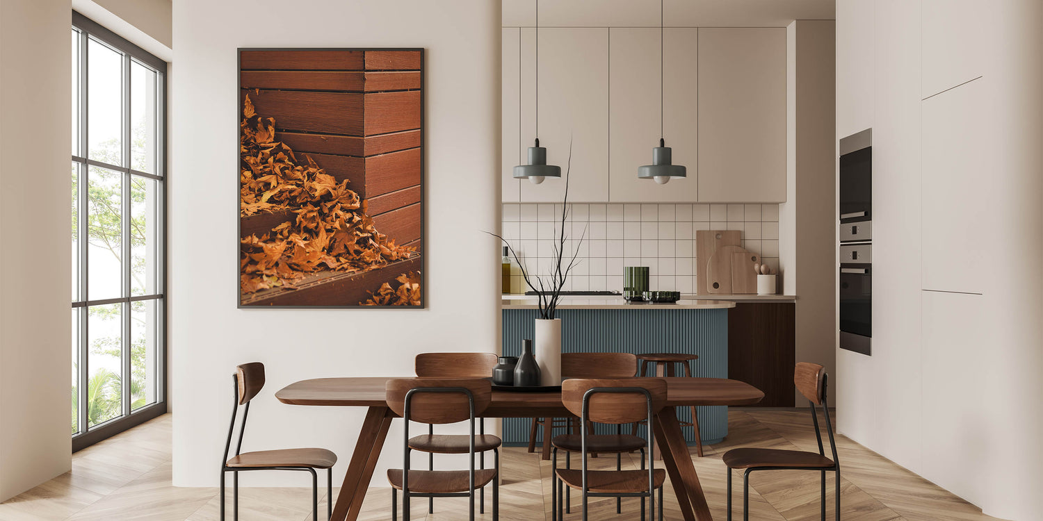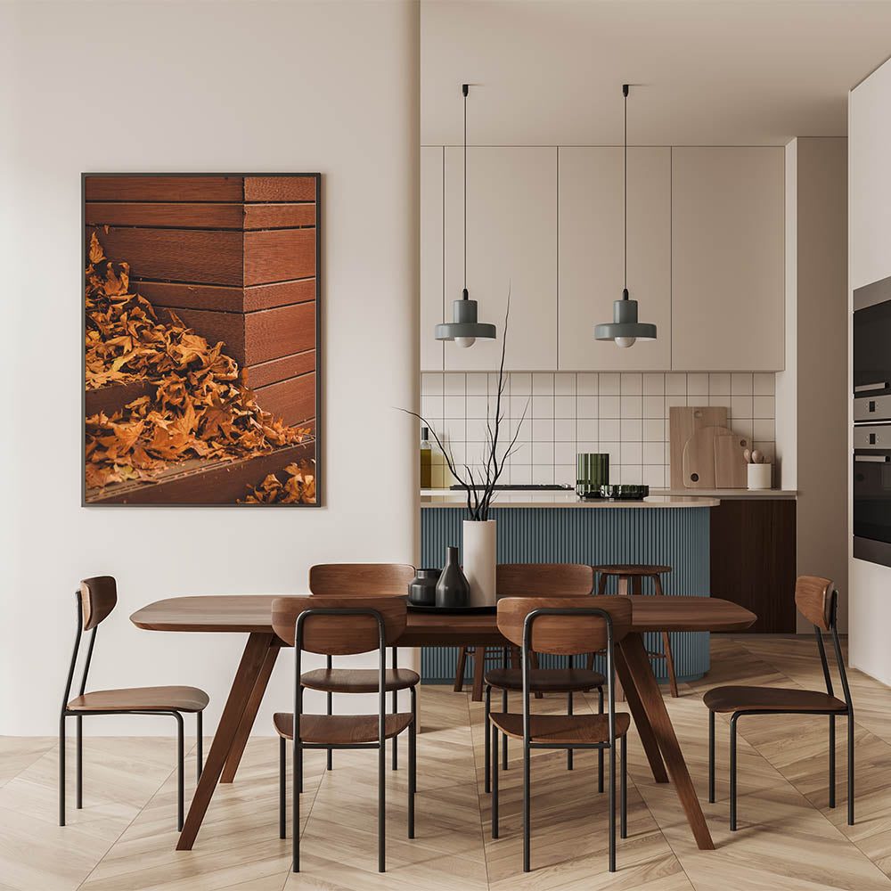 Celebrate the essence of autumn with this Fall Wall Art, featuring a stunning close-up of golden-brown leaves scattered on rustic wooden steps. The rich earthy tones and natural textures of this Autumn Wall Art evoke a cozy, nostalgic atmosphere, making it an ideal piece for seasonal décor.
