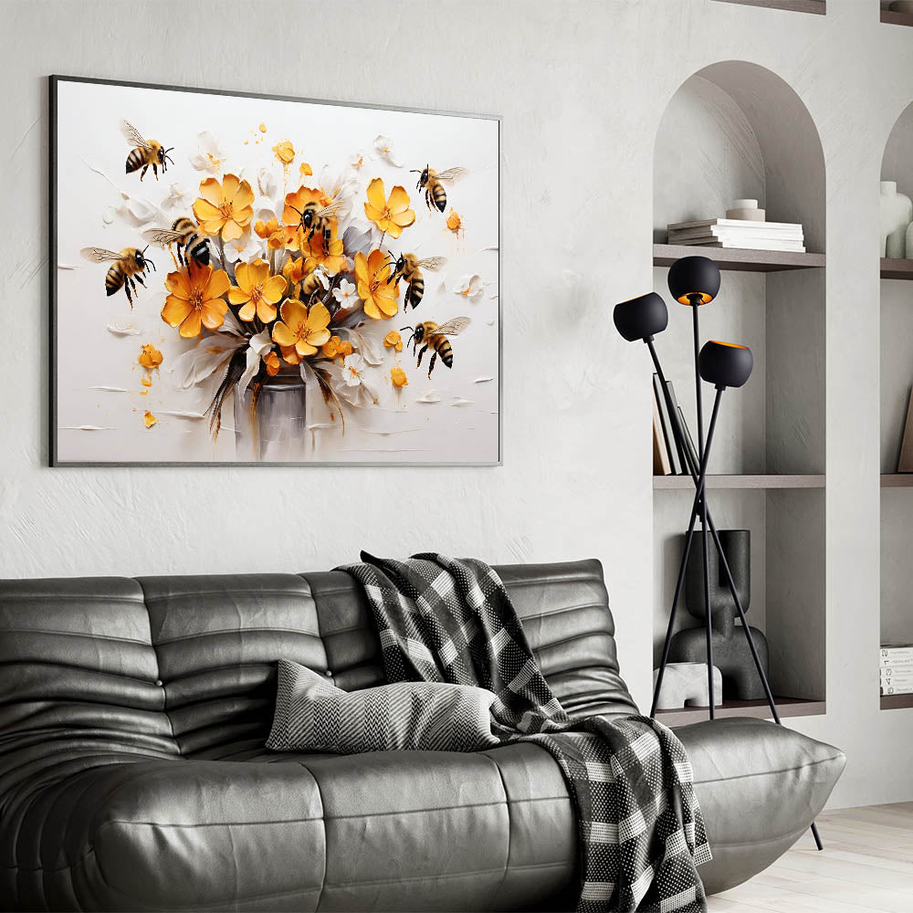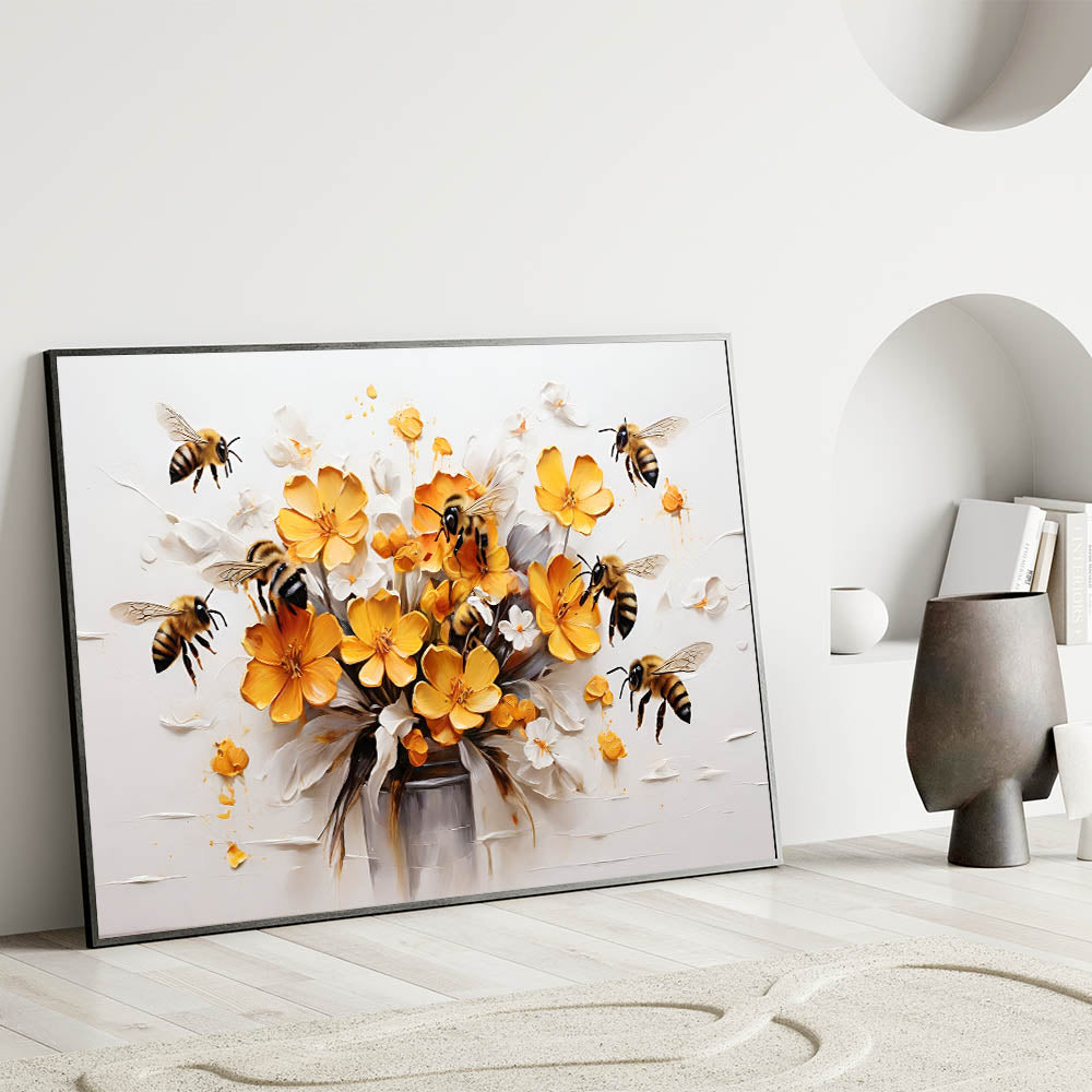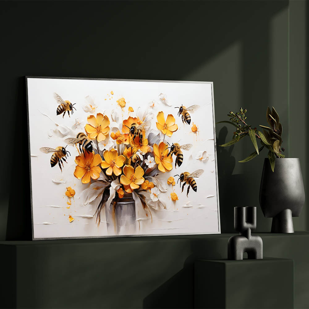 This vibrant bee canvas print captures the lively essence of nature, with beautifully detailed bees buzzing around a bouquet of bright yellow and white flowers. The rich colors and dynamic composition make this artwork a perfect choice for anyone looking to bring a touch of the outdoors into their home. The soft background allows the bright floral elements and the bees to stand out, creating a warm and inviting atmosphere in any room.