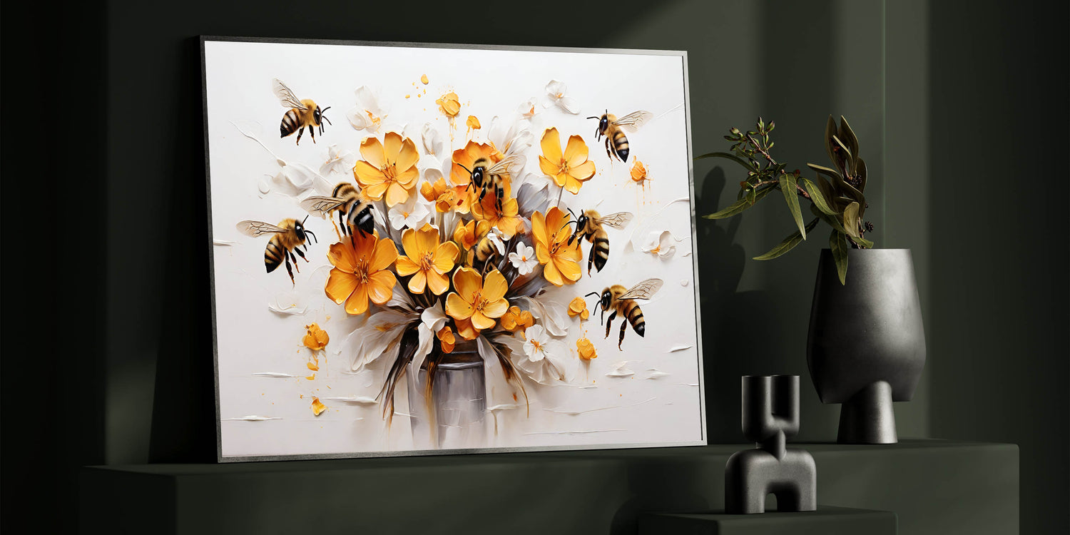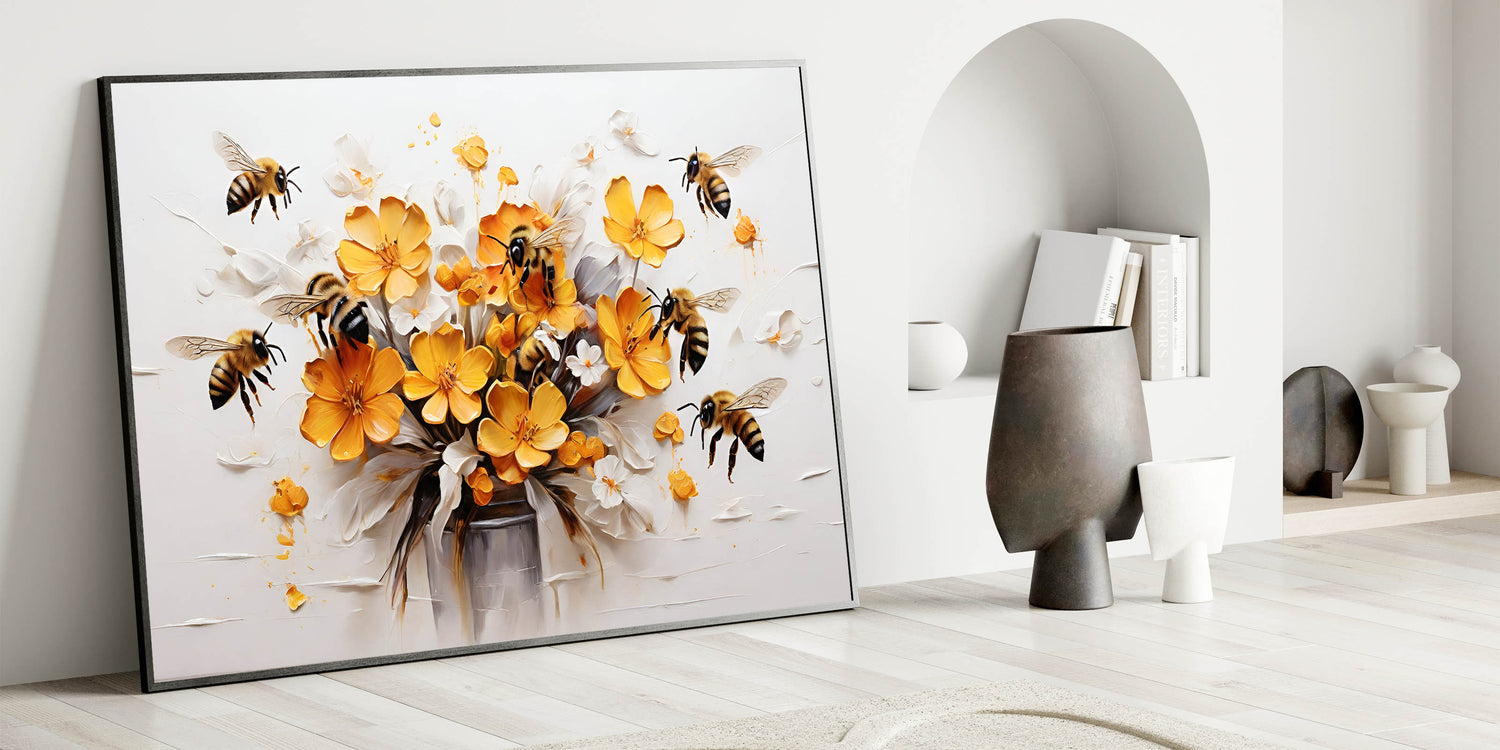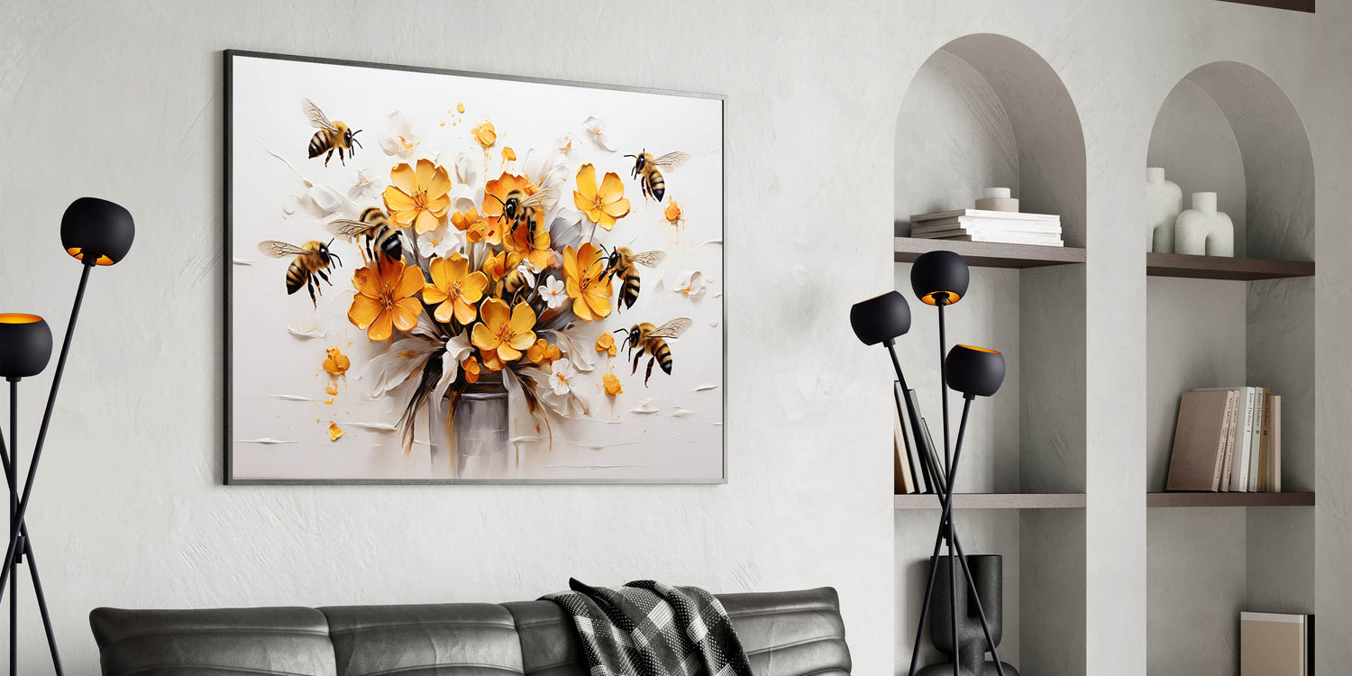 This vibrant bee canvas print captures the lively essence of nature, with beautifully detailed bees buzzing around a bouquet of bright yellow and white flowers. The rich colors and dynamic composition make this artwork a perfect choice for anyone looking to bring a touch of the outdoors into their home. The soft background allows the bright floral elements and the bees to stand out, creating a warm and inviting atmosphere in any room.