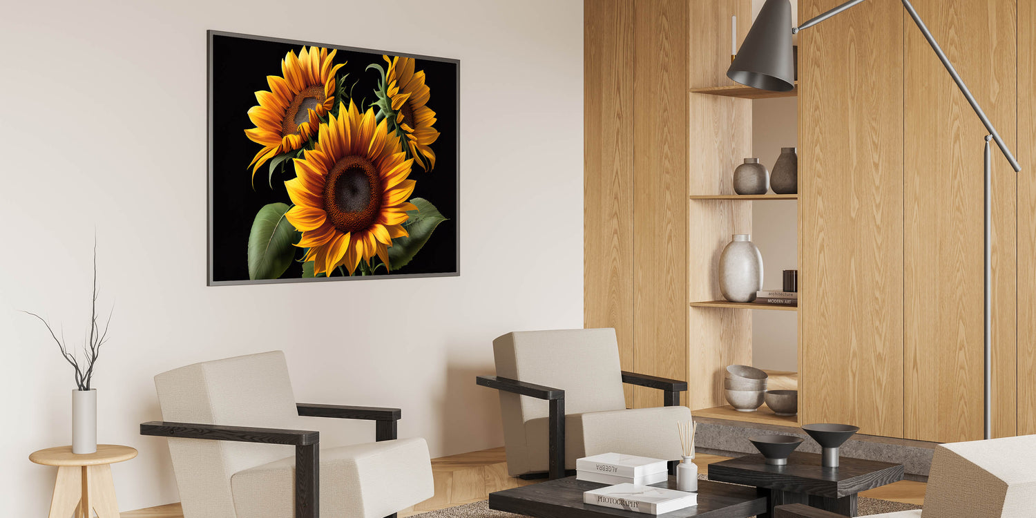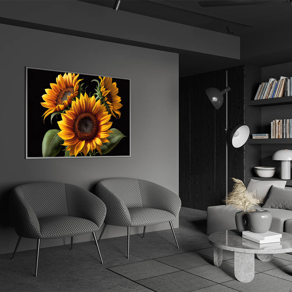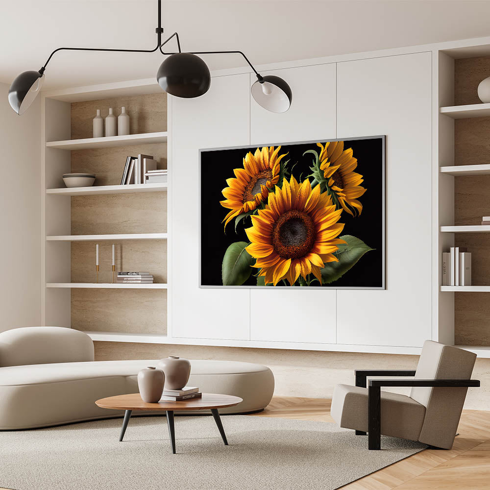 Brighten up your space with this bold and vibrant sunflower trio wall art. Featuring three striking sunflowers in vivid orange and yellow hues, this canvas print brings the beauty of nature indoors. The dark background enhances the sunflowers’ brilliant colors, making them stand out as a captivating focal point in any room. Perfect for adding warmth and energy to your living room, bedroom, or office, this sunflower artwork offers a timeless design that complements both modern and traditional decor.