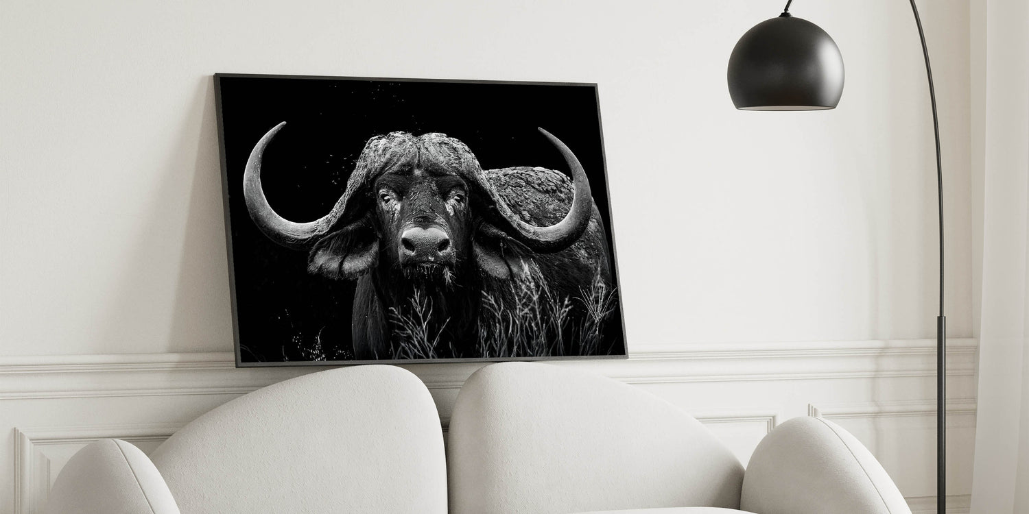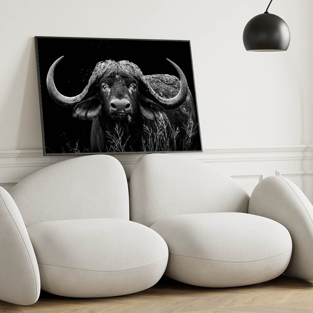 Add a bold touch to your decor with this stunning bison artwork. Its dramatic composition and timeless monochrome design make it an eye-catching addition to any interior.
