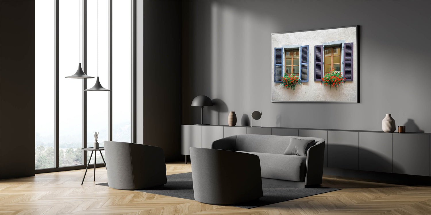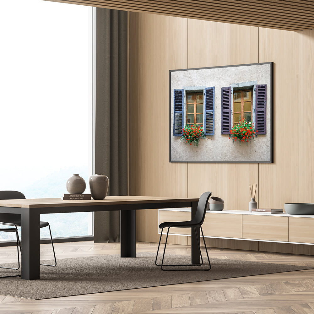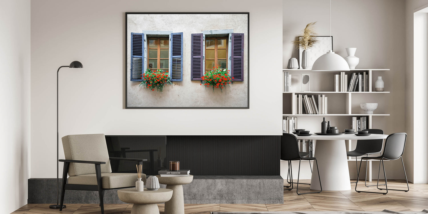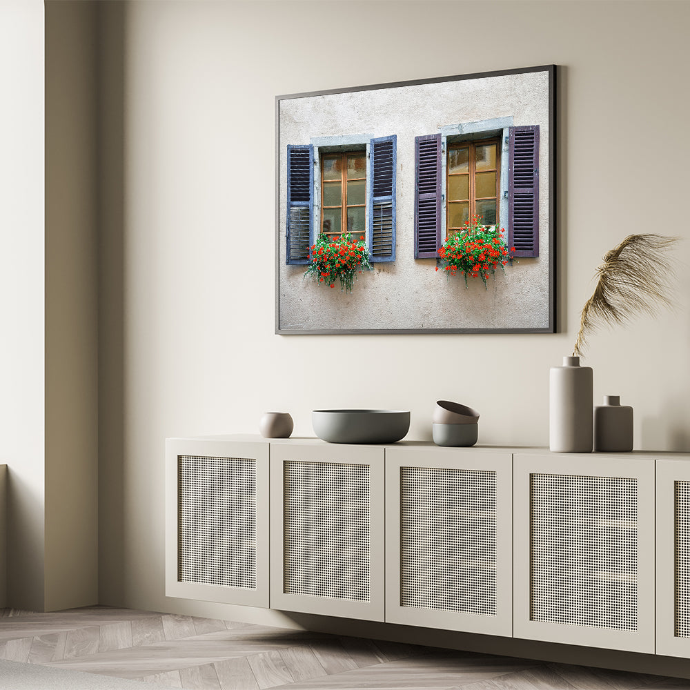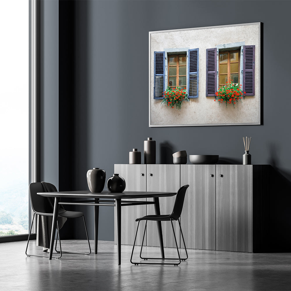 Elevate your decor with this delightful Charming Double Window with Flowers Wall Art. This captivating piece features two vintage-style windows adorned with vibrant red flowers, creating a picturesque and welcoming scene. The contrast between the weathered shutters and the bright, blooming flowers adds depth and charm, making this artwork a perfect addition to any room that needs a touch of warmth and elegance.