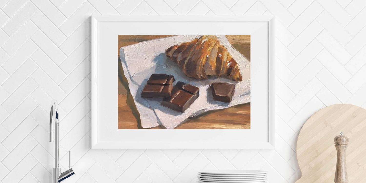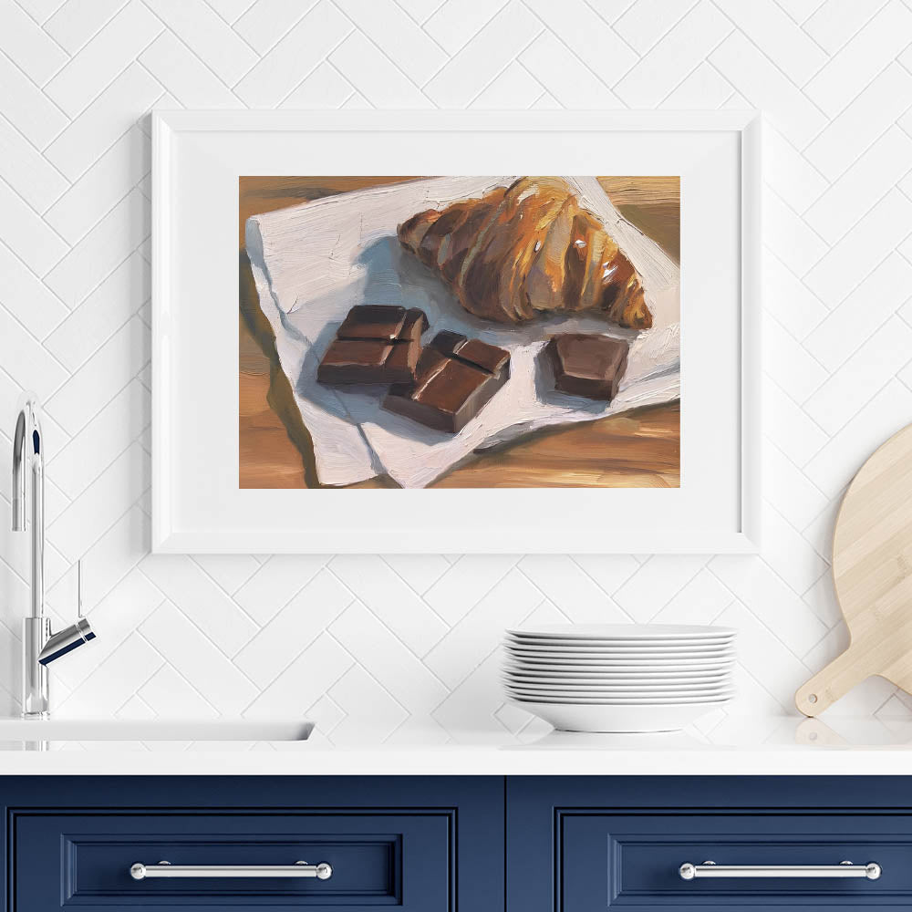 - Stunning pastry art print showcasing a chocolate croissant still life.