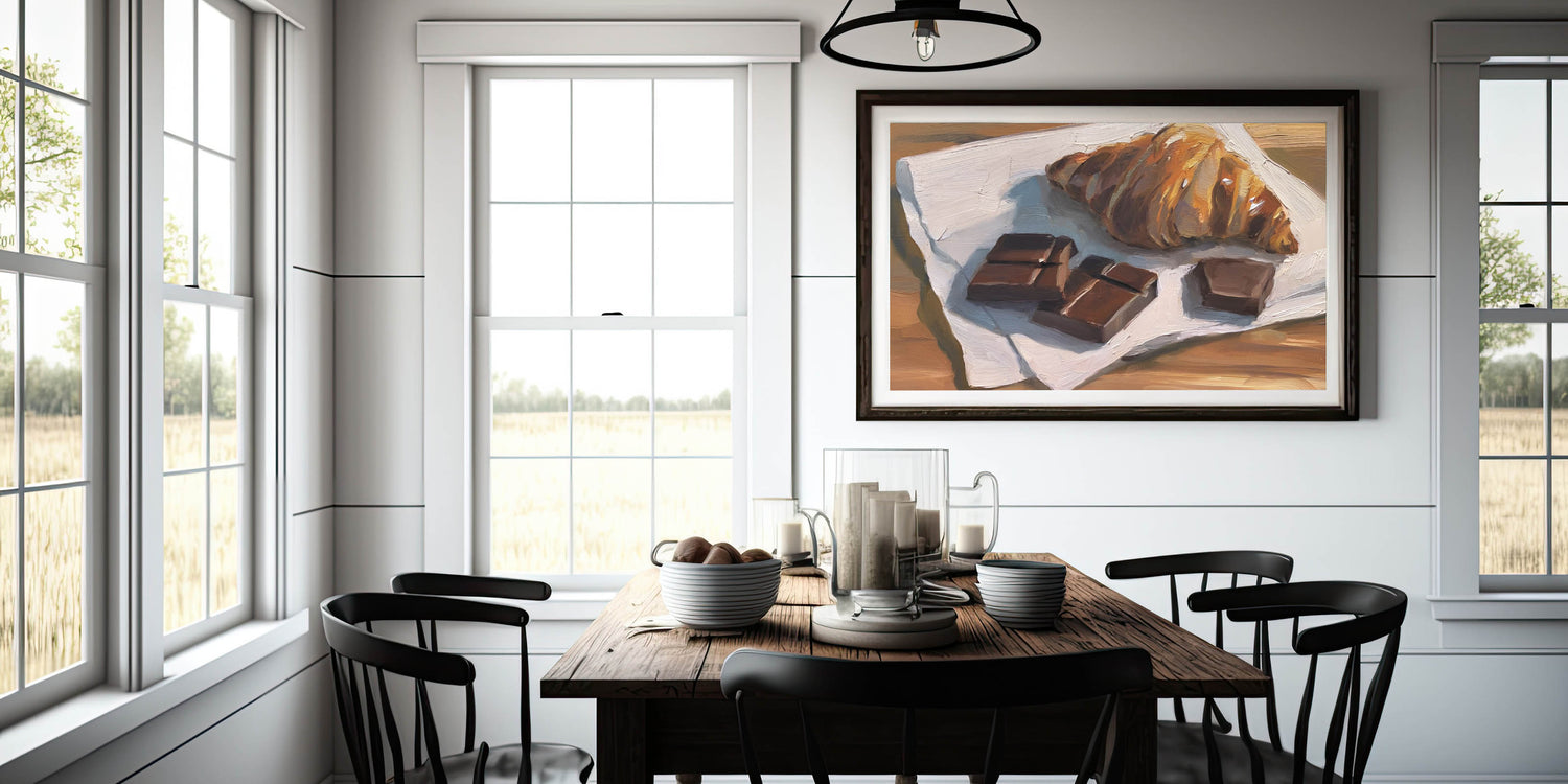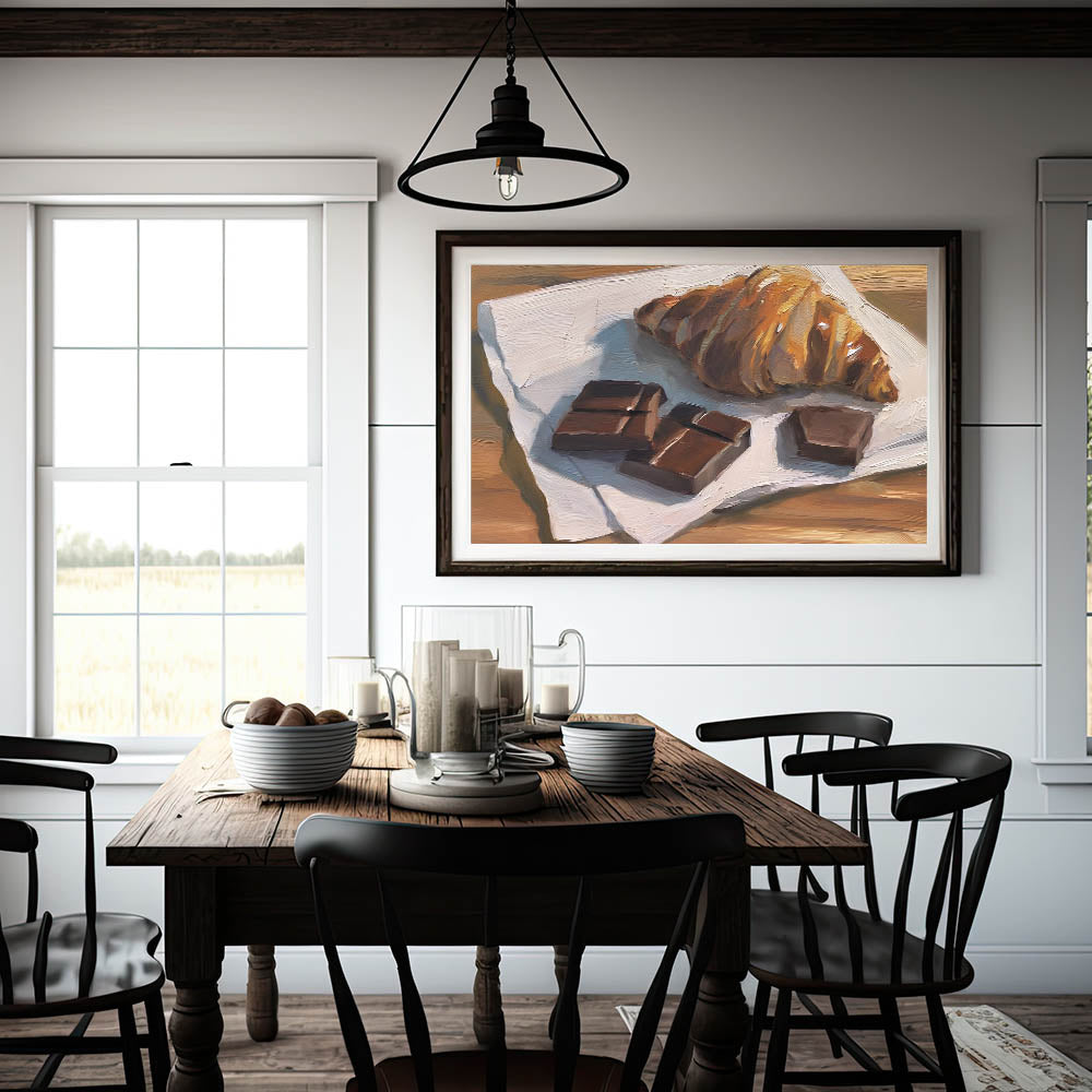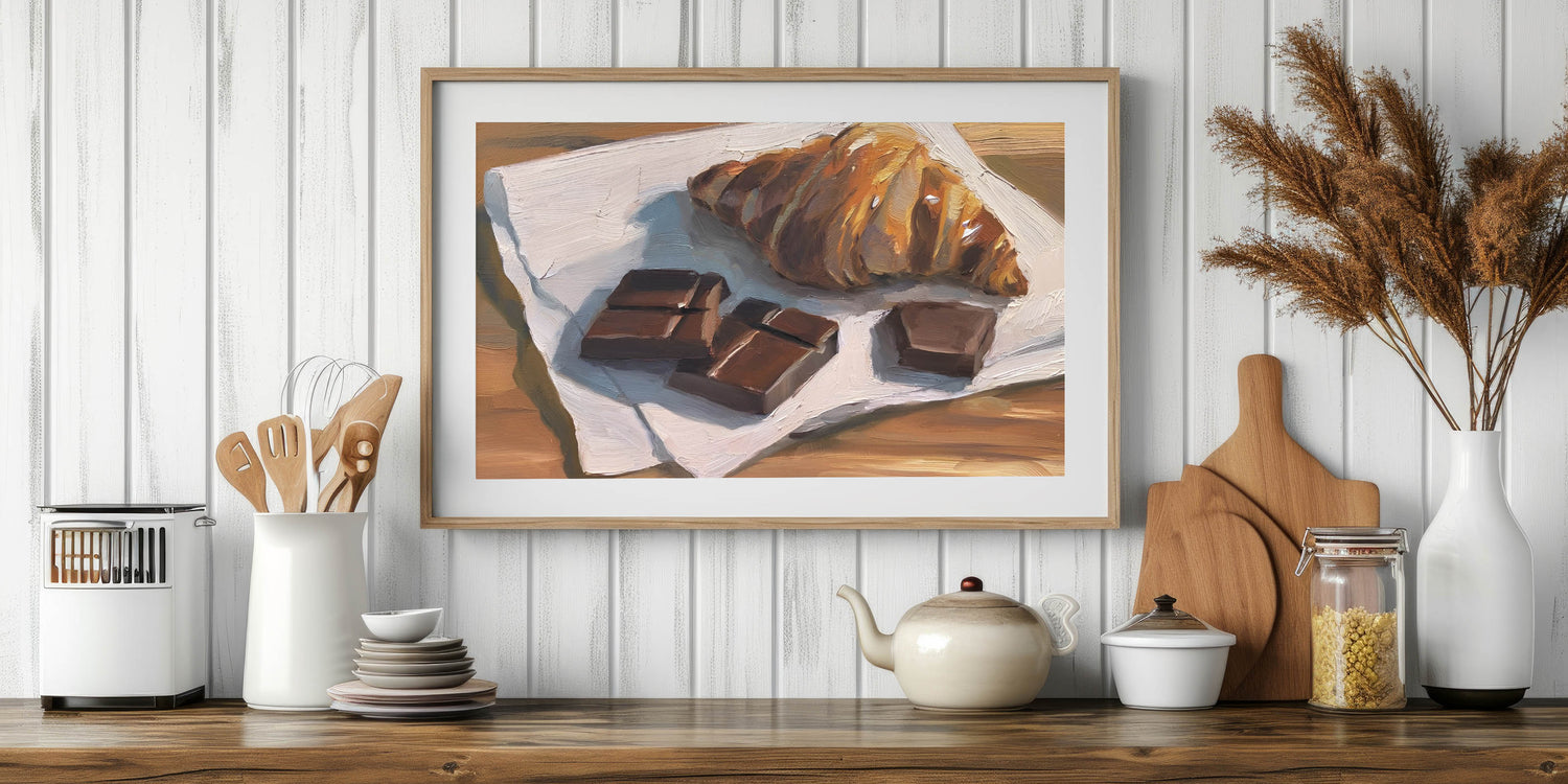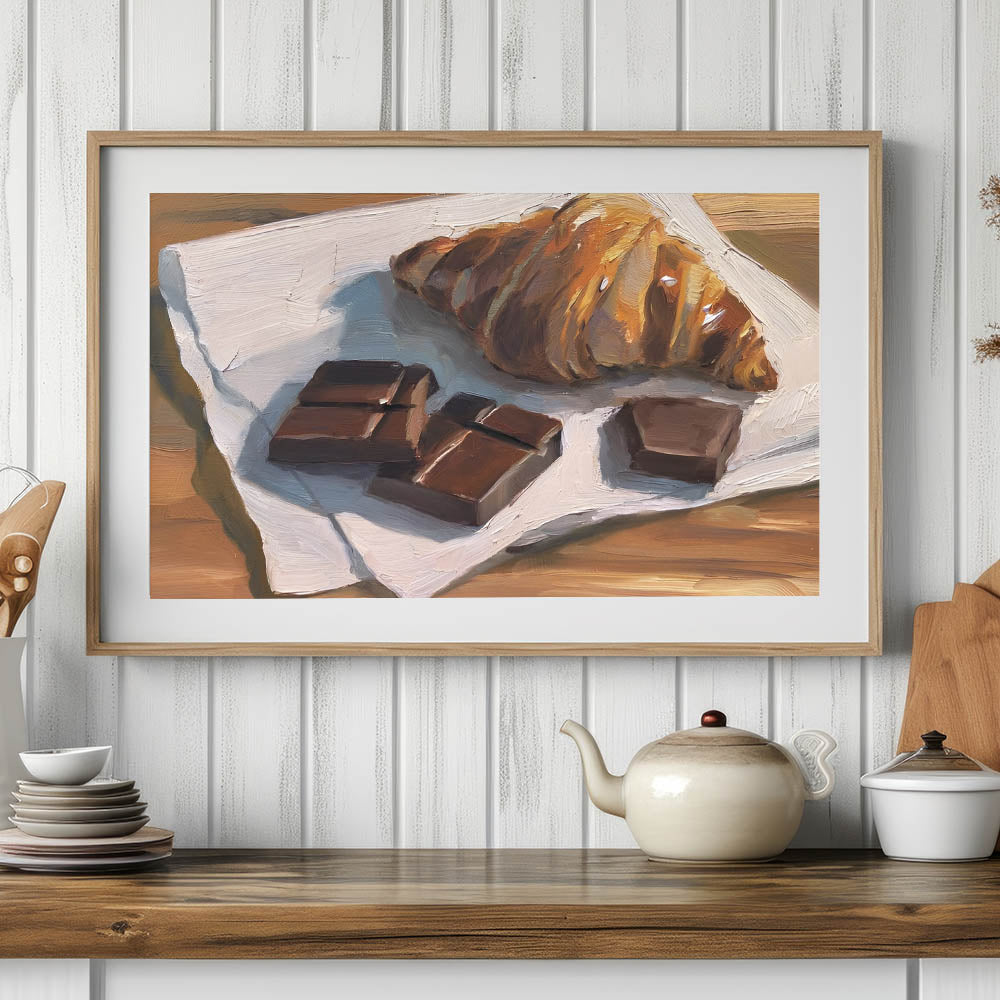 Indulge in the irresistible charm of this bakery art print, featuring a beautifully detailed oil painting of a golden, flaky croissant paired with rich chocolate pieces. The expressive brushstrokes and warm tones bring this dessert wall art to life, making it a delightful addition to kitchens, cafés, or bakeries.