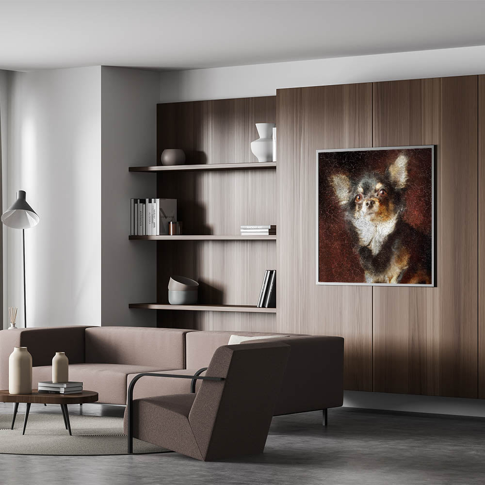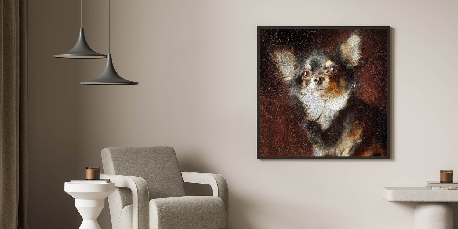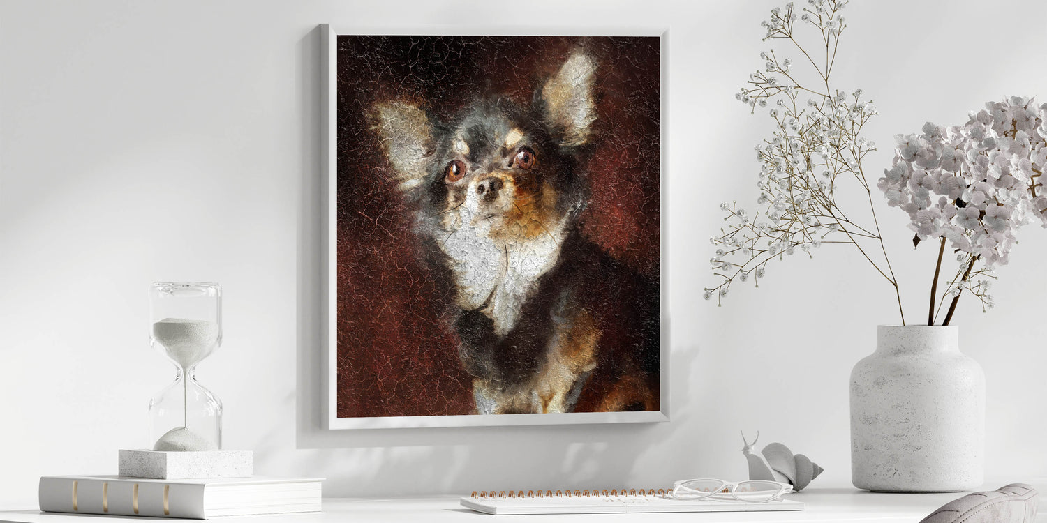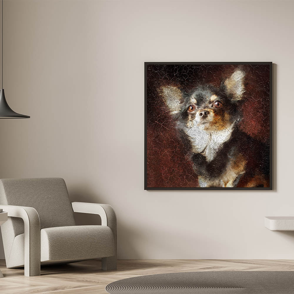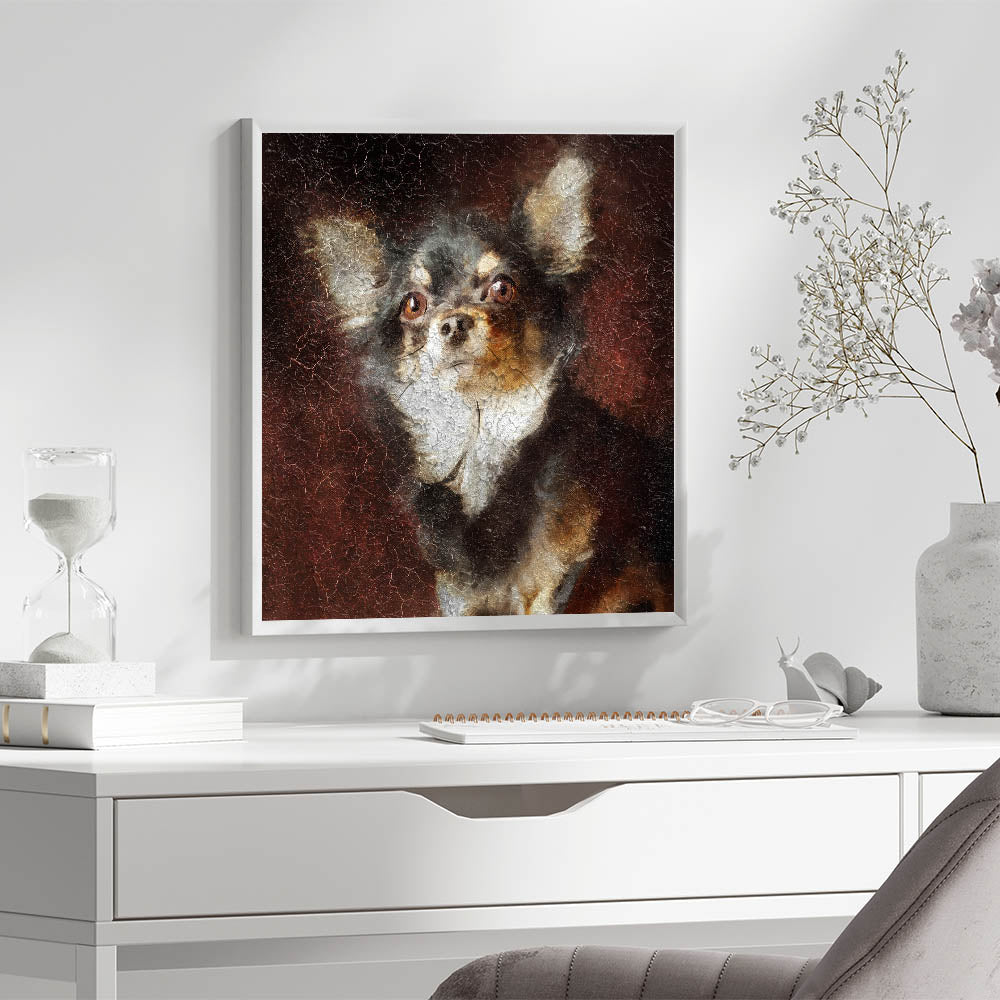 Introduce a touch of timeless elegance to your home with this classic Chihuahua painting, meticulously crafted to evoke a sense of rustic charm. The artwork showcases a beautifully detailed Chihuahua against a textured background, reminiscent of traditional oil paintings. This piece is perfect for those who appreciate the combination of antique style and the endearing qualities of the Chihuahua breed. Ideal for adding warmth and character to any space, from living rooms to cozy study areas.