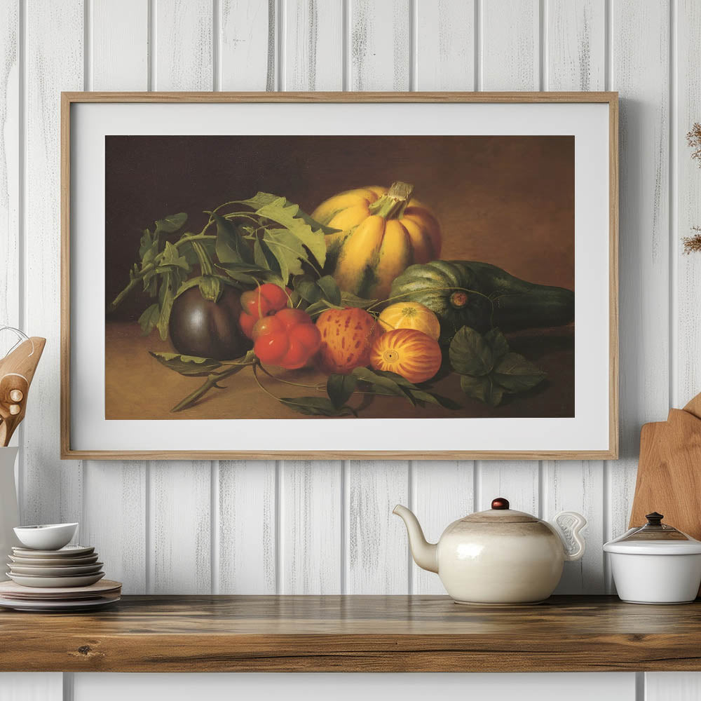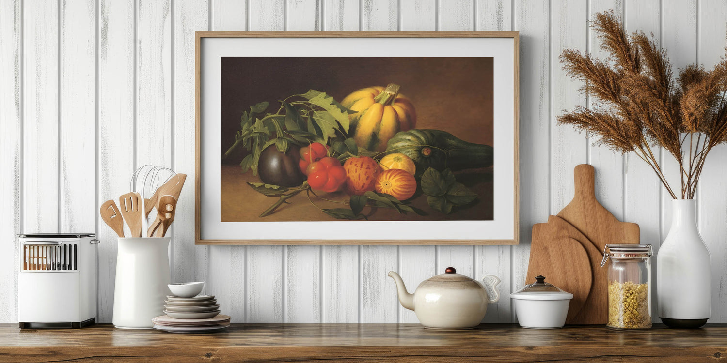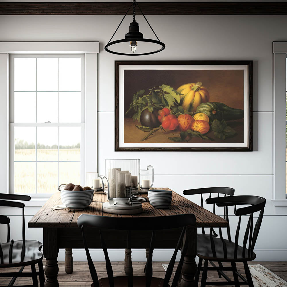 Add a touch of timeless elegance to your kitchen with this fruit-themed wall art, a beautifully detailed still-life painting featuring fresh pumpkins, tomatoes, eggplants, and leafy greens. The rich earthy tones of brown, green, and orange evoke a rustic charm, making this fruit still life art perfect for farmhouse-style kitchens, dining areas, and cafés.