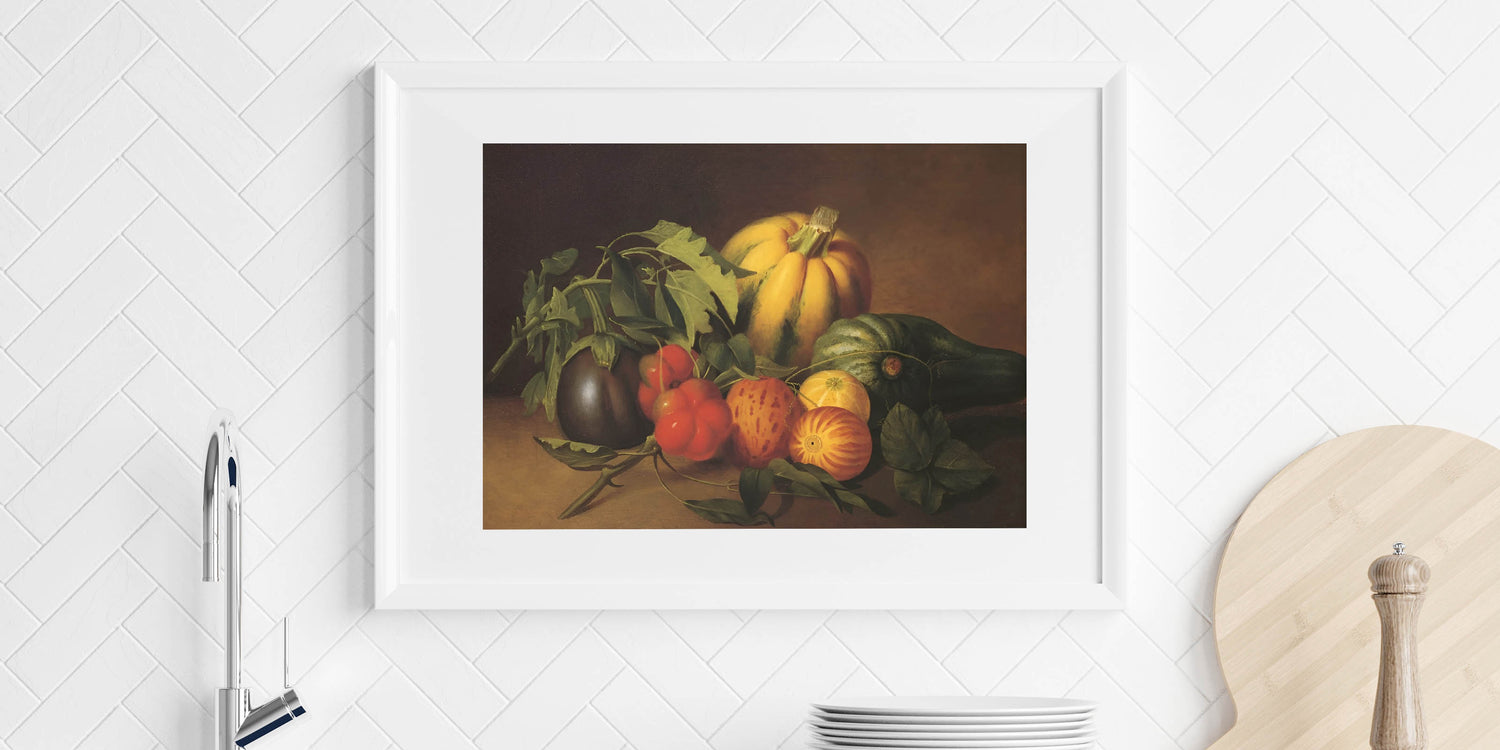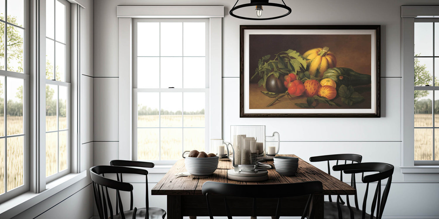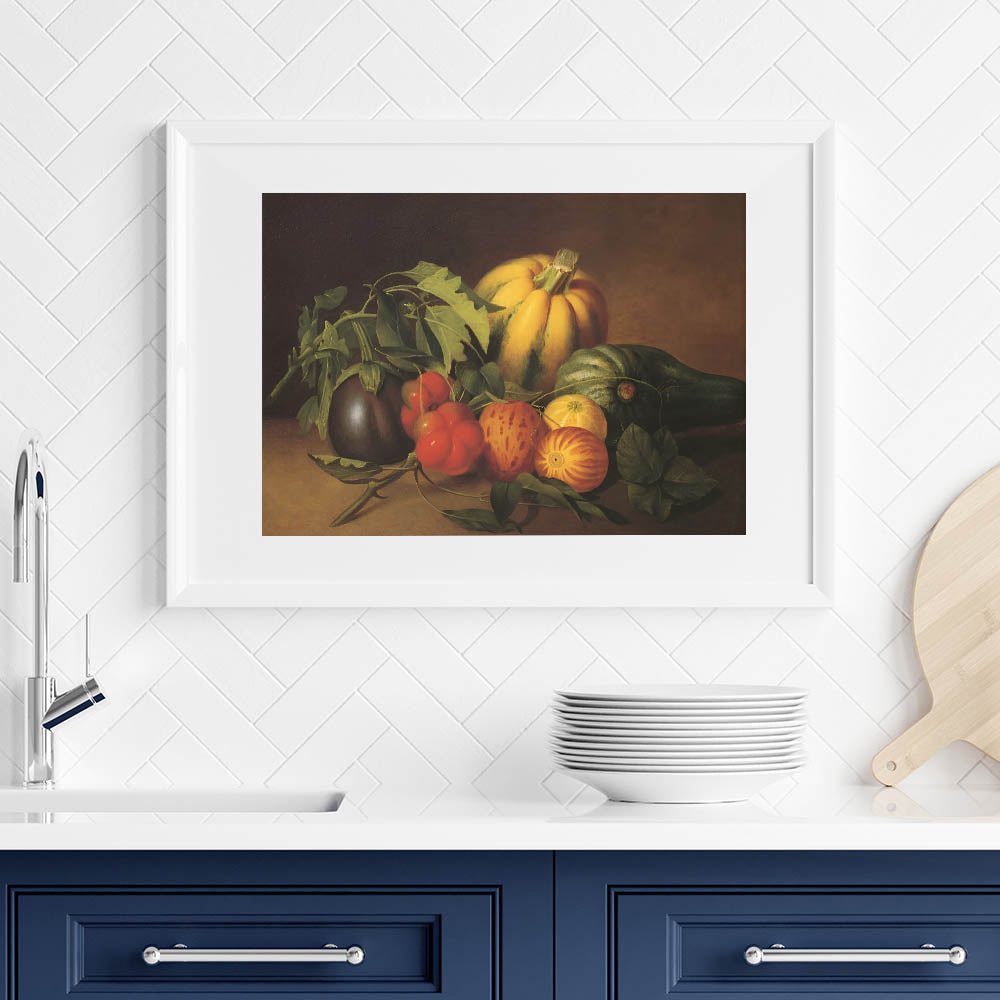 Add a touch of timeless elegance to your kitchen with this fruit-themed wall art, a beautifully detailed still-life painting featuring fresh pumpkins, tomatoes, eggplants, and leafy greens. The rich earthy tones of brown, green, and orange evoke a rustic charm, making this fruit still life art perfect for farmhouse-style kitchens, dining areas, and cafés.