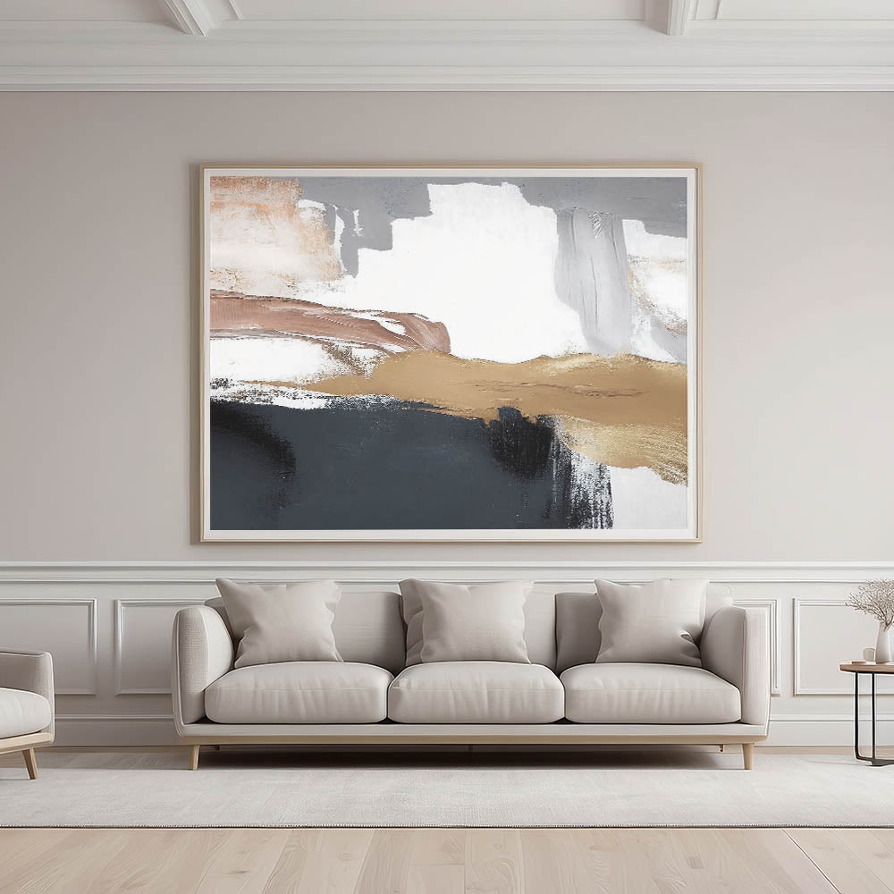 Bring modern elegance to your space with this Contemporary Abstract Strokes and Lines Art. This striking piece features a sophisticated blend of beige, gold, and black brush strokes, creating a dynamic and visually appealing composition. The soft, neutral tones are beautifully contrasted by bold, dark accents, making it an ideal choice for those who appreciate refined yet impactful artwork.
