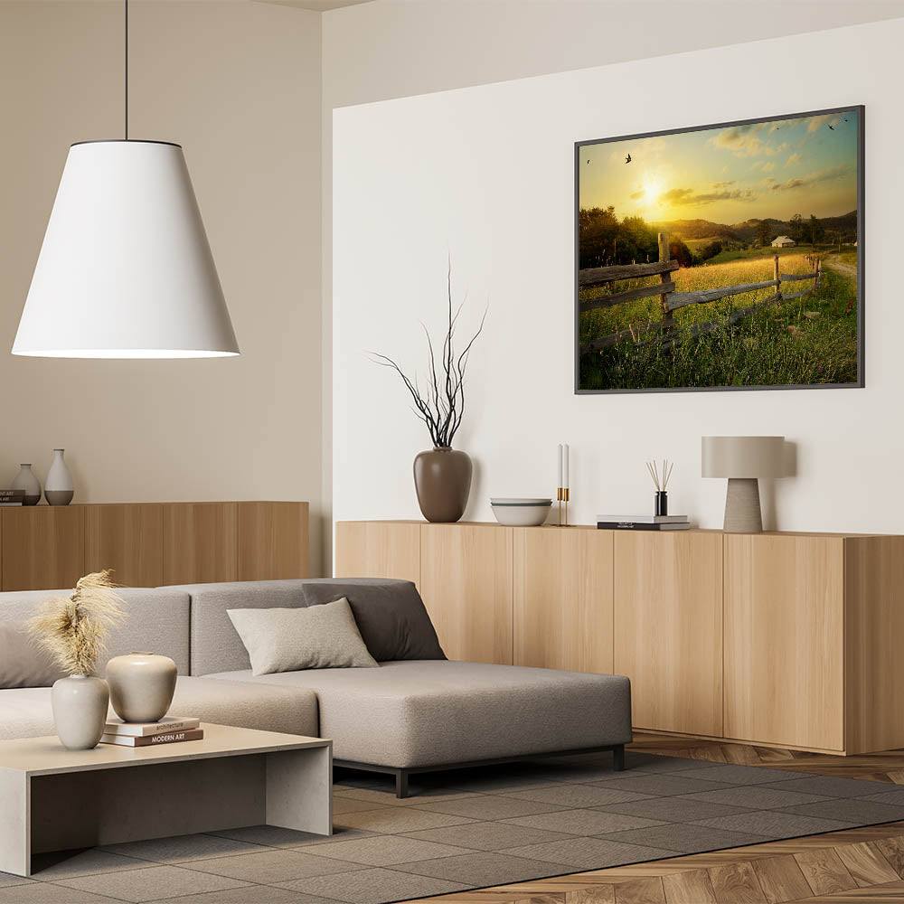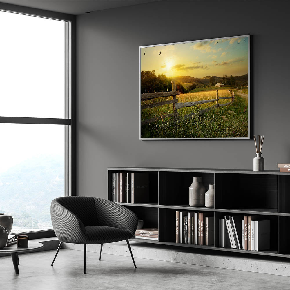 Immerse yourself in the tranquil beauty of rural life with this Countryside Sunset Wall Art, showcasing a serene scene of a rustic wooden fence bordering a sunlit meadow at dusk. The warm golden hues of the setting sun cast a soft glow over the rolling hills and distant trees, creating a peaceful atmosphere that invites you to relax and unwind. The detailed texture of the weathered fence adds a touch of rustic charm, making this artwork a perfect addition to any space that seeks to capture the simplicity and beauty of the countryside.