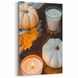 Embrace the warmth and charm of fall with this fall wall art, featuring a cozy autumn still life of white and beige pumpkins, glowing candles, and a crisp autumn leaf. The harmonious blend of creamy whites, warm orange, and soft beige creates a welcoming and peaceful seasonal ambiance. This autumn canvas art is perfect for anyone who loves rustic elegance and cozy fall decor.