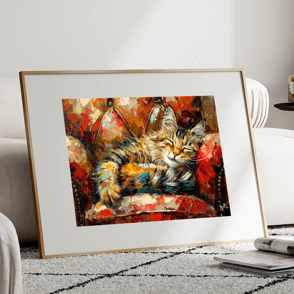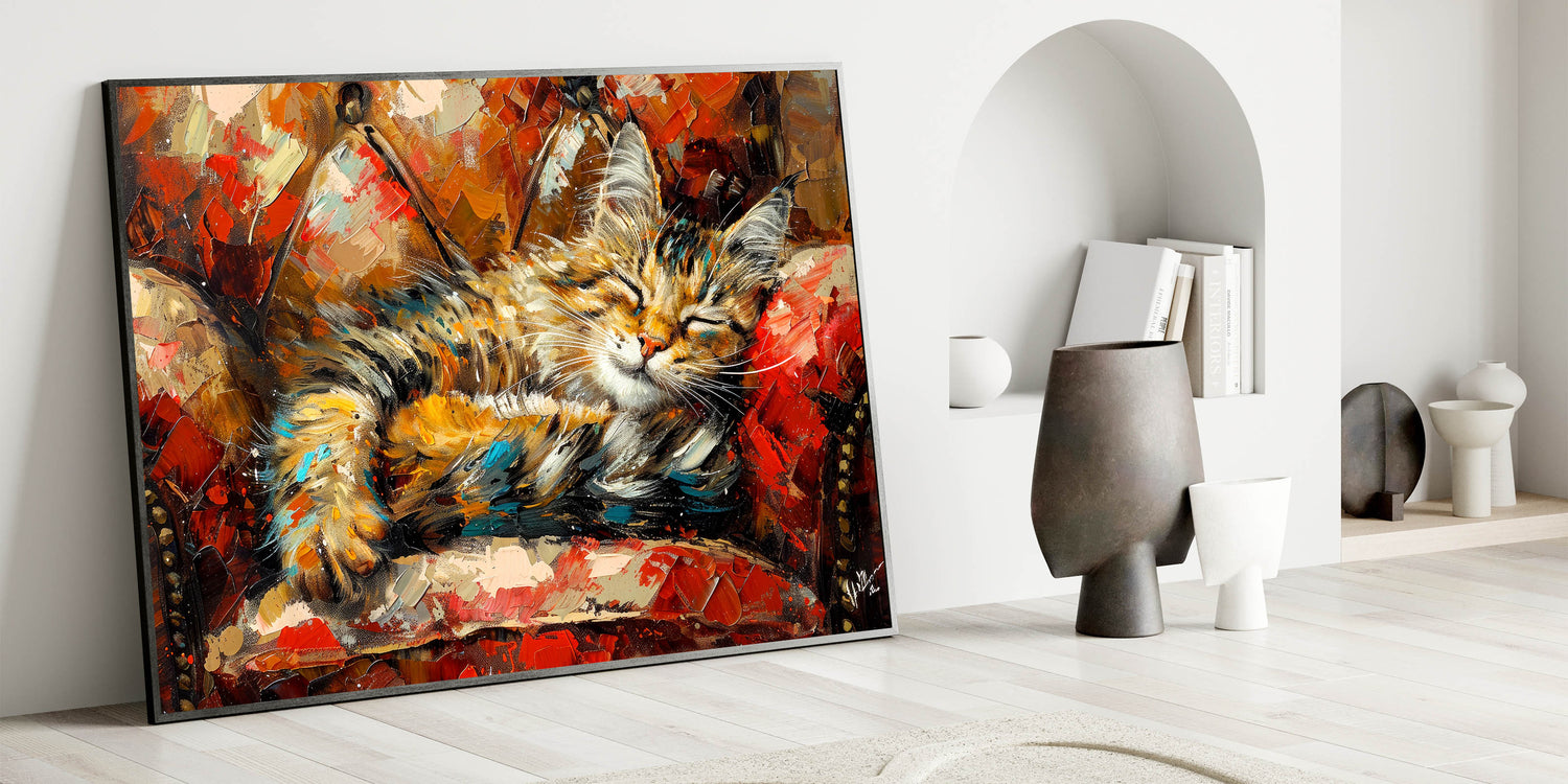 Add warmth and charm to your home with this delightful painting of a sleeping cat nestled in vibrant, cozy surroundings. The artwork captures the essence of comfort with its rich palette of warm reds, oranges, and browns, combined with touches of teal and gold. The expressive brushstrokes bring life to the scene, making it an ideal piece for creating a welcoming atmosphere in any room.