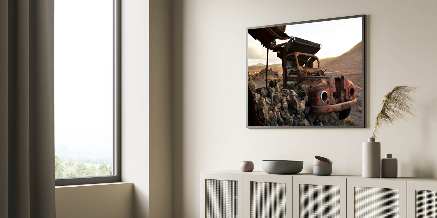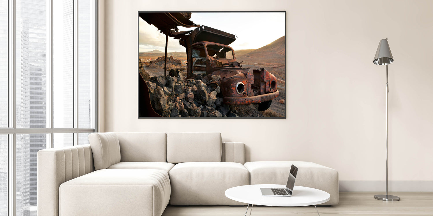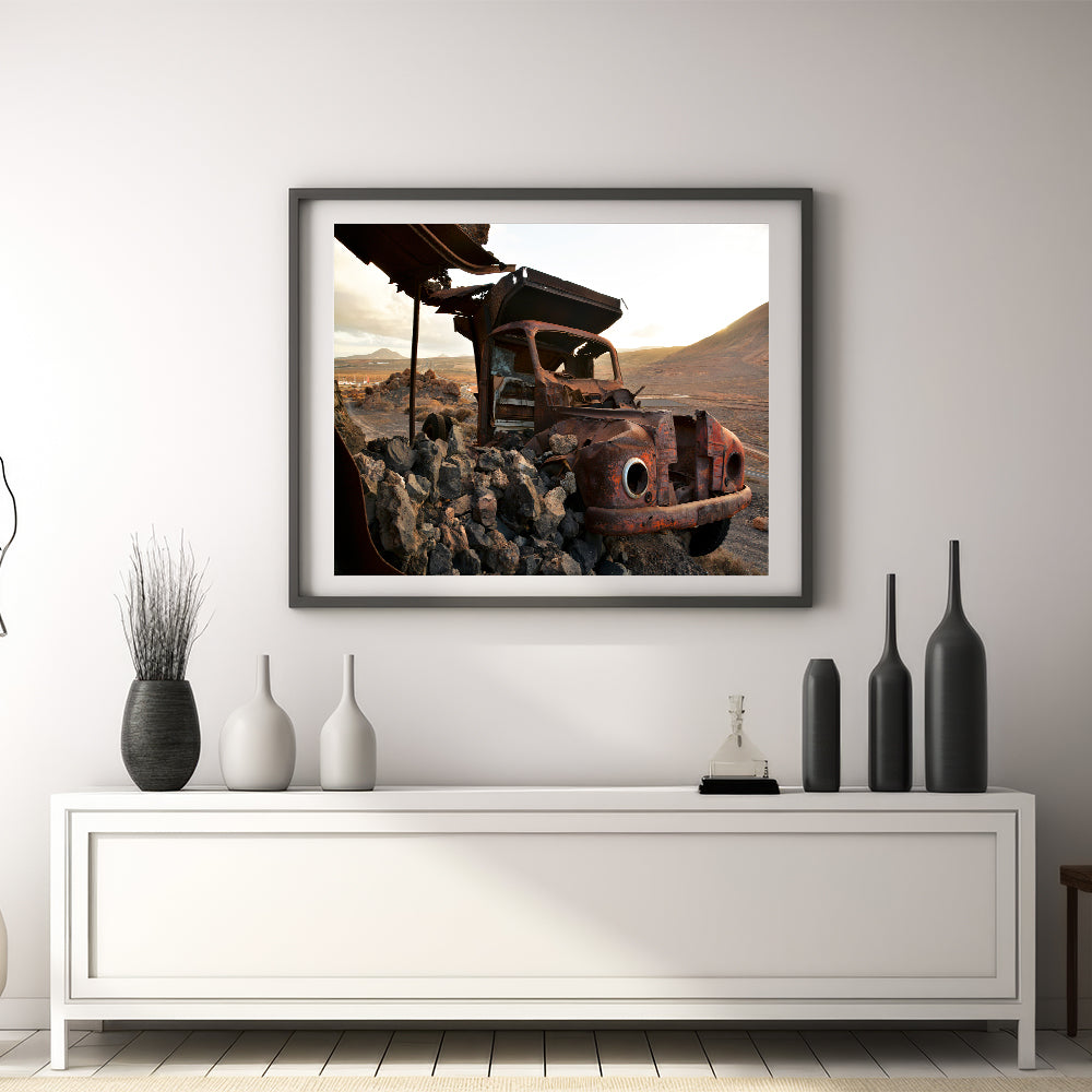 Transform your space with this striking piece of dereliction wall art featuring a rusted, abandoned truck amidst a barren desert landscape. This captivating scene of urban decay captures the haunting beauty of forgotten places, perfect for adding a touch of mystery and history to your decor.