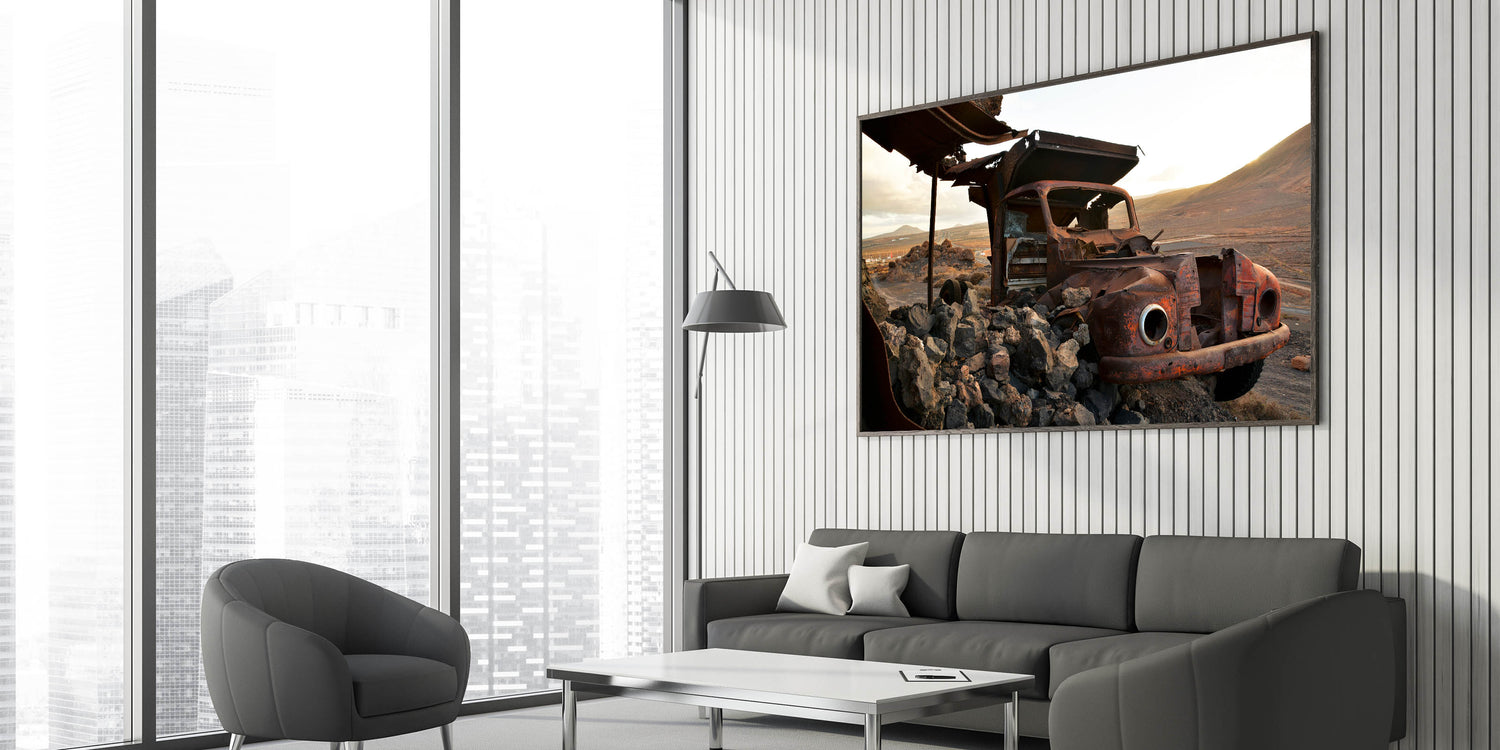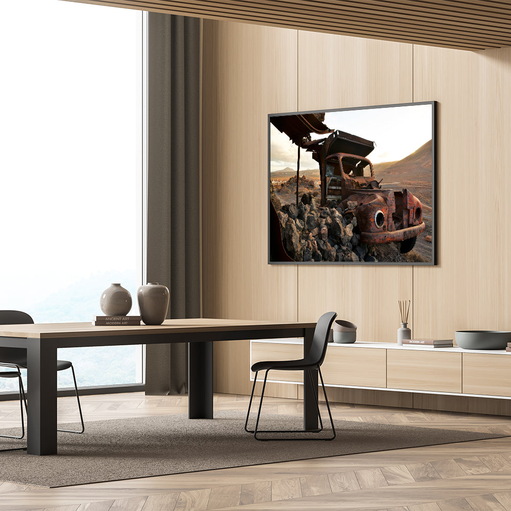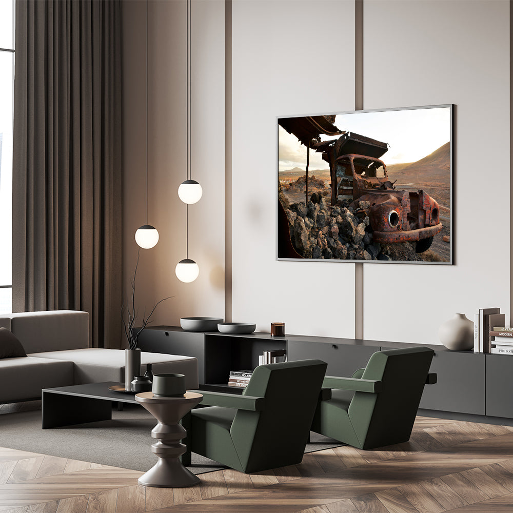 Transform your space with this striking piece of dereliction wall art featuring a rusted, abandoned truck amidst a barren desert landscape. This captivating scene of urban decay captures the haunting beauty of forgotten places, perfect for adding a touch of mystery and history to your decor.