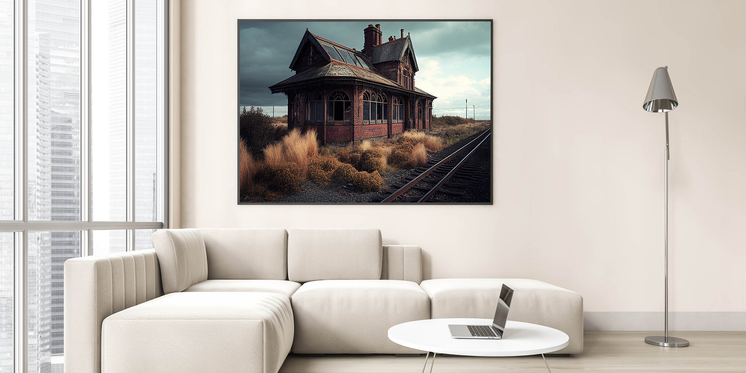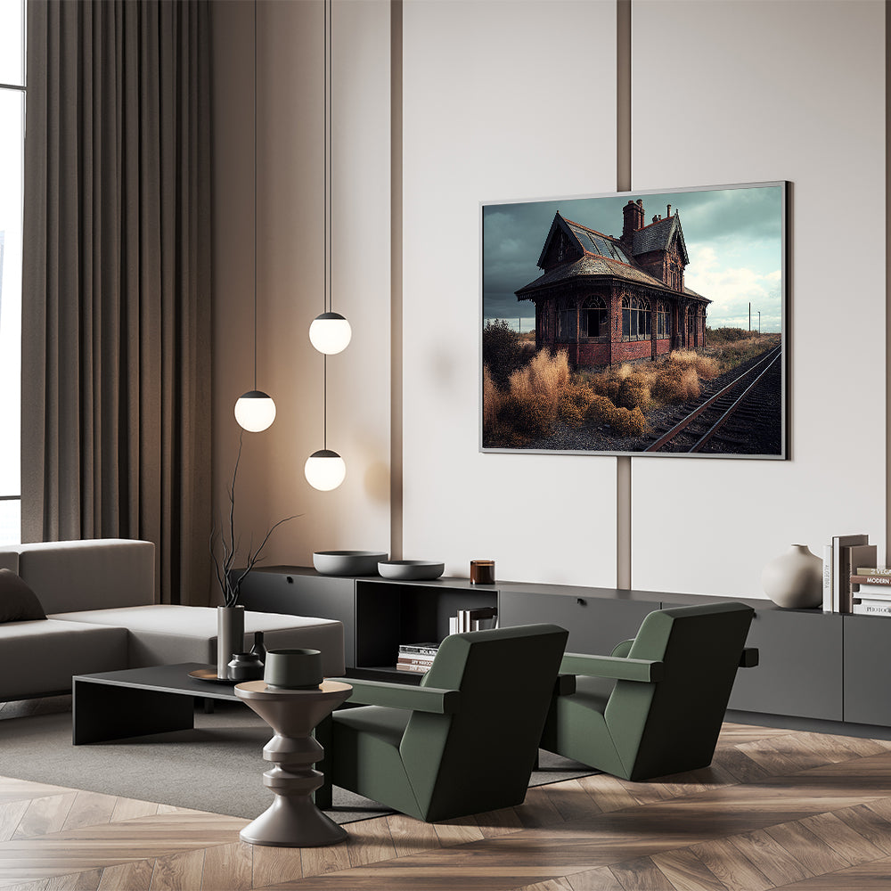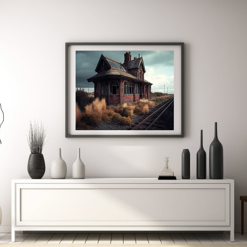 Transport your space to a bygone era with this captivating piece of dereliction wall art, featuring an abandoned Victorian-era train station. The rich, weathered brickwork and ornate architectural details stand in stark contrast to the overgrown tracks and desolate surroundings, telling a story of a once-bustling hub now left to the passage of time. This artwork perfectly captures the haunting beauty of urban decay, making it an ideal addition for those who appreciate the charm of forgotten places.