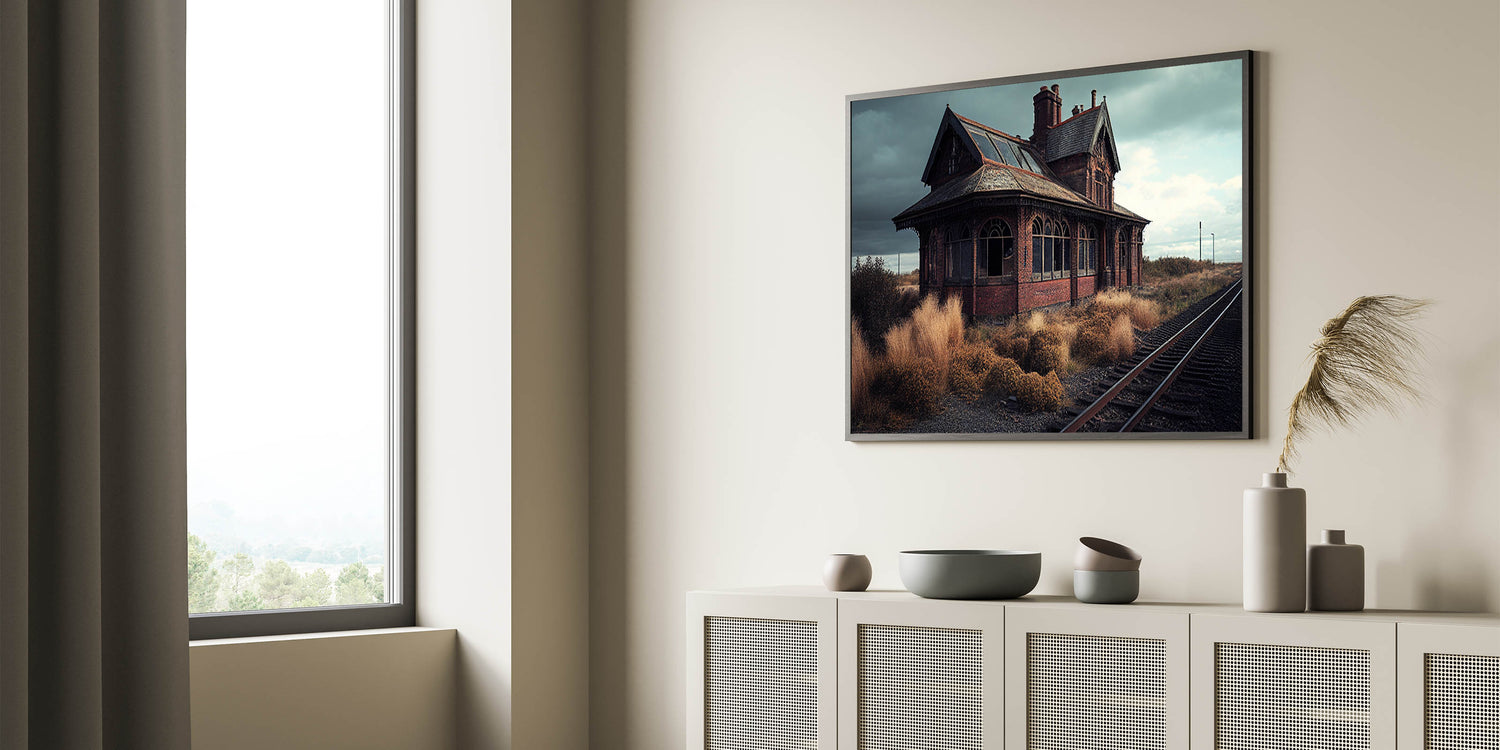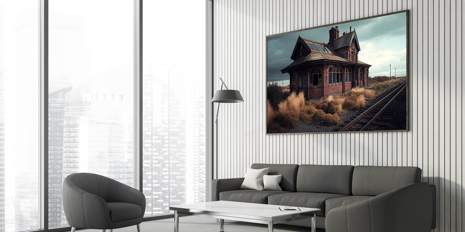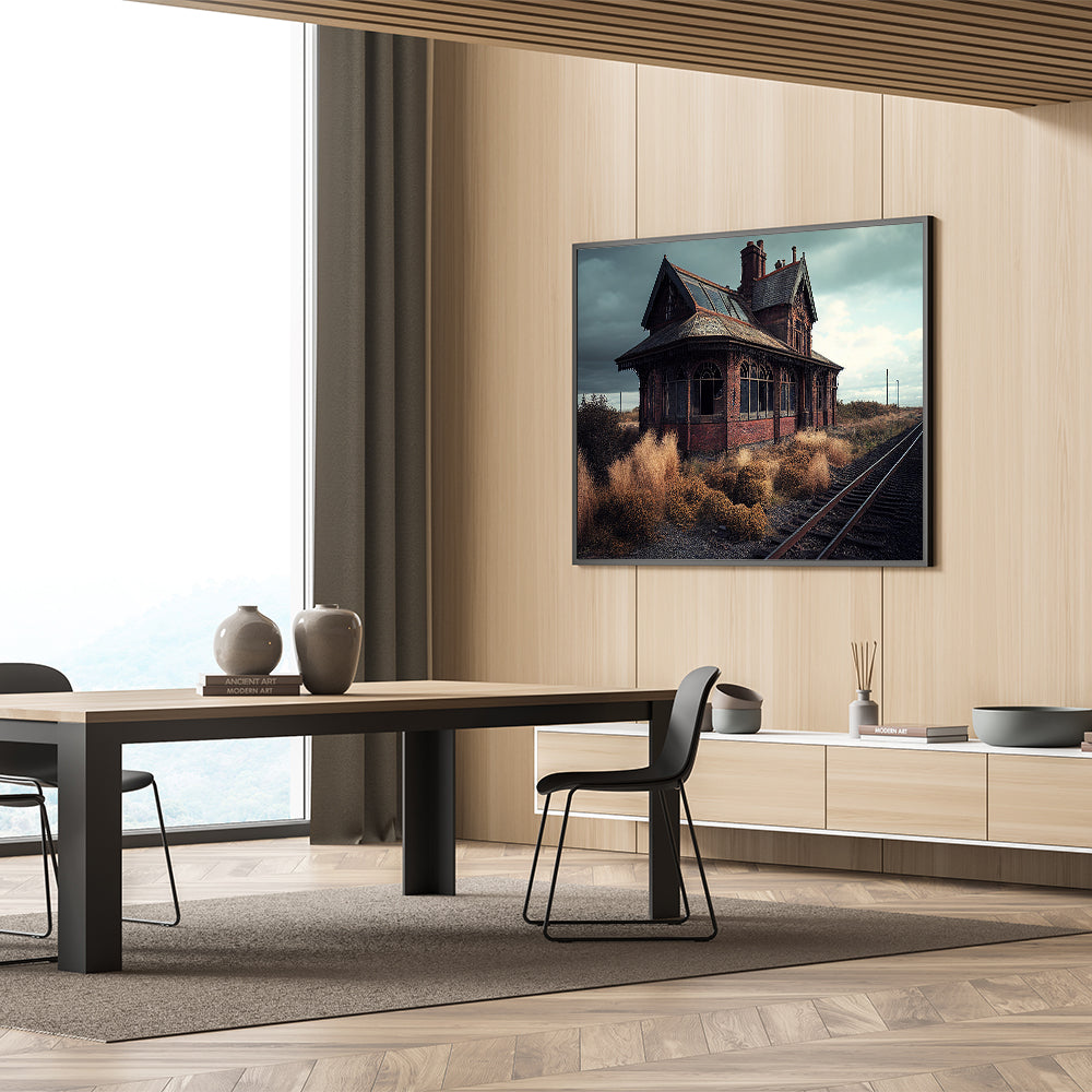 Transport your space to a bygone era with this captivating piece of dereliction wall art, featuring an abandoned Victorian-era train station. The rich, weathered brickwork and ornate architectural details stand in stark contrast to the overgrown tracks and desolate surroundings, telling a story of a once-bustling hub now left to the passage of time. This artwork perfectly captures the haunting beauty of urban decay, making it an ideal addition for those who appreciate the charm of forgotten places.