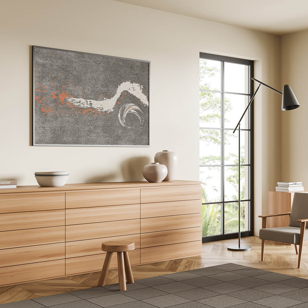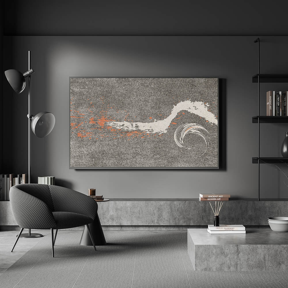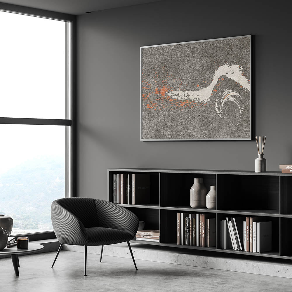 Introduce a sense of movement and creativity to your space with this dynamic abstract art piece featuring flowing brush strokes on canvas. The artwork captures the essence of motion with its sweeping lines and vibrant splashes of orange against a textured grey background. Perfect for adding a bold statement to your living room, bedroom, or office, this art piece enhances any environment with its energetic and artistic flair.