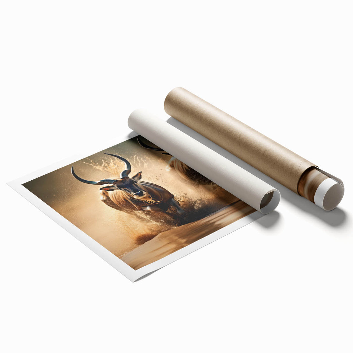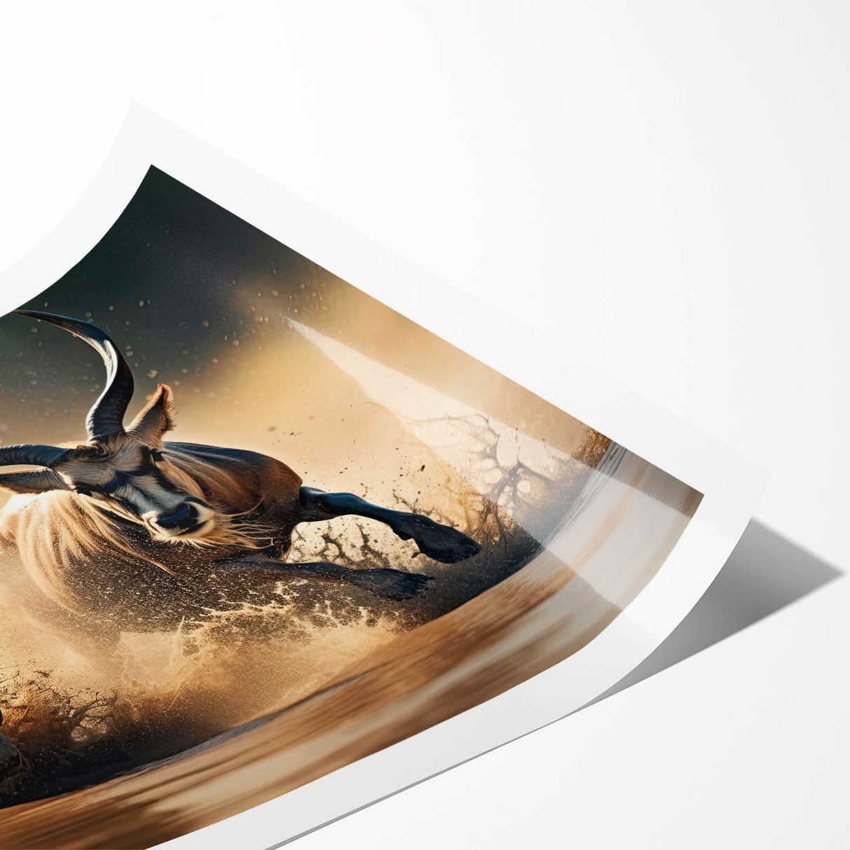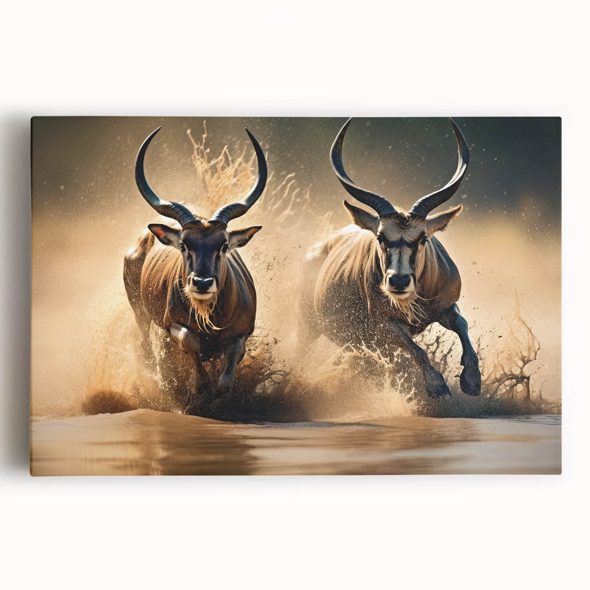 Capture the raw energy and power of the wild with this Dynamic Antelope Duo in Motion wall art. This striking piece features two powerful antelopes charging through the water, their muscular forms and intense expressions expertly captured in vivid detail. The splashing water and motion create a dynamic and exhilarating composition that brings the untamed spirit of the African wilderness into your space.
